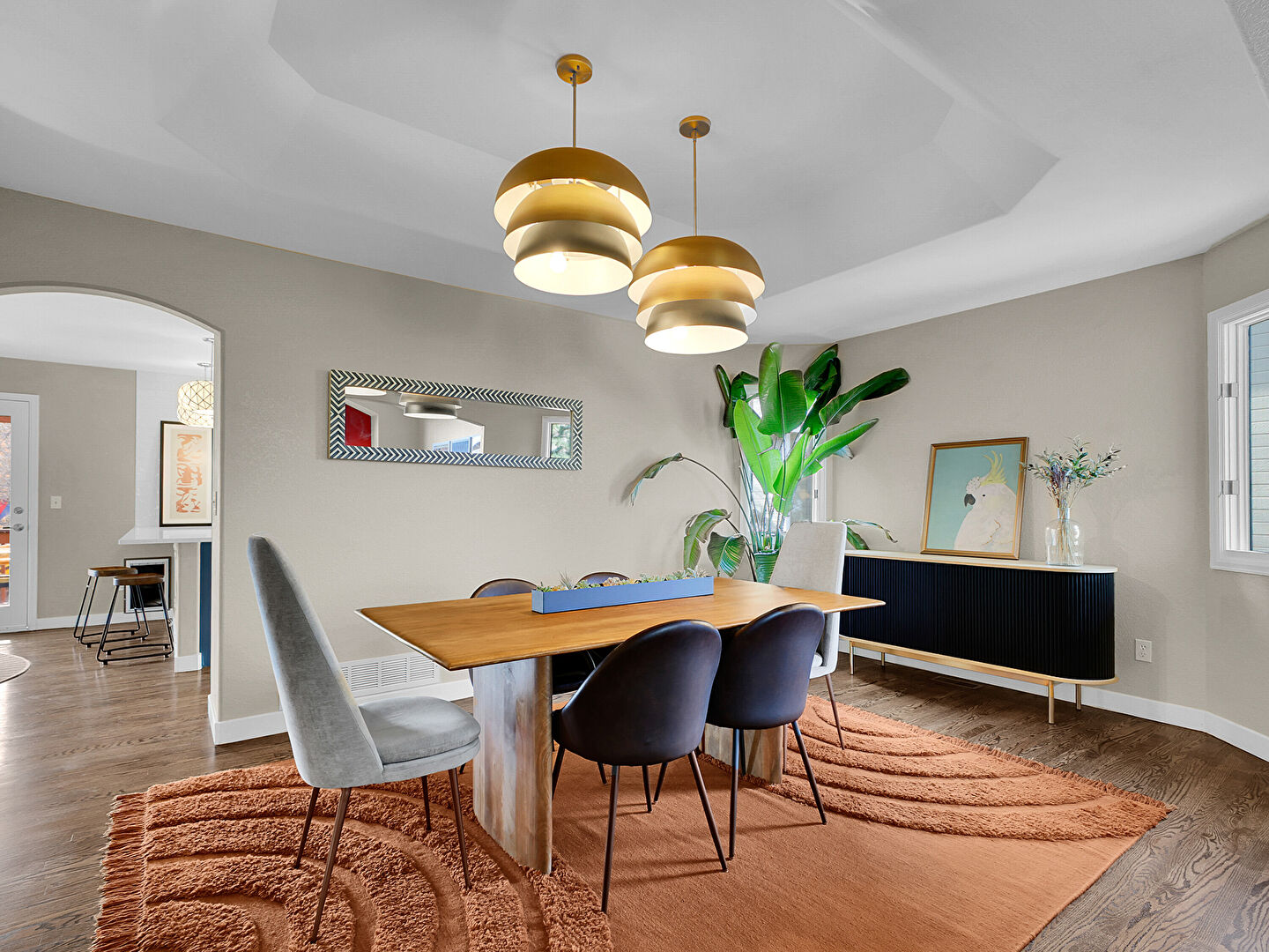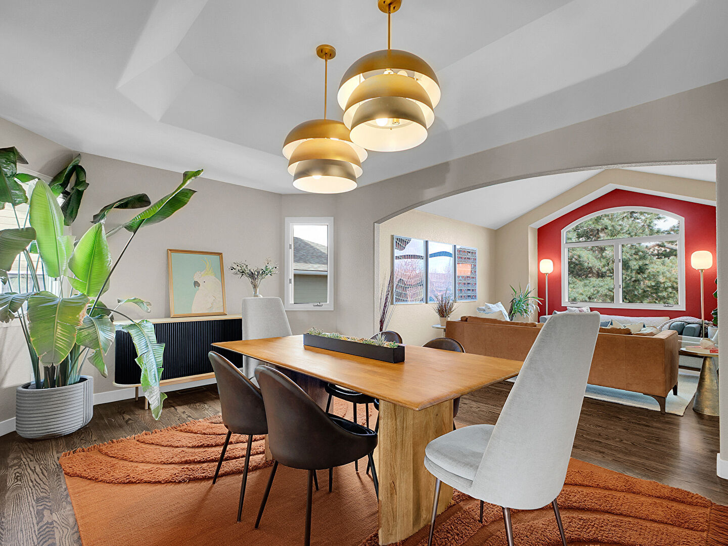 Accent Wall, Arched Walkways, Baseboards Wall, Drywall, Fireplace, G Shaped Kitchen, Natural Light, Recessed Lighting, Tray Ceiling, Vaulted Ceiling, Vent, Wallpaper Wall, Wood Finish Floor, Arched Walkways, Natural Light, Vent
