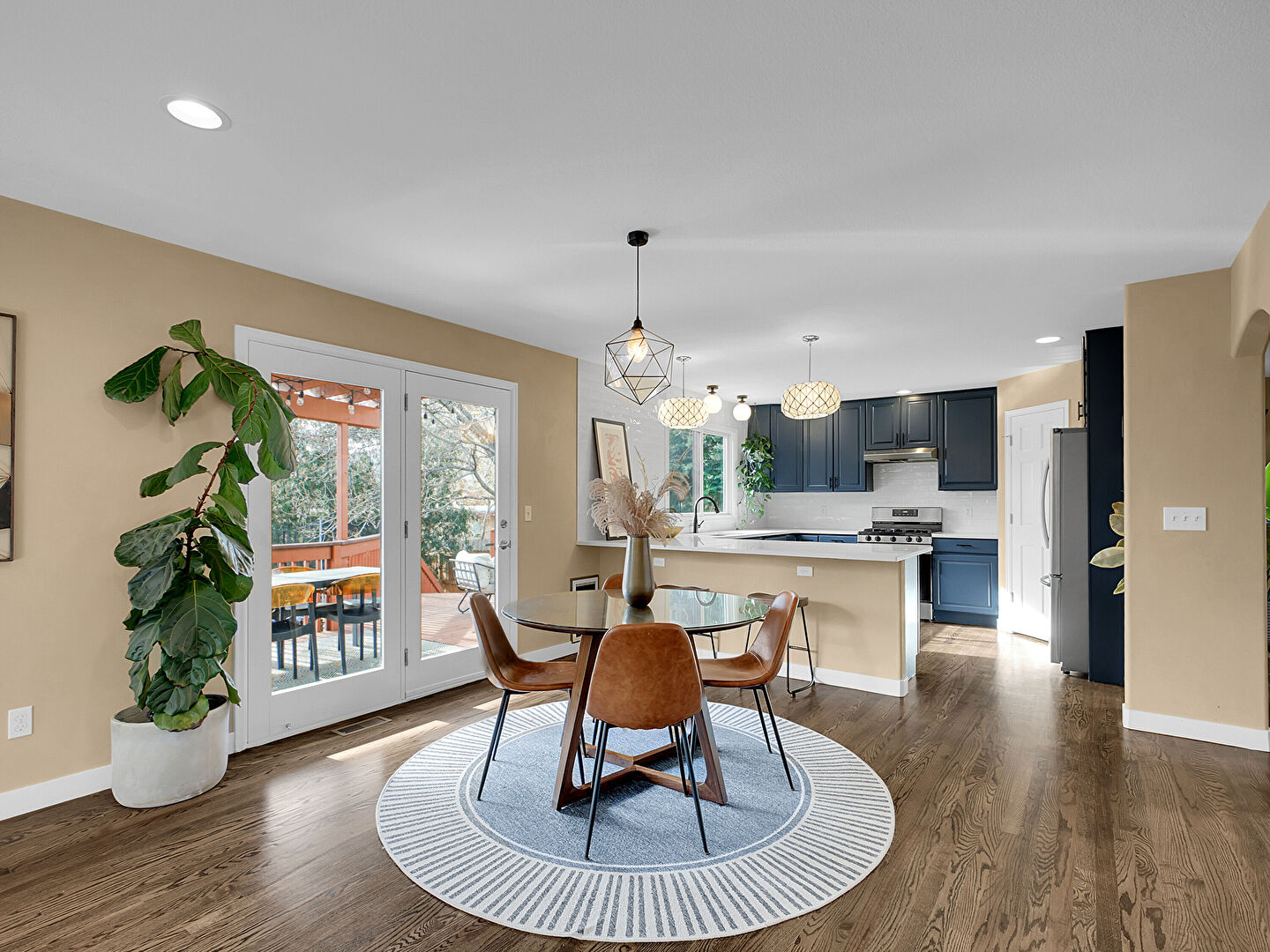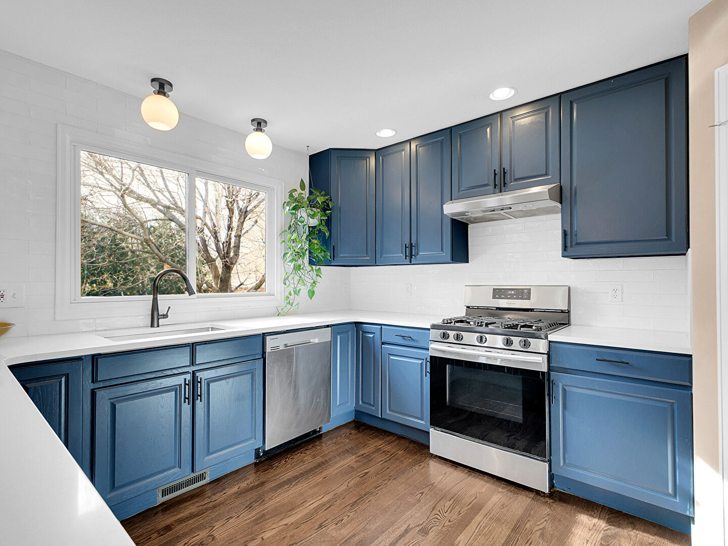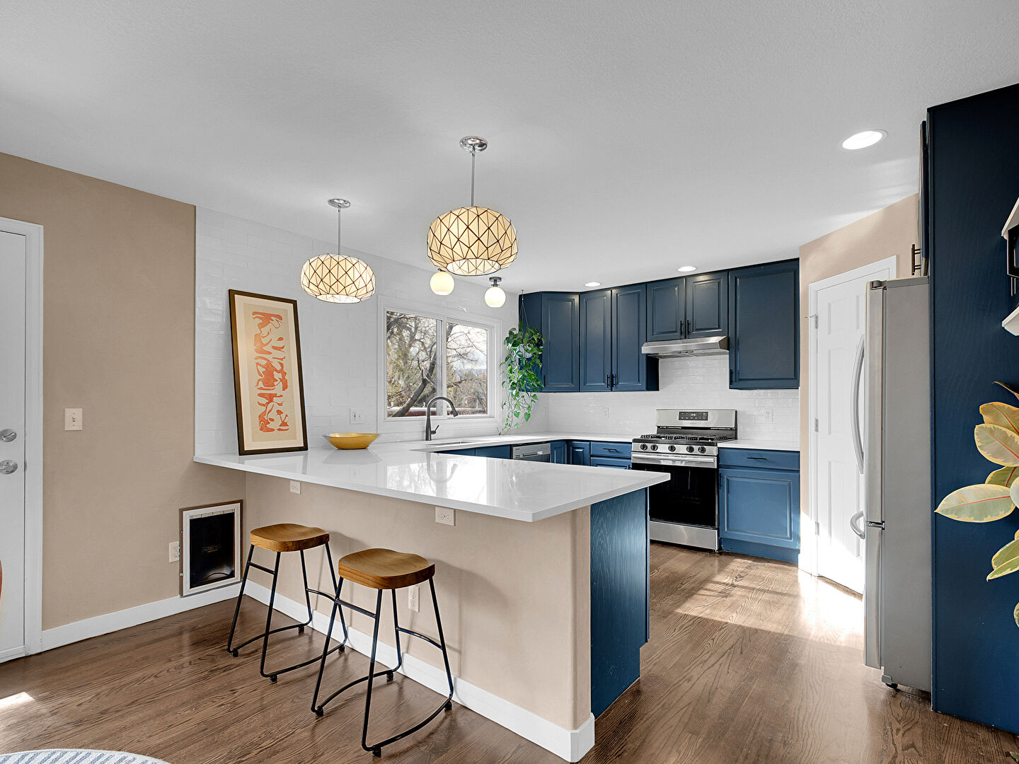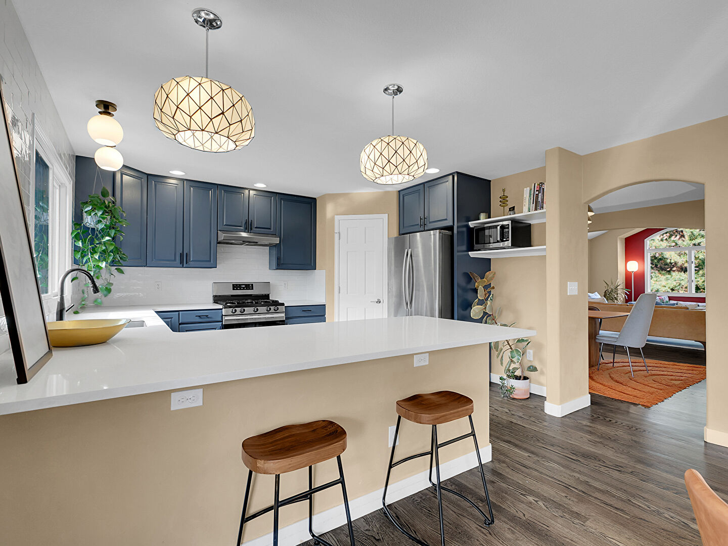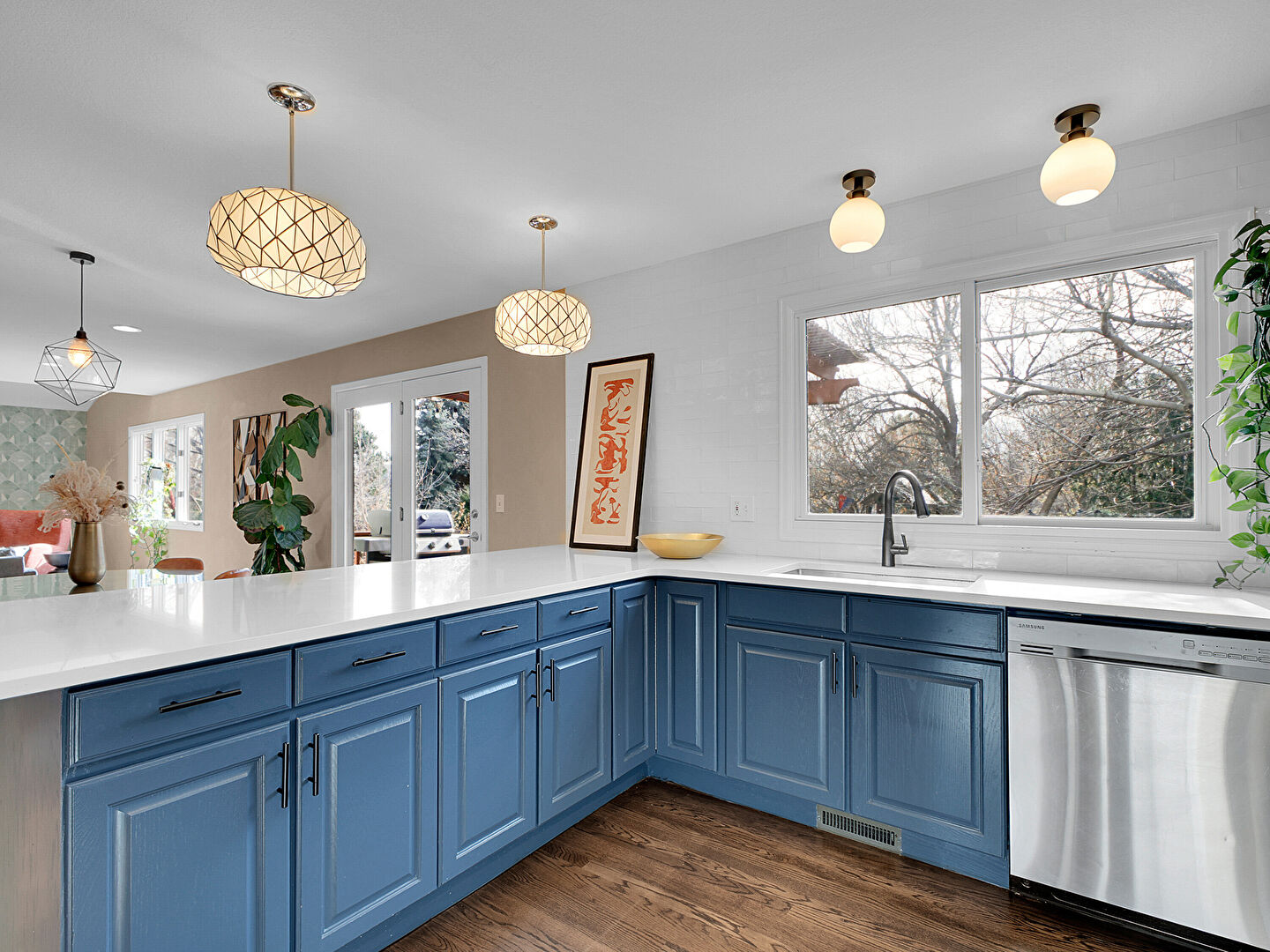 Arched Walkways, Baseboards Wall, Blue Cabinets, Drywall, French Doors, G Shaped Kitchen, Kitchen Bar, Kitchen Peninsula, Natural Light, One Wall Kitchen, Open Shelves, Pendant Lighting, Raised Cabinets, Recessed Lighting, Shaker Cabinets, Stone Countertops, Vent, Wood Finish Floor, Baseboards Wall, Raised Cabinets, Recessed Lighting, Vent