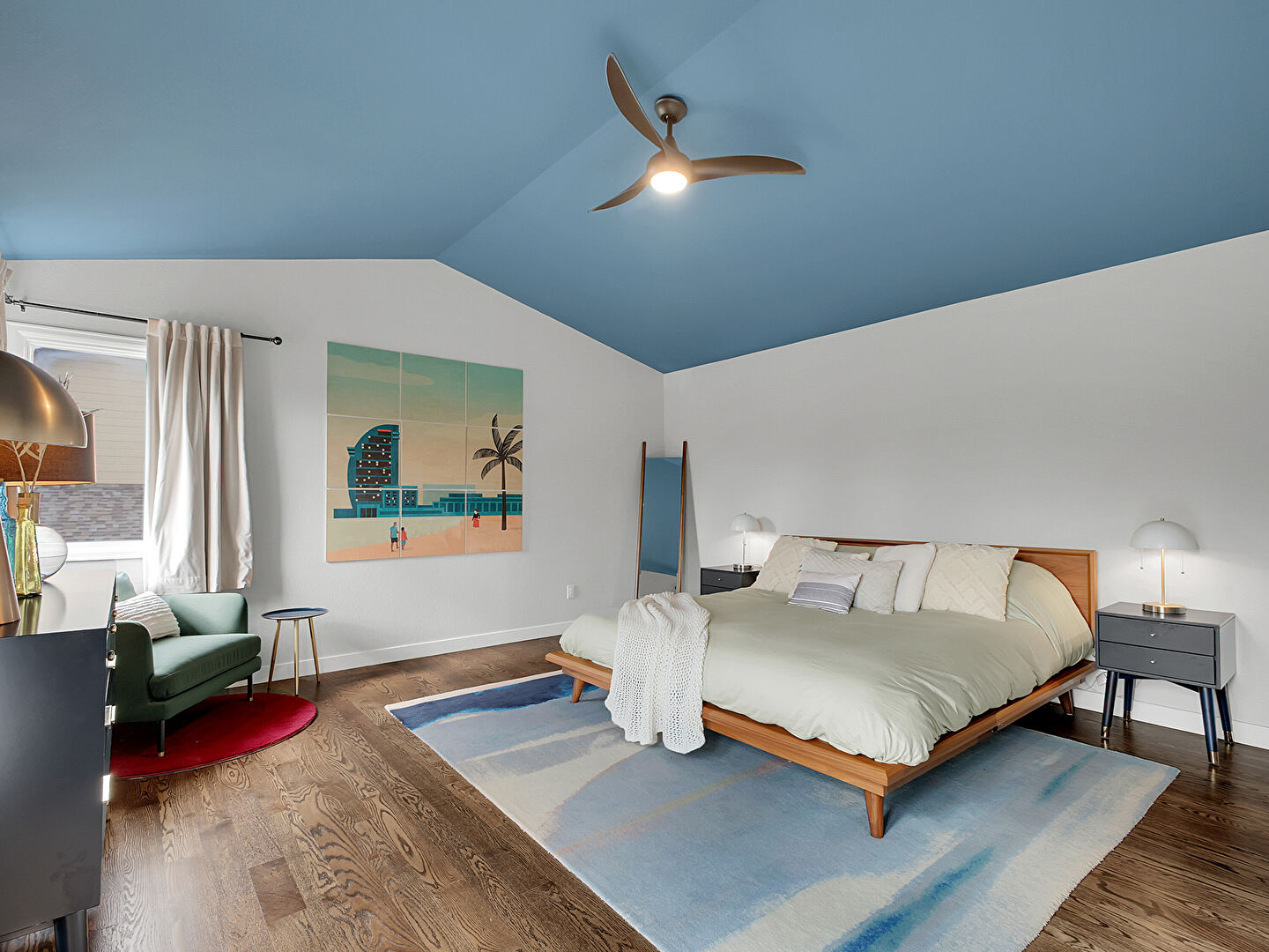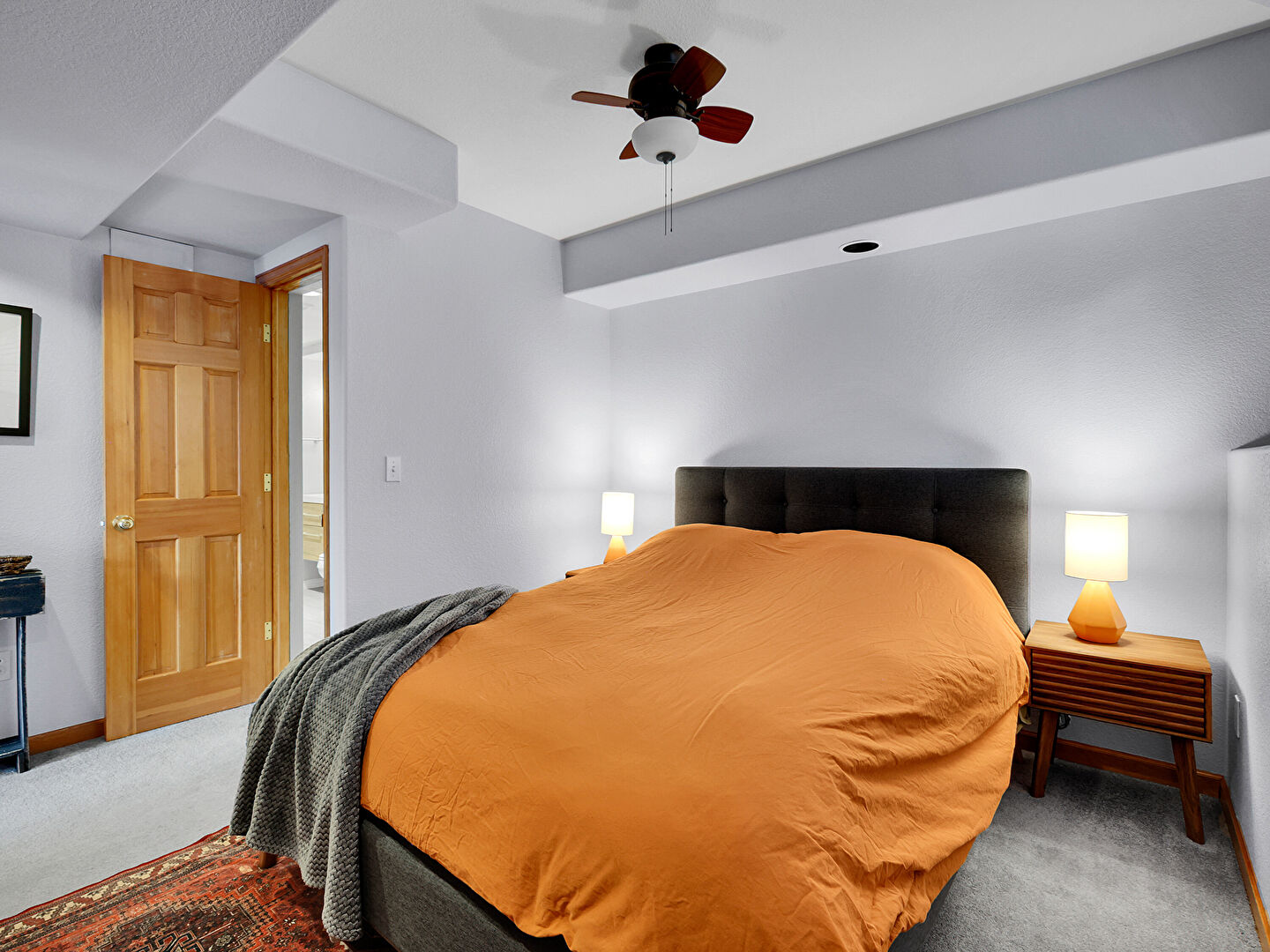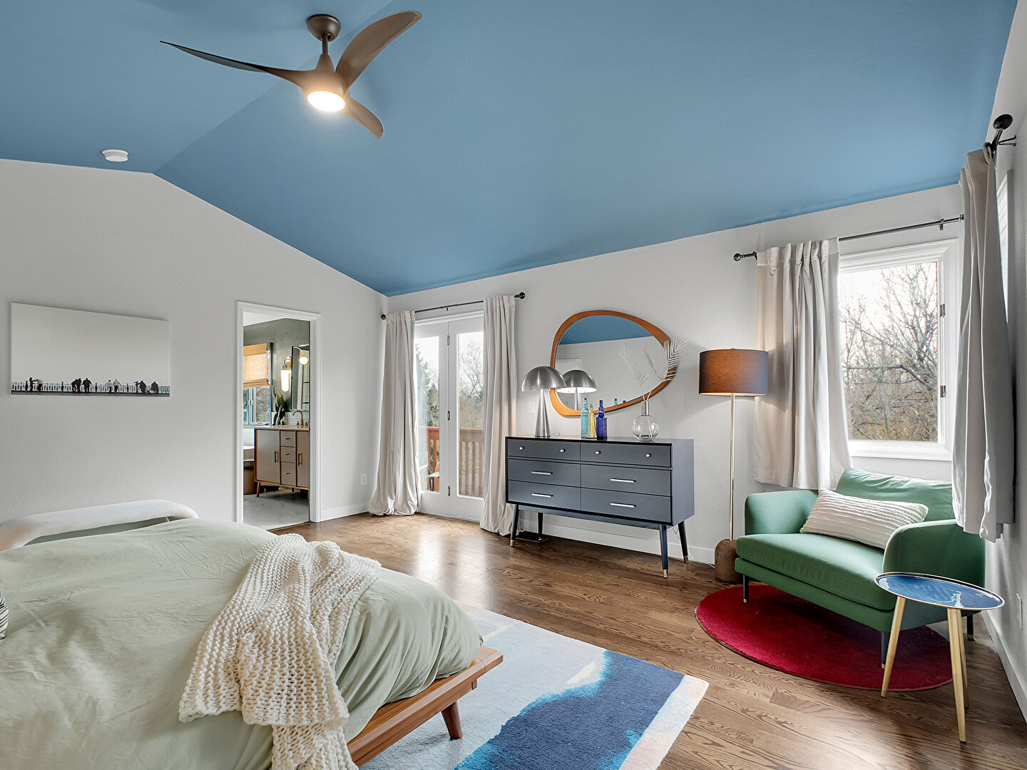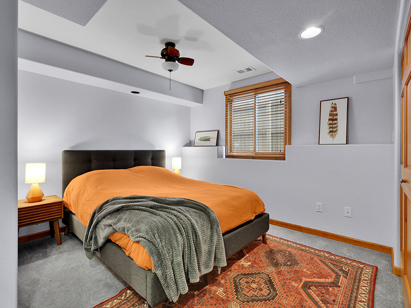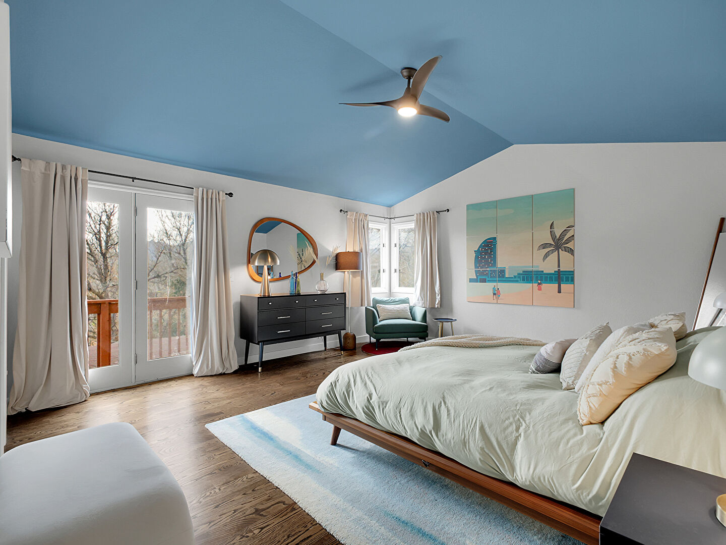 Access To Exterior, Baseboards Wall, Carpet, Cathedral Ceiling, Ceiling Fan, Closet, Drywall, French Doors, Natural Light, Recessed Lighting, Textured Ceiling, Vaulted Ceiling, Vent, Wood Finish Floor, Access To Exterior, Carpet, Ceiling Fan, Ensuite Bathroom, Natural Light