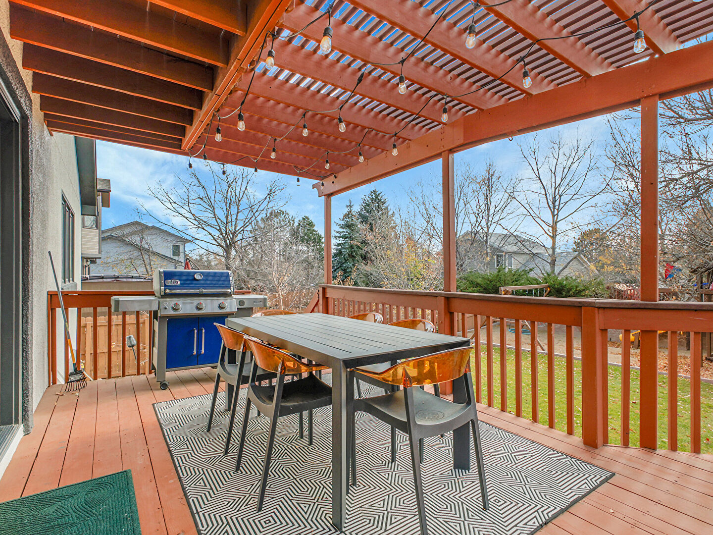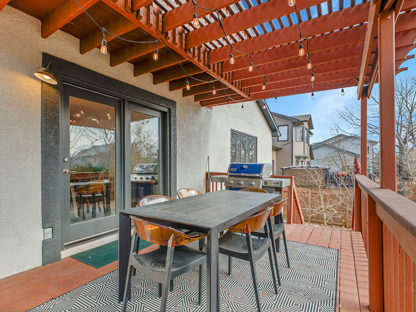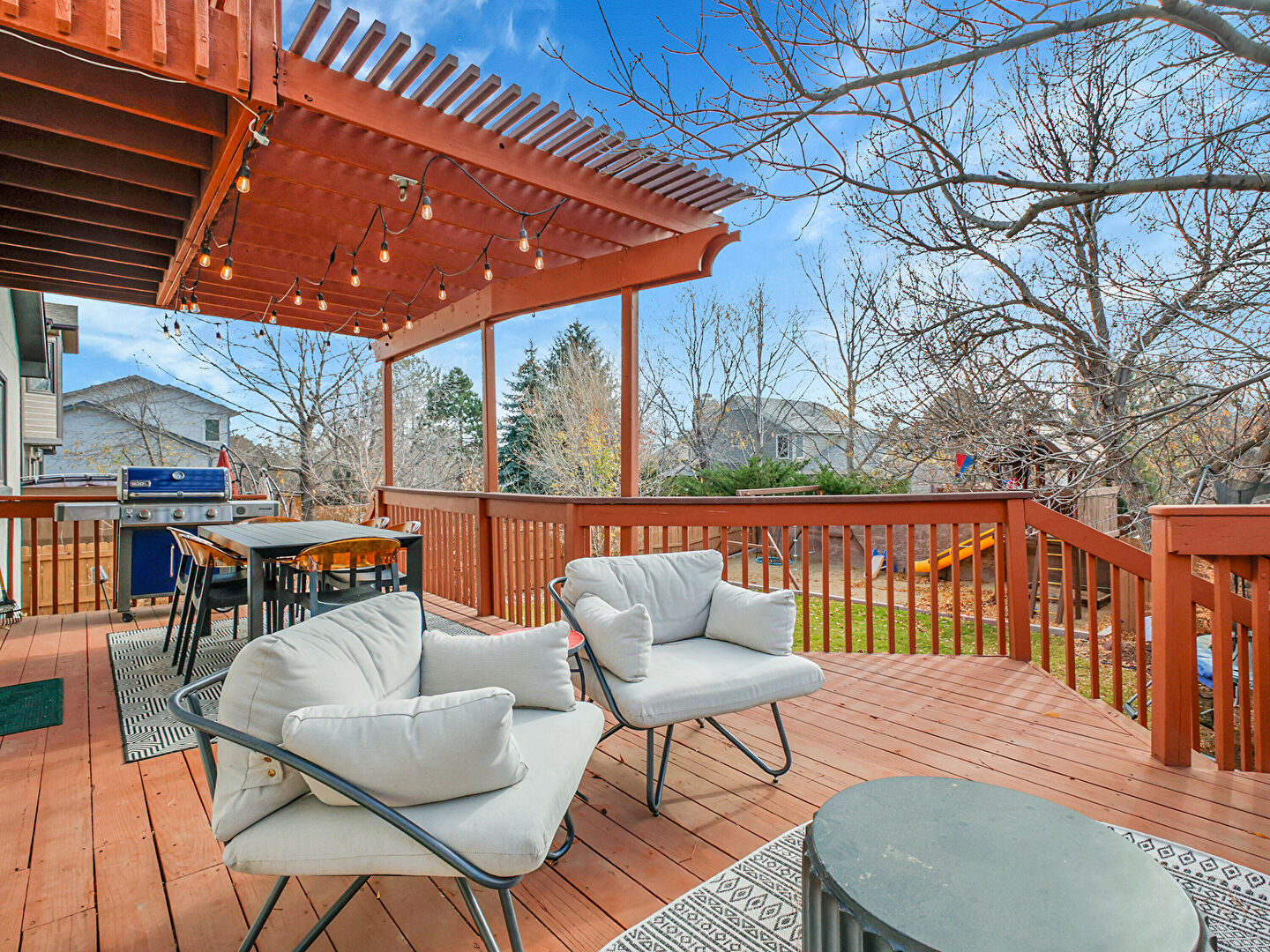 Deck, Grill, Outdoor Dining Area, Outdoor Living Space, Pergola, Balcony, Deck, Fence, Lawn
