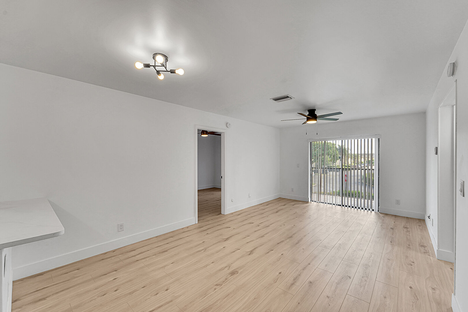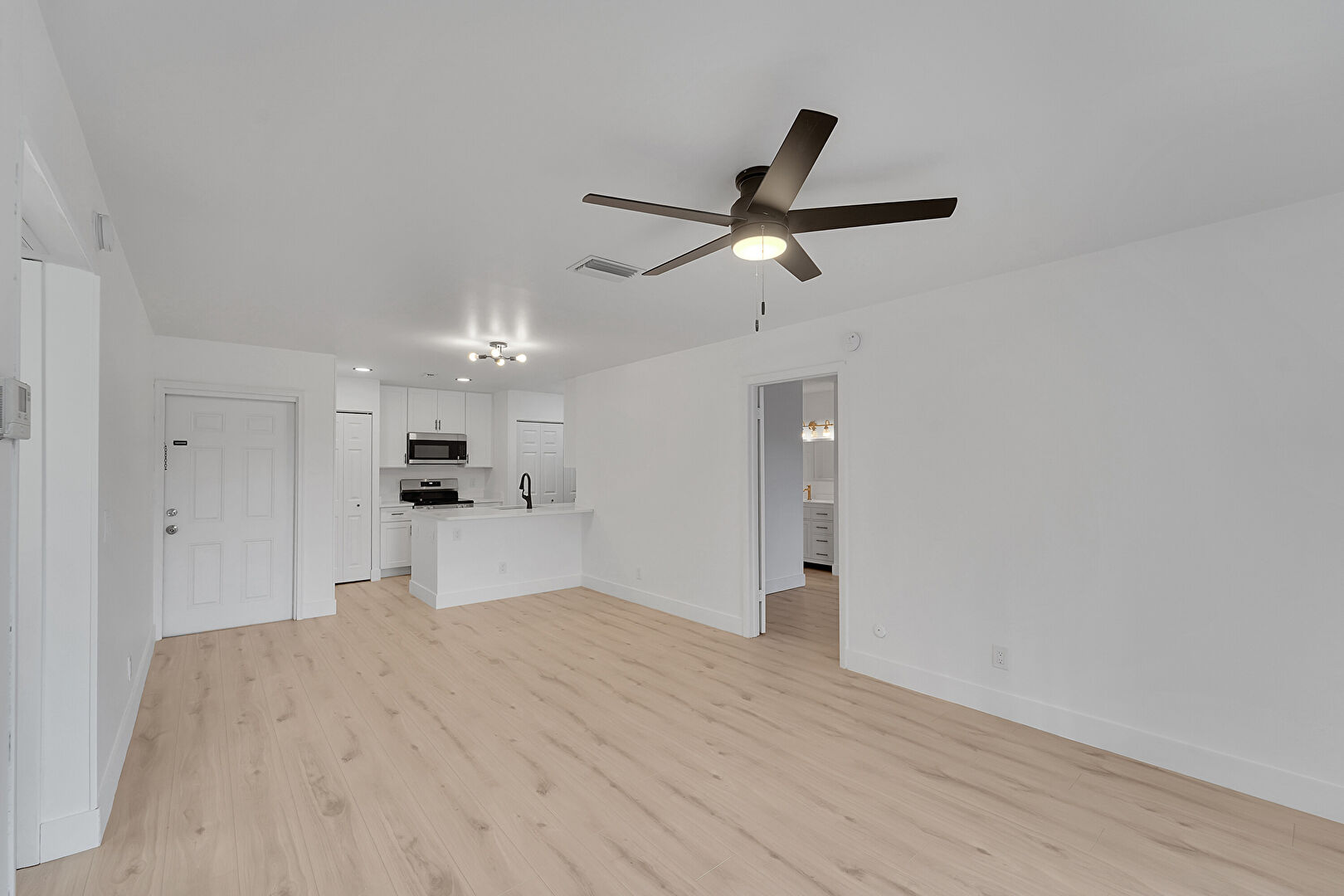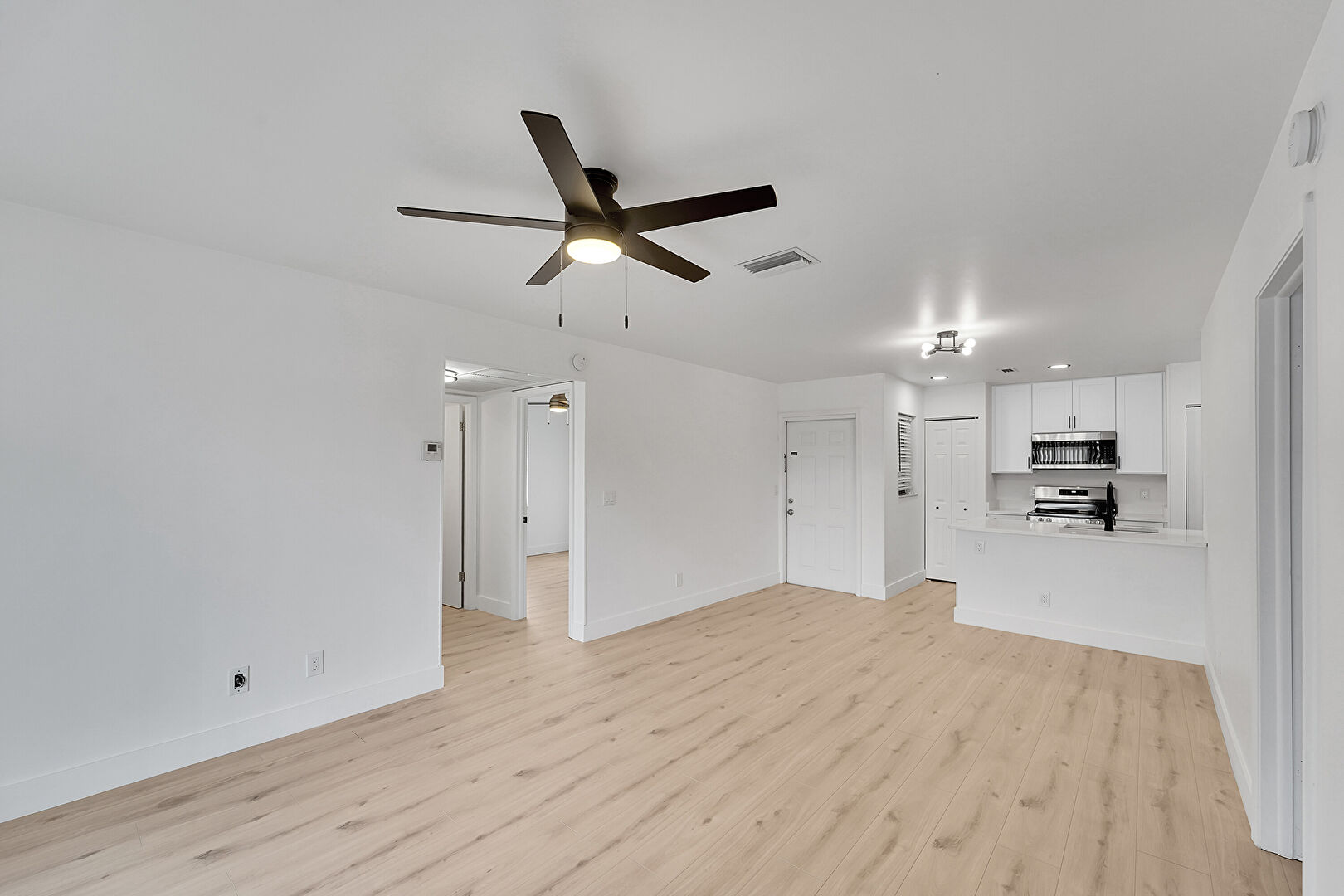 Baseboards Wall, Ceiling Fan, Drywall, Natural Light, Recessed Lighting, U Shaped Kitchen, Vent, Wood Finish Floor, Drywall, Vent