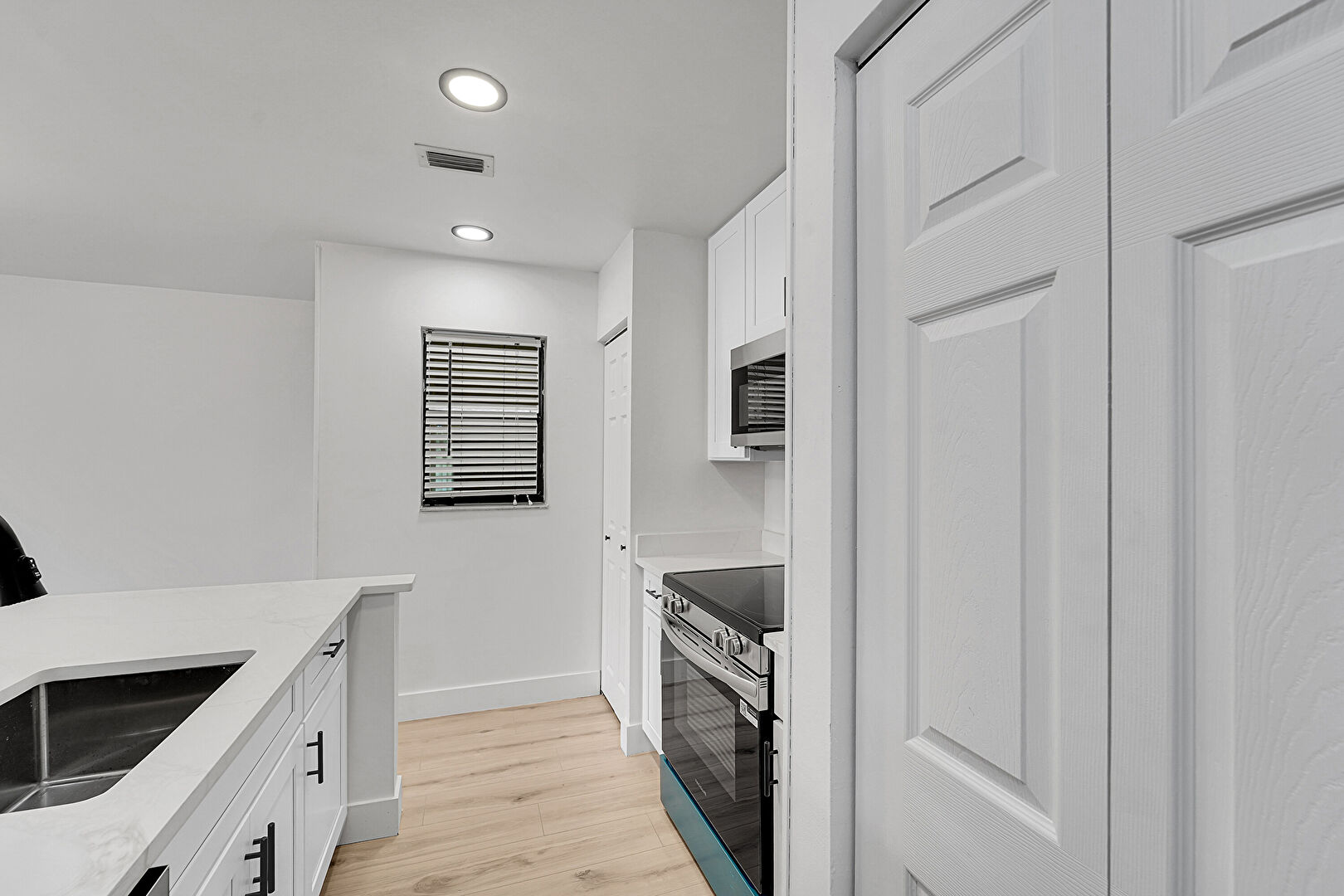 Baseboards Wall, Drywall, Natural Light, Recessed Lighting, Shaker Cabinets, Stone Countertops, Vent, Wood Finish Floor, Kitchen Peninsula, Vent, Wood Finish Floor