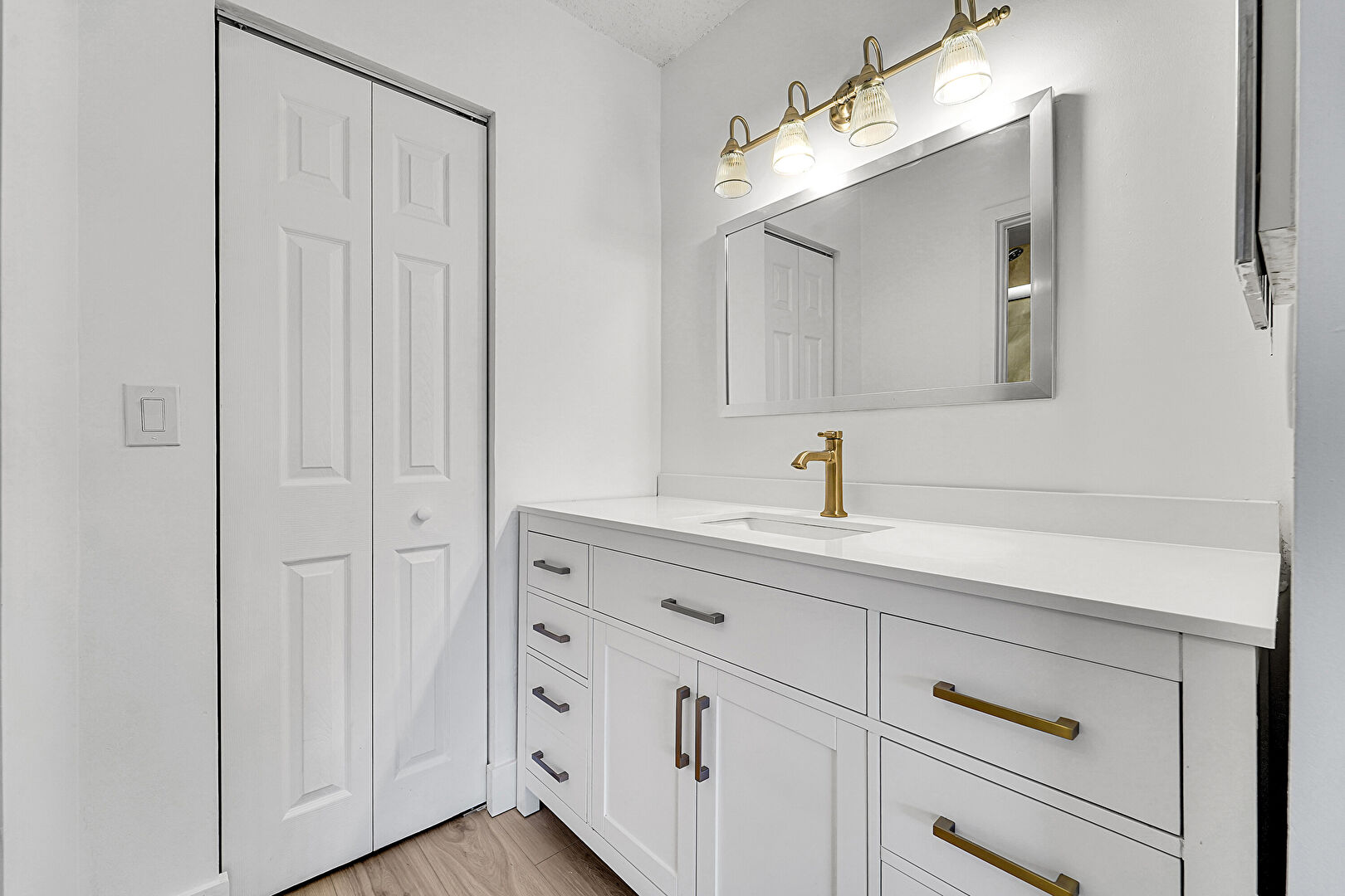 Closet, Drywall, Tile Wall, Vanity, Full Bathroom, Wood Finish Floor