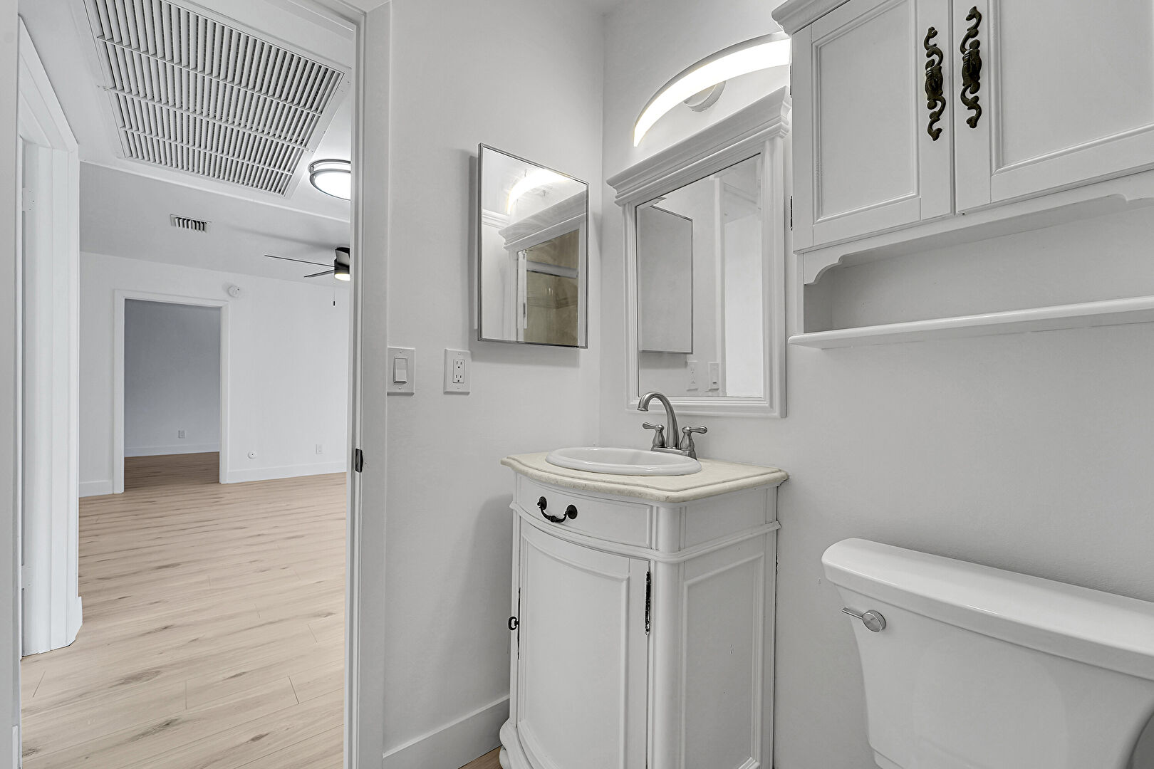 Baseboards Wall, Ceiling Fan, Drywall, Half Bathroom, Vanity, Wood Finish Floor, Full Bathroom, Vent