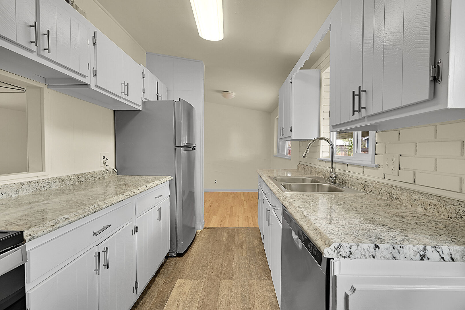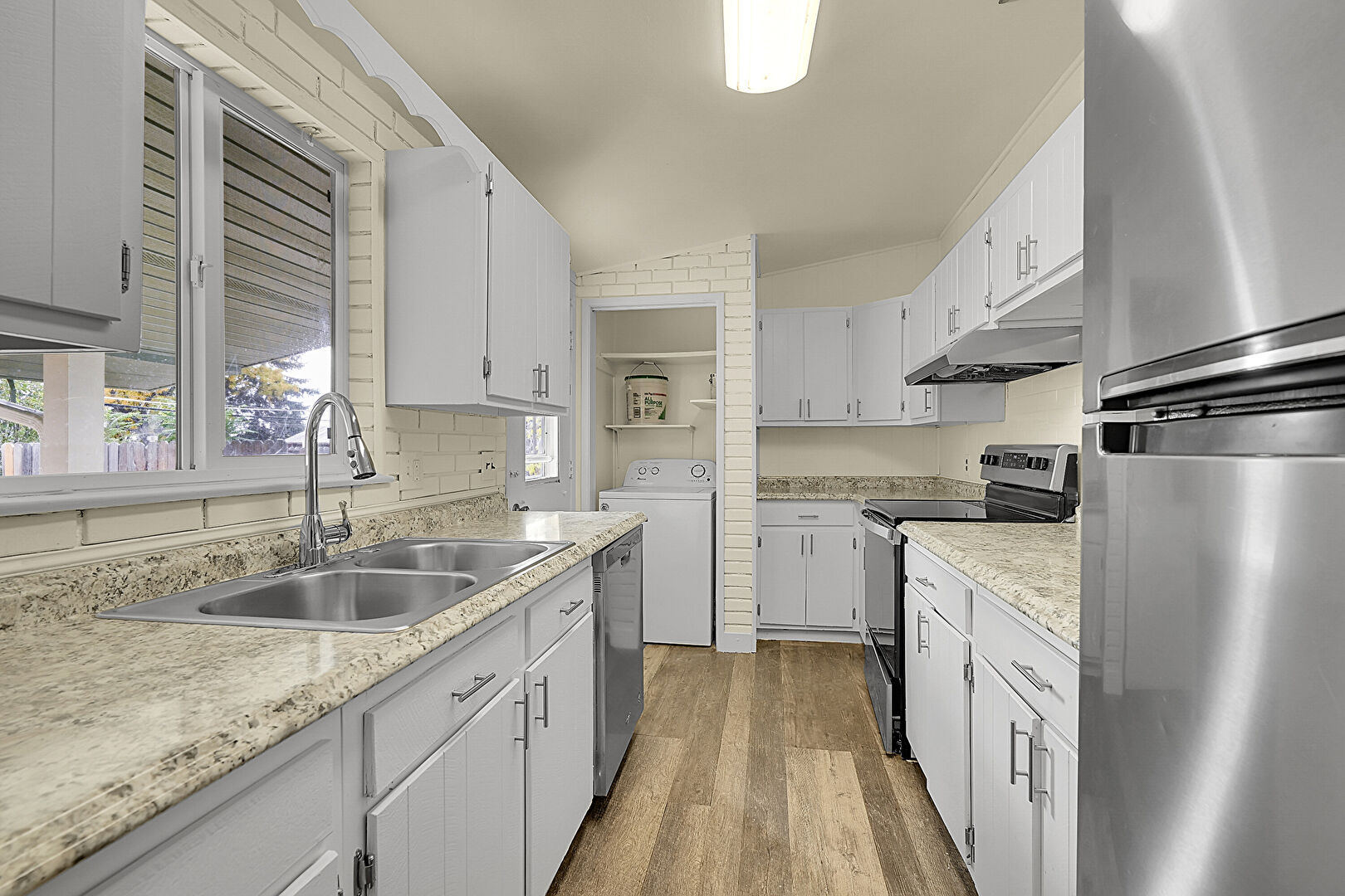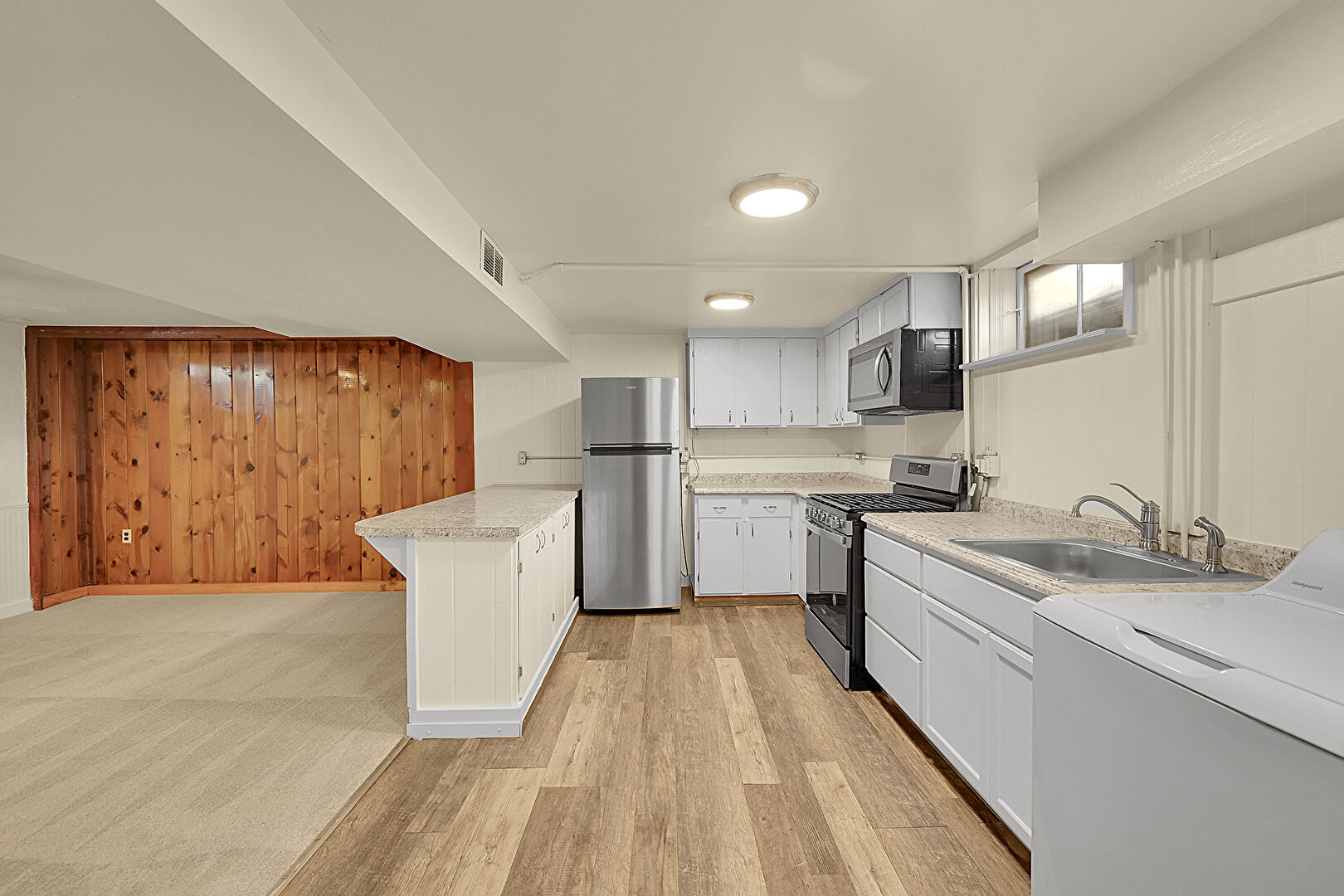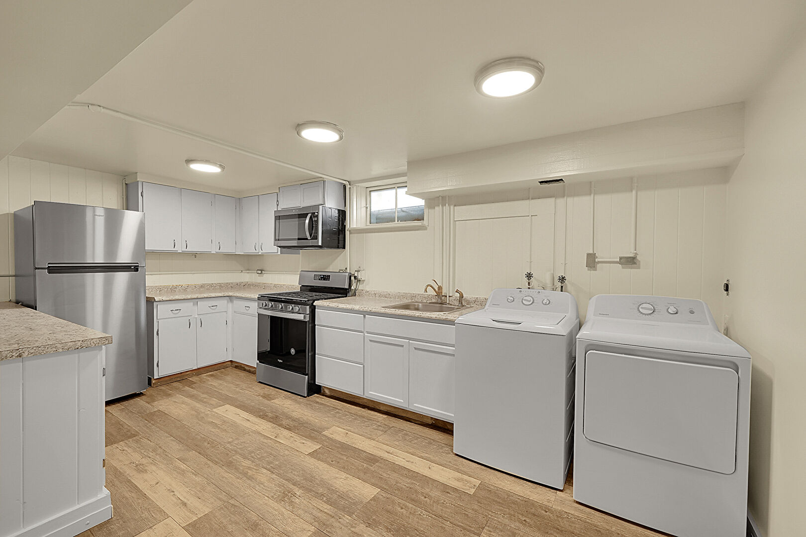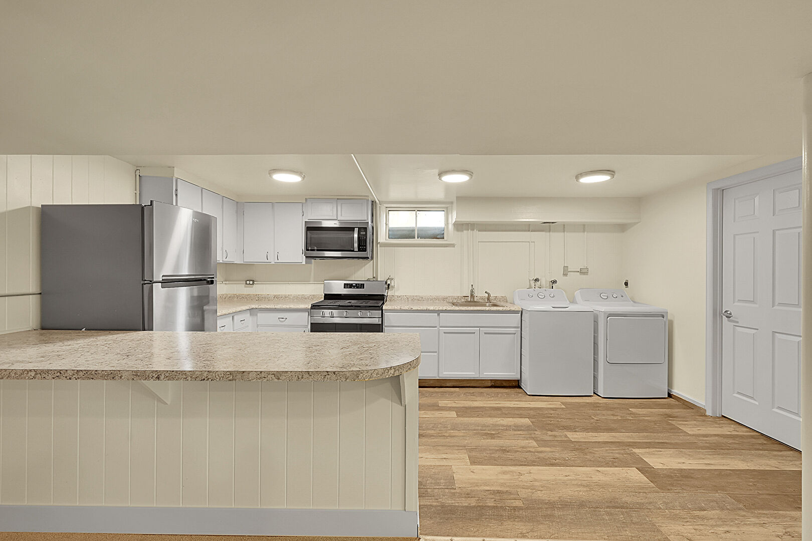 Baseboards Wall, Basement, Drywall, Galley Kitchen, Kitchen Bar, Kitchen Peninsula, L Shaped Kitchen, Laundry, Natural Light, Recessed Lighting, Stone Countertops, U Shaped Kitchen, Vaulted Ceiling, Vent, Visible Hinge Cabinets, Washer Dryer, Washer Hookup, Wood Finish Floor, Wood Wall, Basement, Natural Light, Shaker Cabinets, Visible Hinge Cabinets