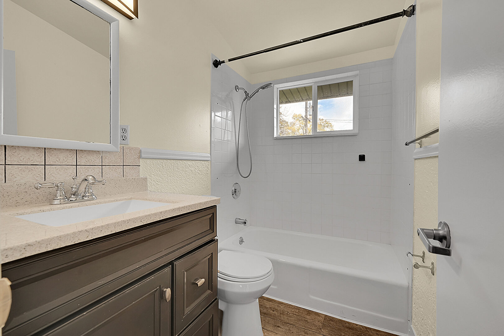 Combined Bath Shower, Full Bathroom, Natural Light, Textured Wall, Wood Finish Floor, Vanity