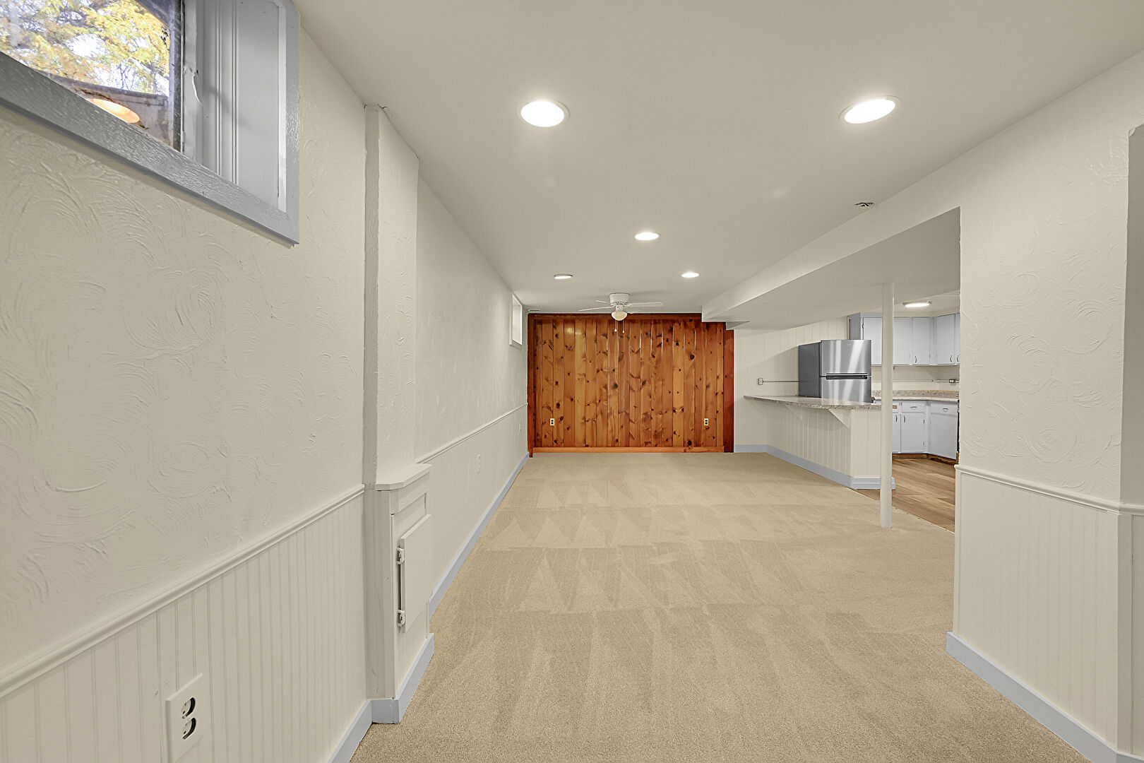 Baseboards Wall, Basement, Beamed Ceiling, Carpet, Ceiling Fan, Drywall, Natural Light, Paneling Wall, Recessed Lighting, Textured Wall, Vaulted Ceiling, Vent, Wood Finish Floor, Wood Wall, Baseboards Wall, Beamed Ceiling, Laundry, Wainscot Wall