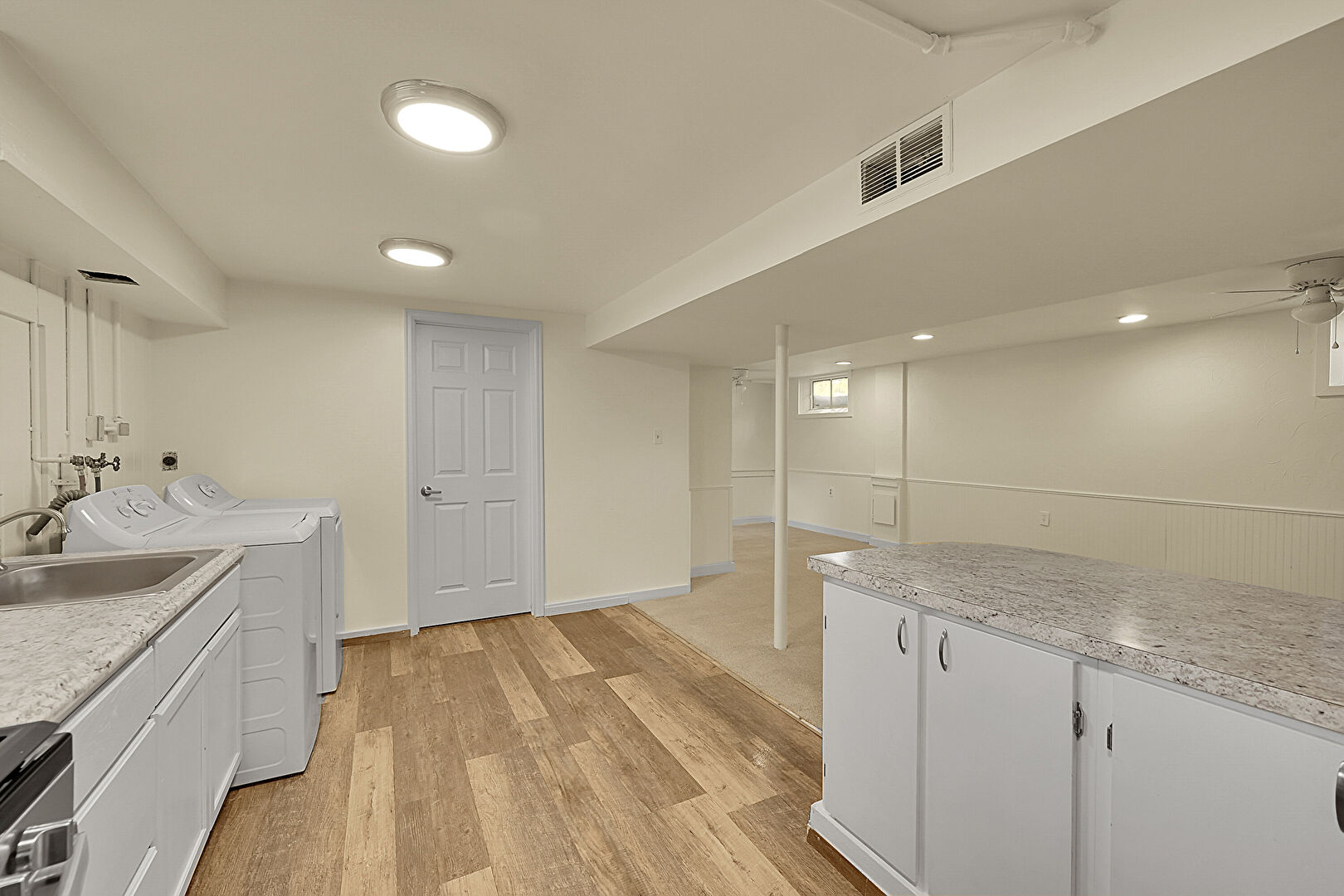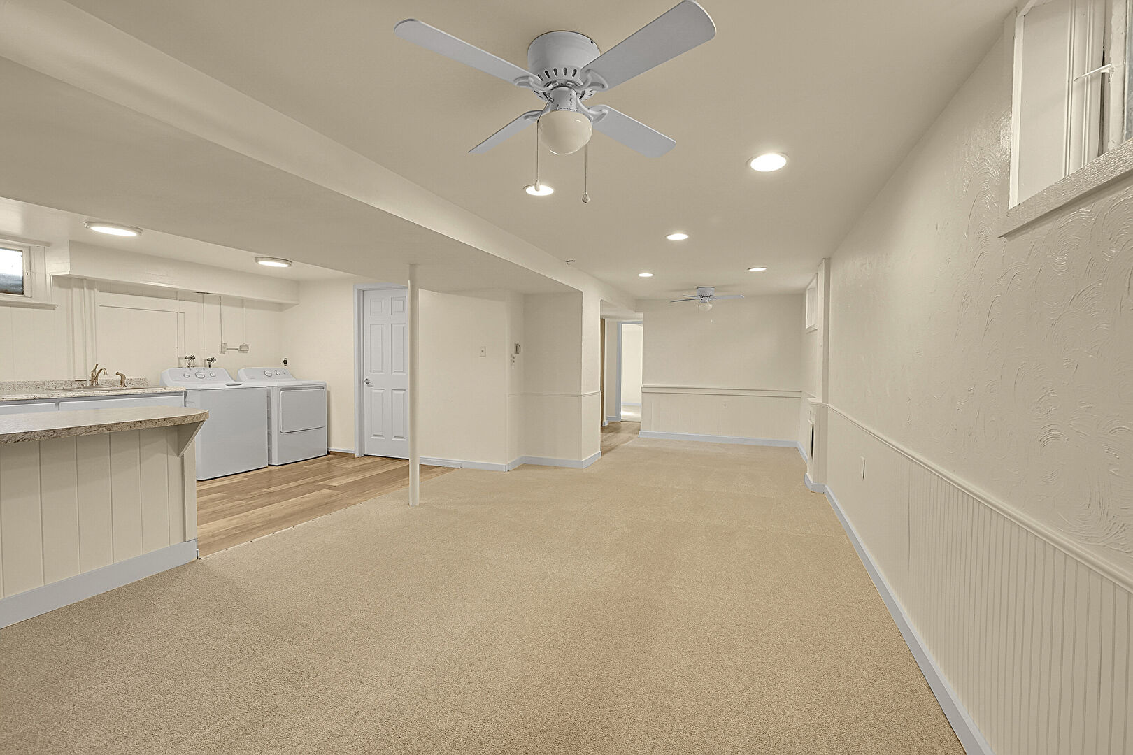 Baseboards Wall, Basement, Ceiling Fan, Drywall, Laundry, Recessed Lighting, Vent, Wood Finish Floor, Washer Hookup