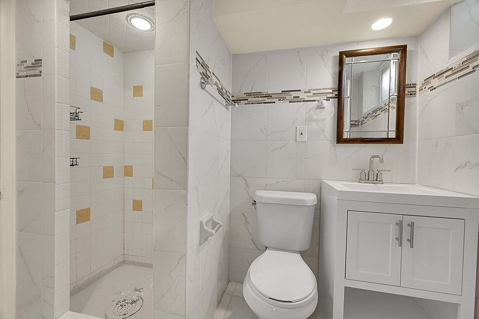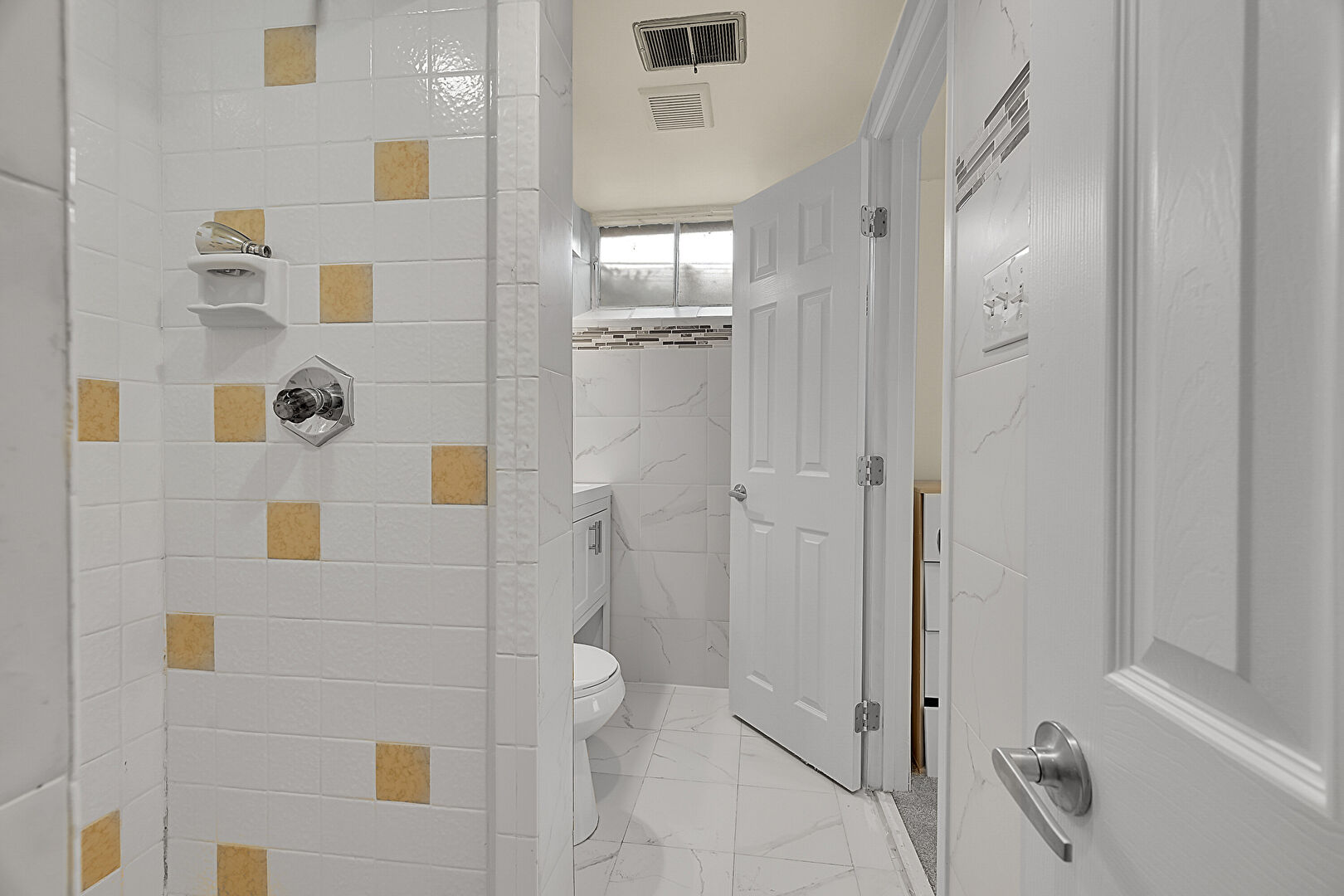 Marble Finish Floor, Natural Light, Recessed Lighting, Tile Wall, Vanity, Vent, Full Bathroom