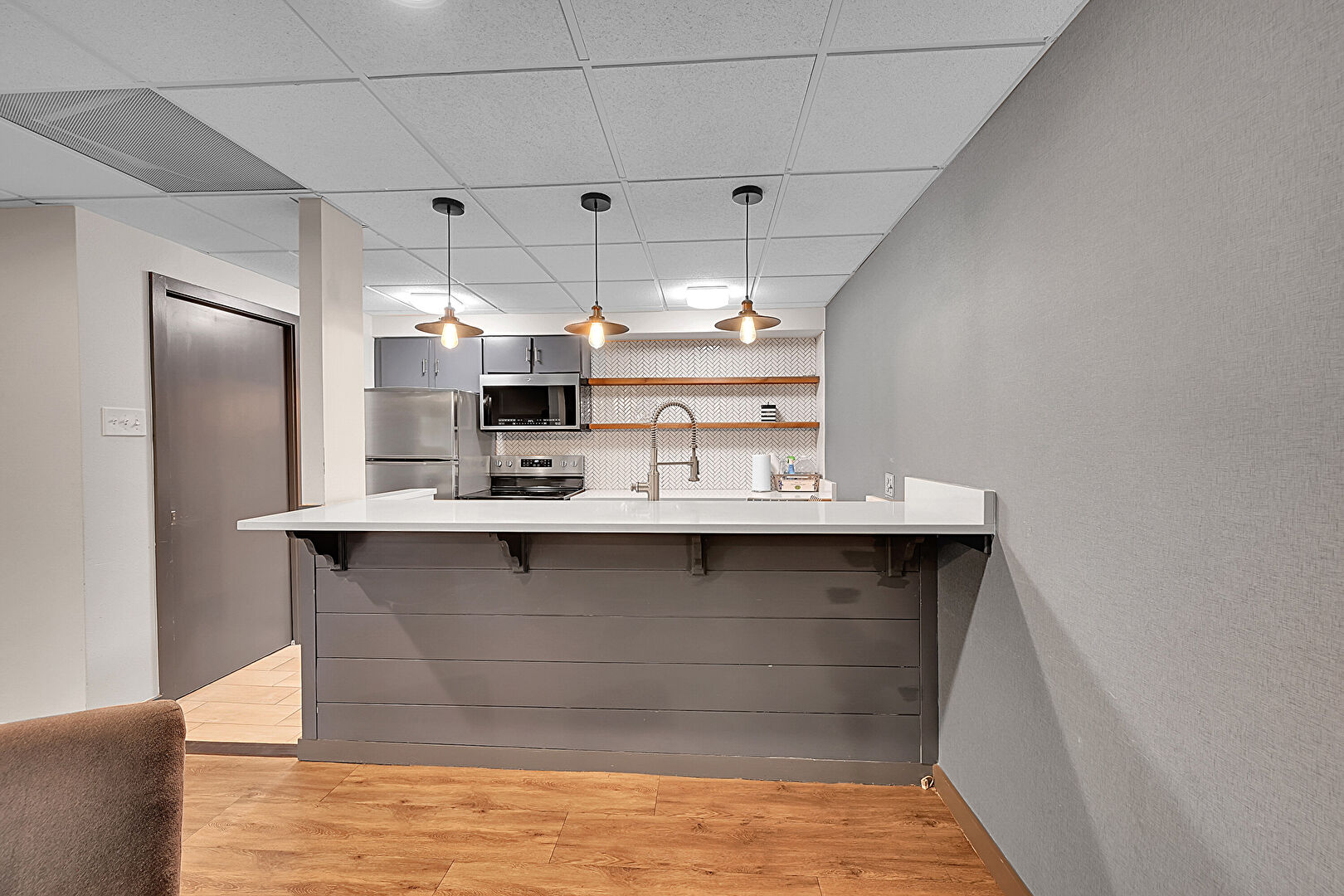 Accent Wall, Baseboards Wall, Carpet, Drop Ceiling, Drywall, Gray Cabinets, Kitchen Bar, Kitchen Peninsula, Natural Light, Open Shelves, Pendant Lighting, Recessed Lighting, Stone Countertops, Stone Wall, Textured Wall, U Shaped Kitchen, Vent, Wood Finish Floor, Wood Wall, Baseboards Wall, Basement, Smoke Carbon Monoxide Detector, Wood Finish Floor