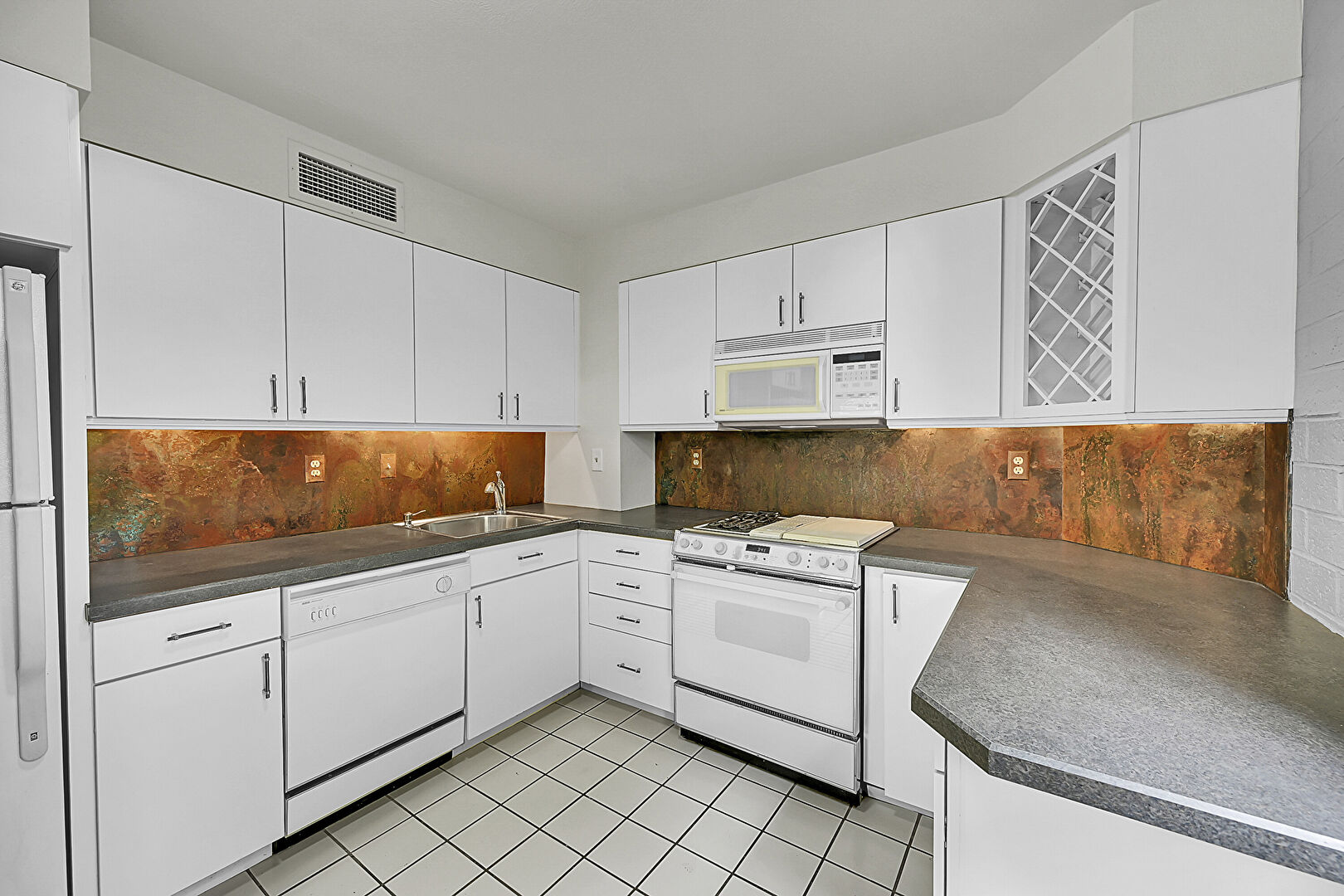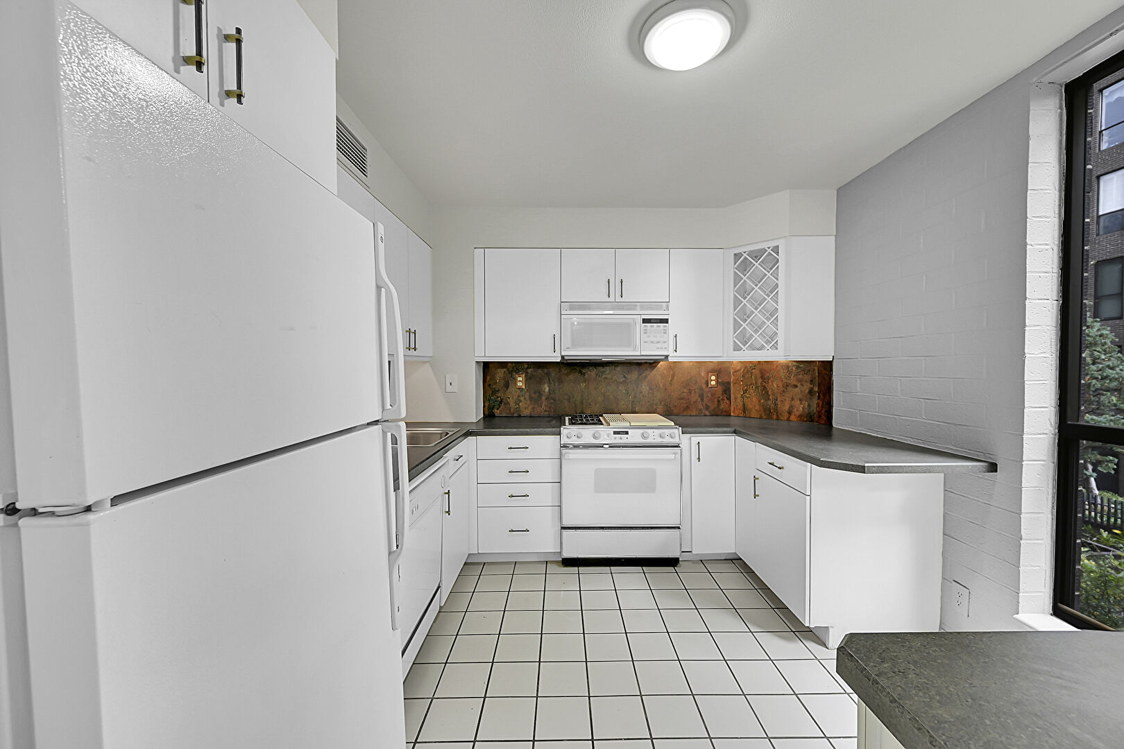 Kitchen Peninsula, Tile Floor, U Shaped Kitchen, Vent, Natural Light, Tile Floor