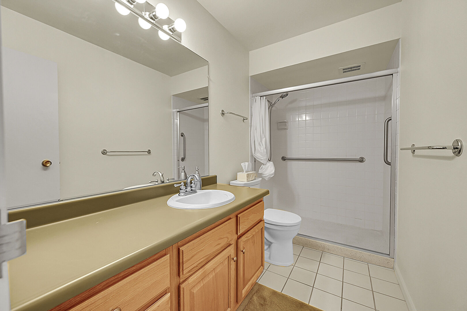 Carpet, Combined Bath Shower, Full Bathroom, Tile Floor, Vanity, Vent