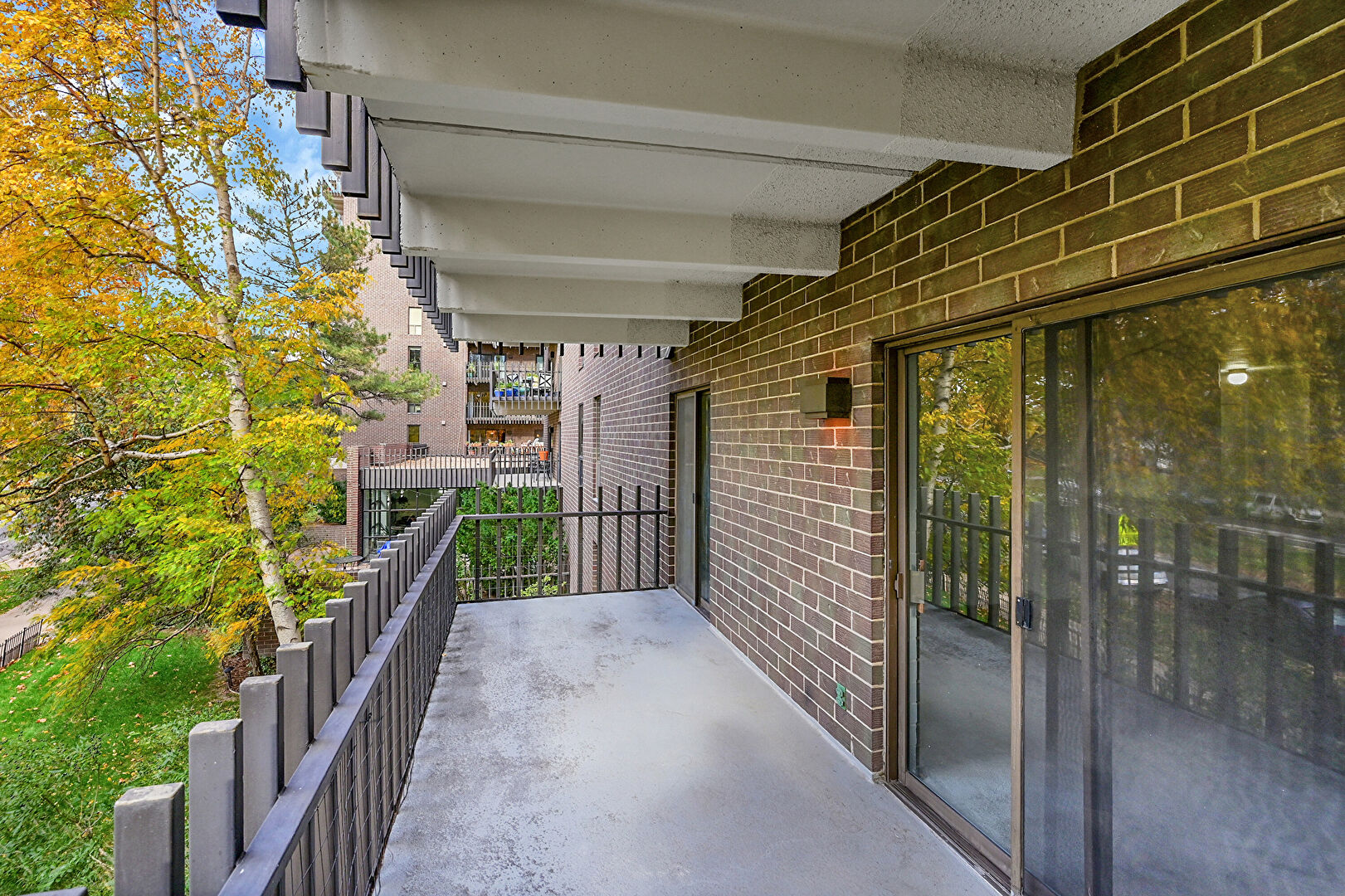 Balcony, Fence, Fire Pit, Grill, Outdoor Dining Area, Patio, Apartment Complex View, Fence, Woods View