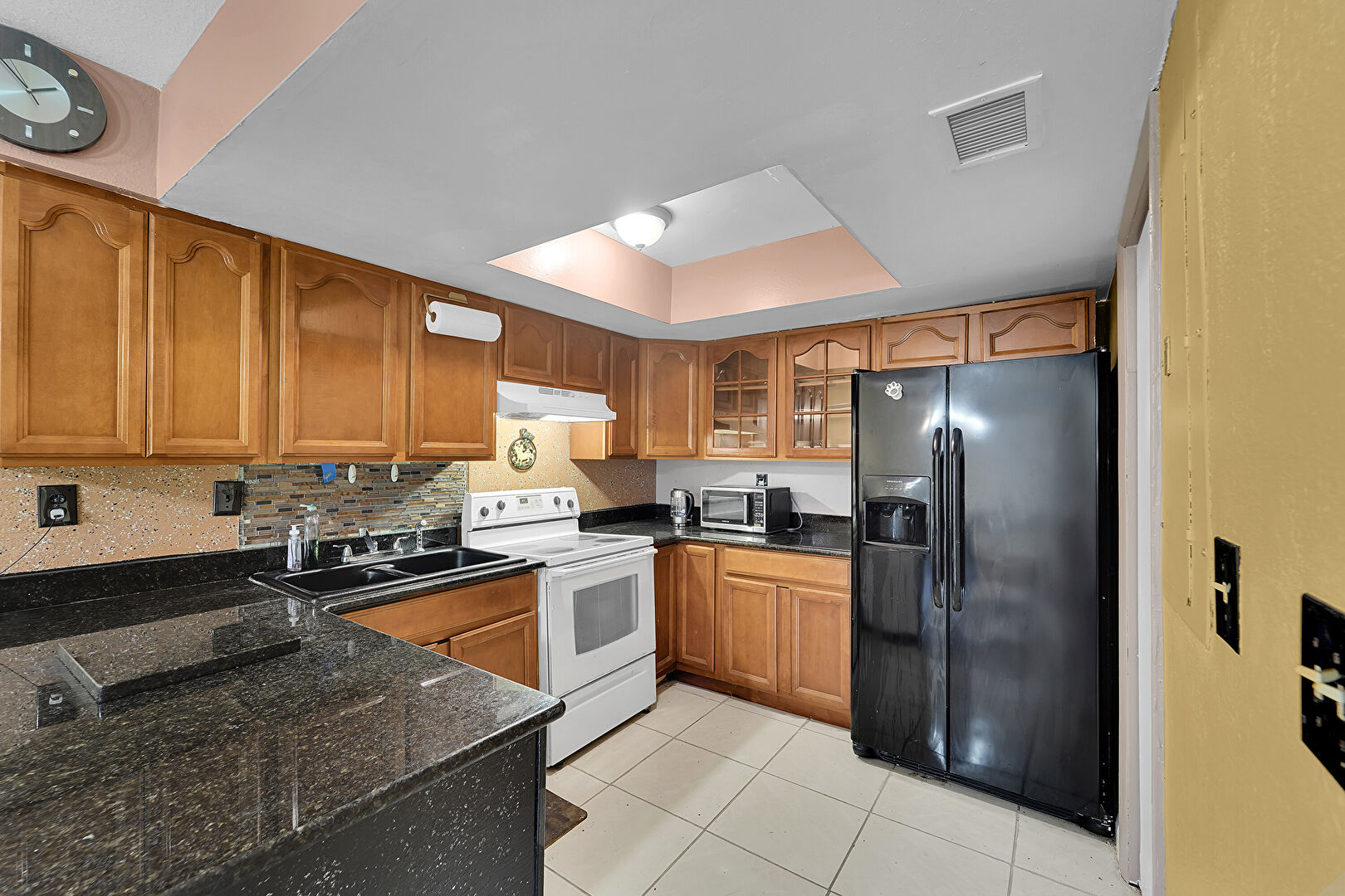 Arched Cabinets, Baseboards Wall, Ceiling Fan, Dark Brown Cabinets, Drywall, Electric Panel, Glass Insert Cabinets, Kitchen Peninsula, Medium Brown Cabinets, Natural Light, Shaker Cabinets, Stone Countertops, Tile Floor, Tray Ceiling, U Shaped Kitchen, Vent, Arched Cabinets, U Shaped Kitchen, Vent