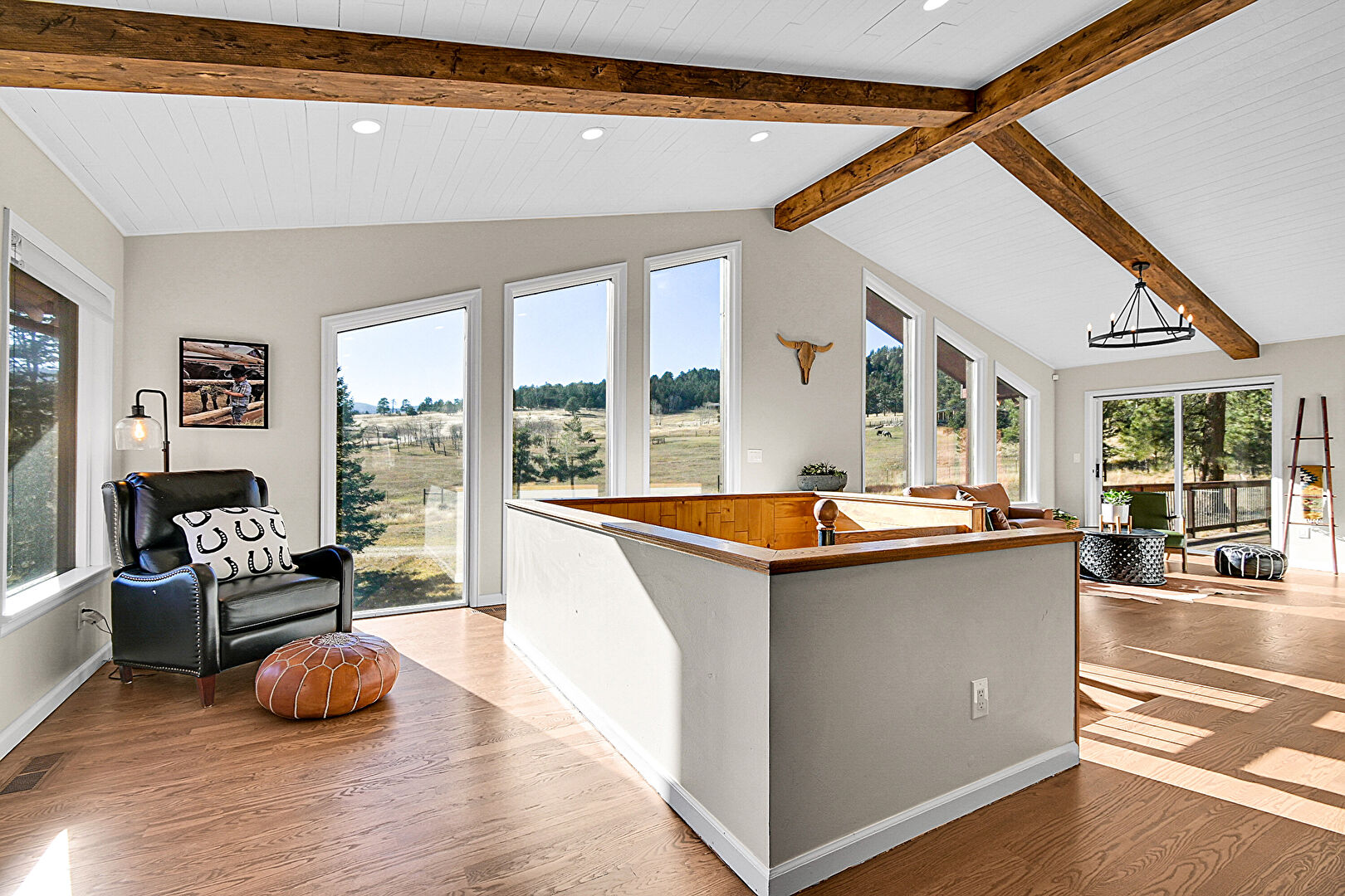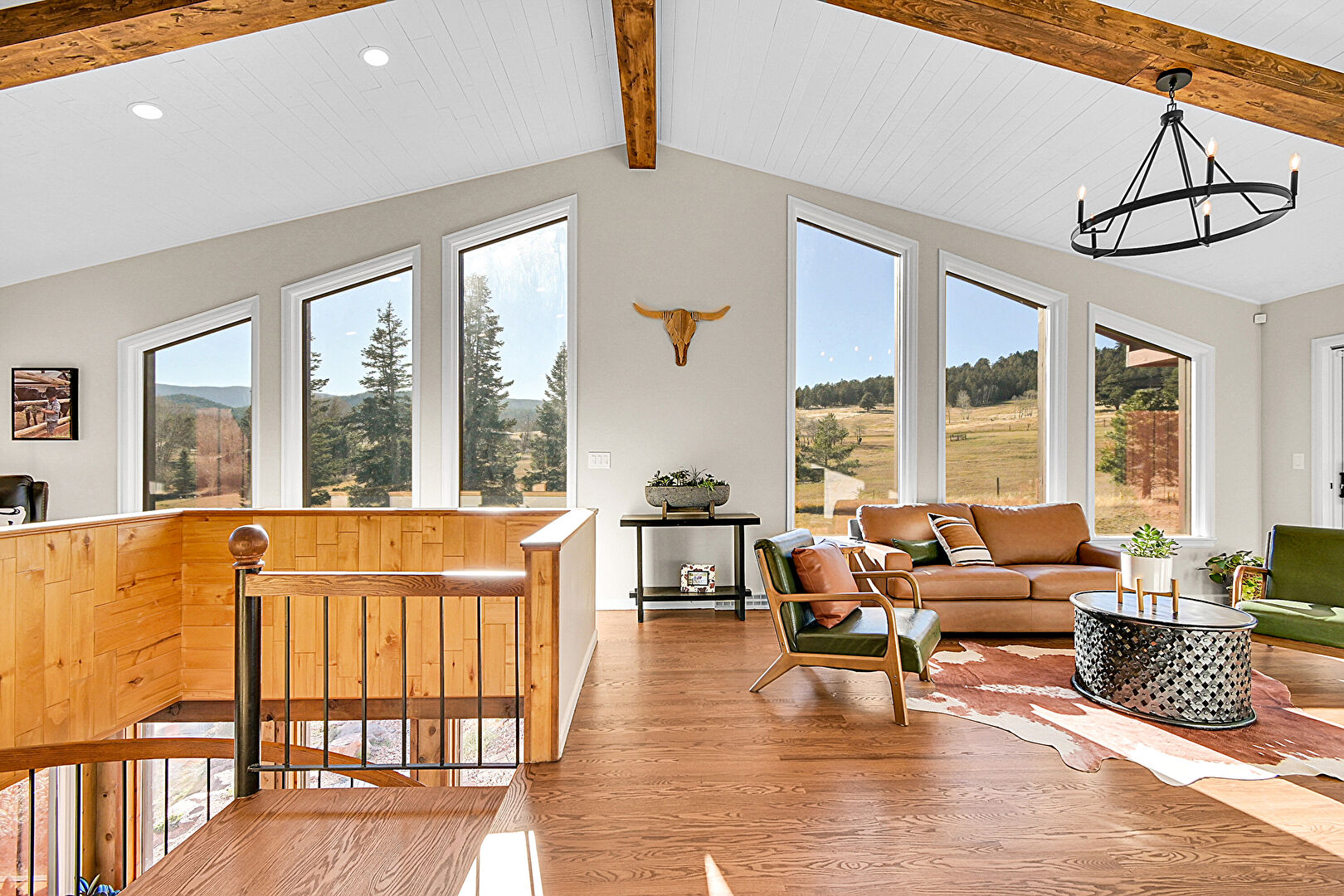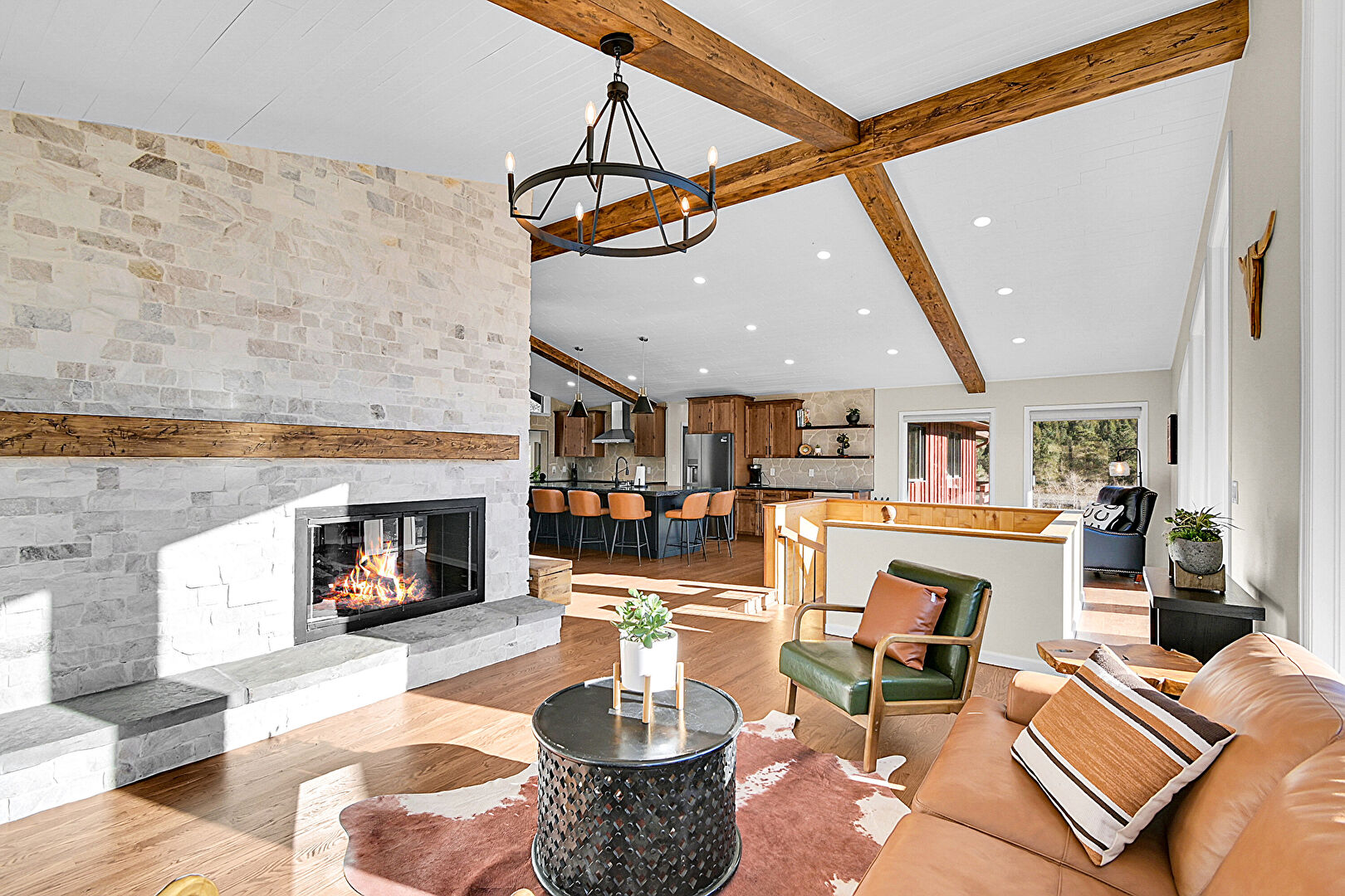 Beamed Ceiling, Natural Light, Rural View, Notable Chandelier