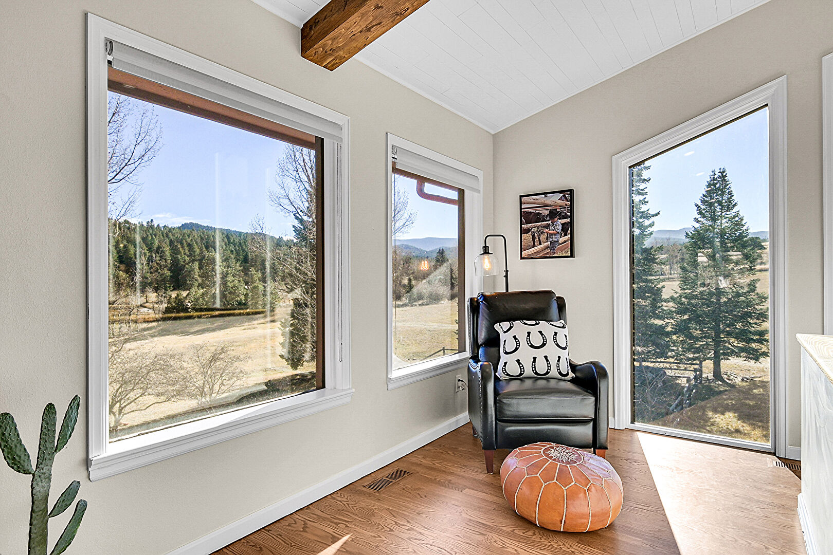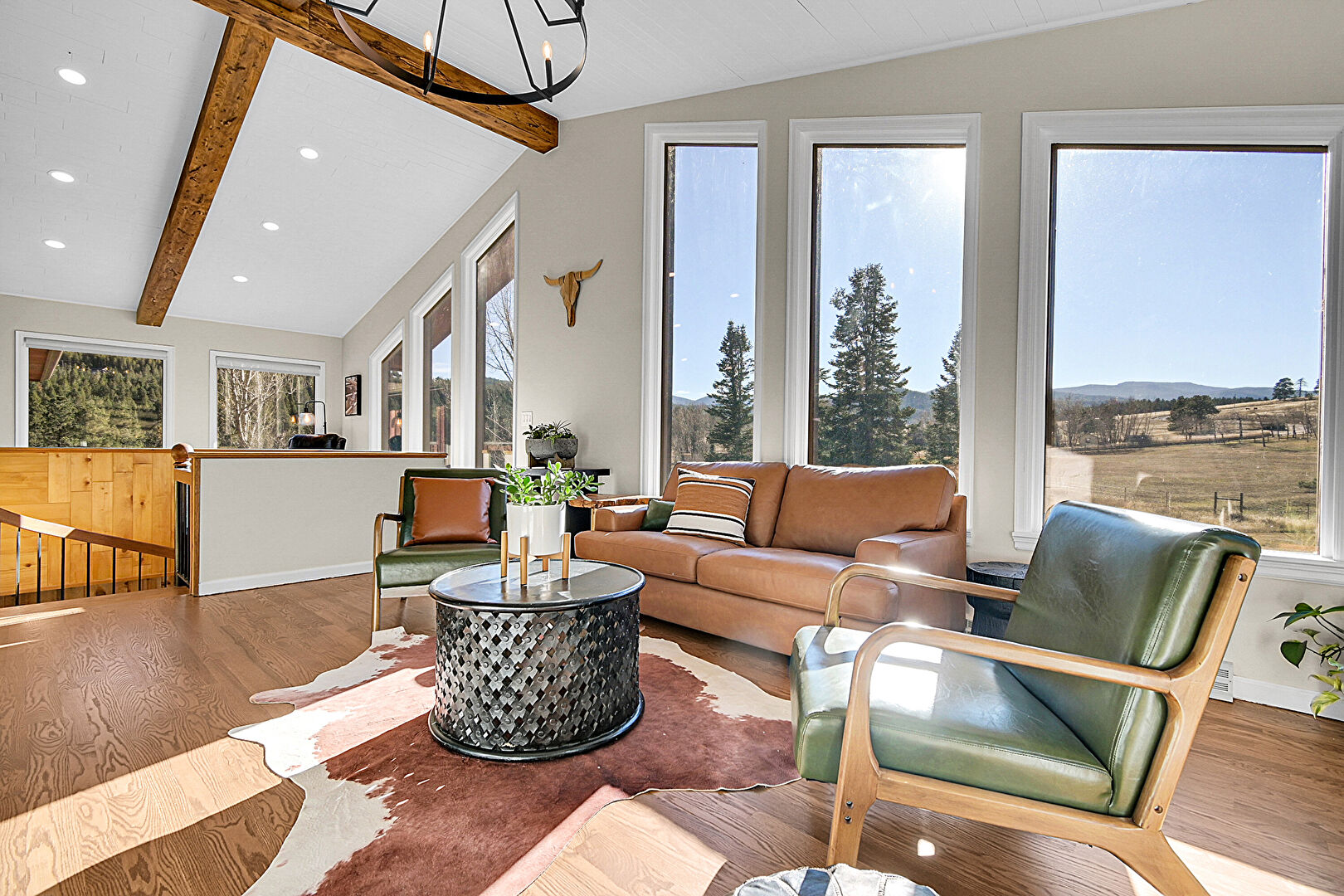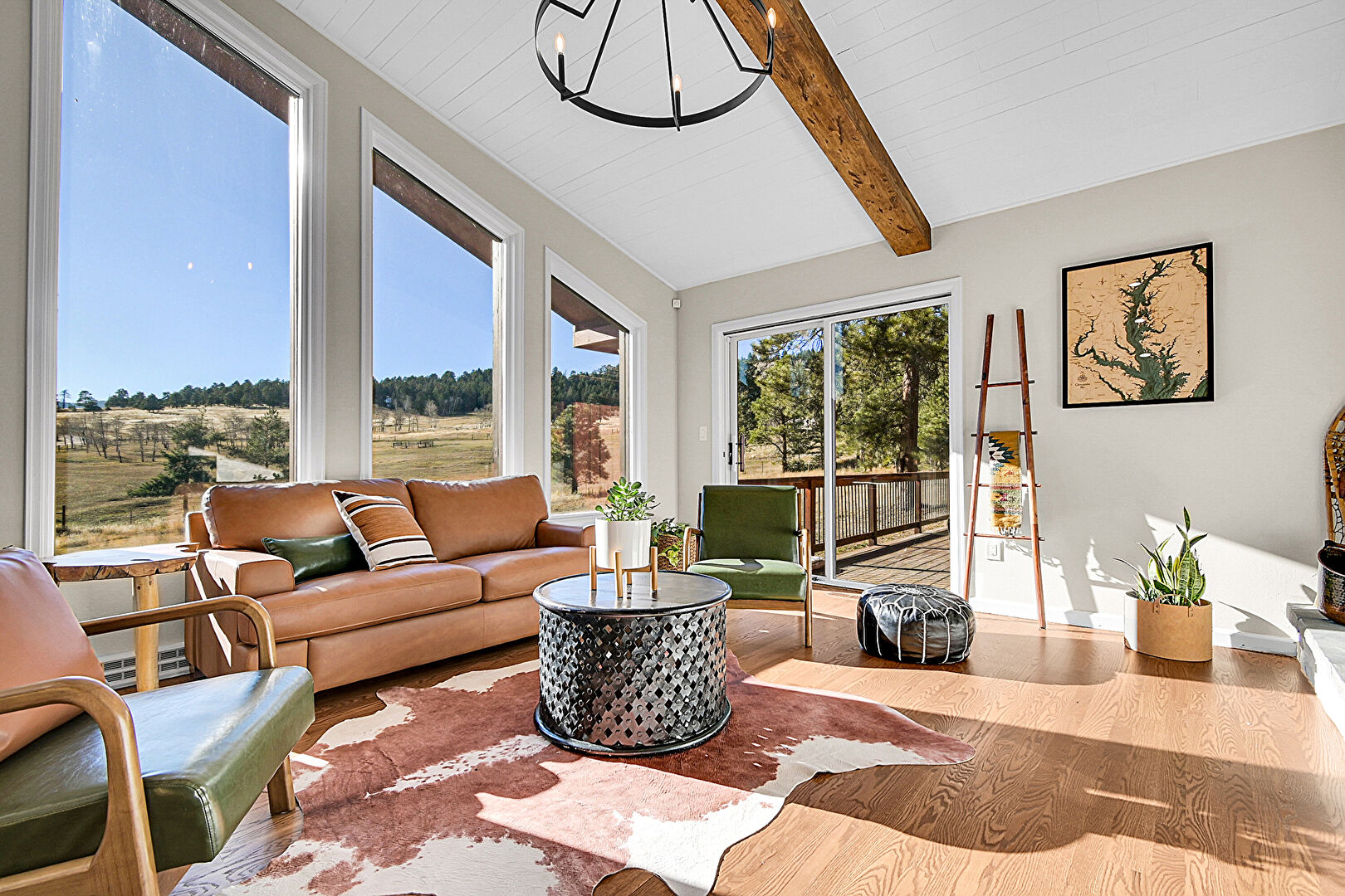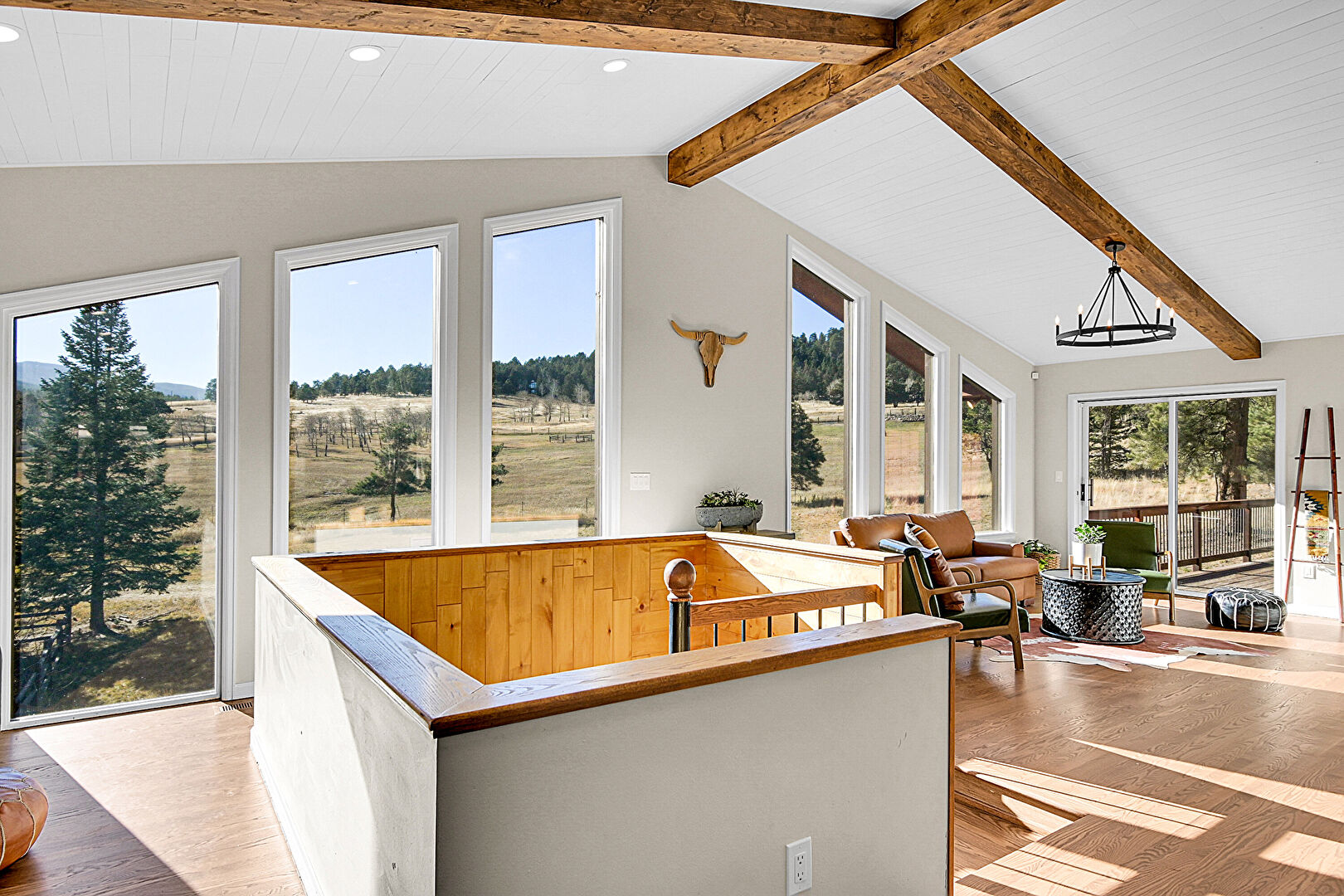 Beamed Ceiling, Natural Light, Rural View, Notable Chandelier