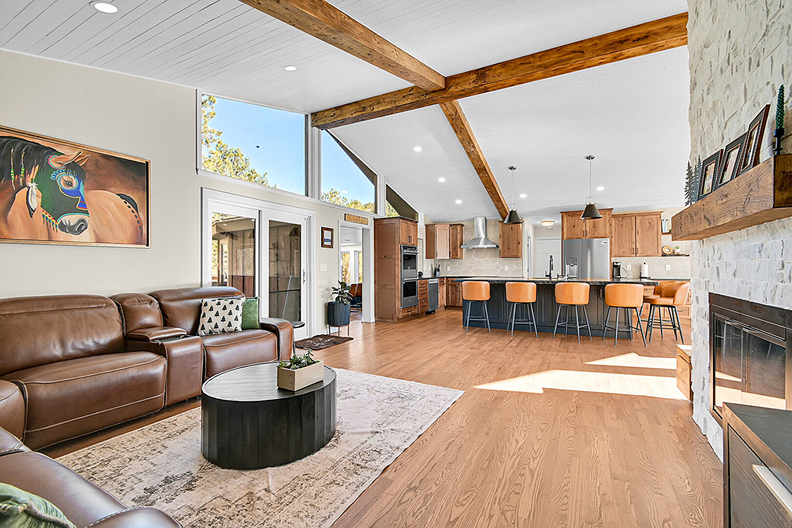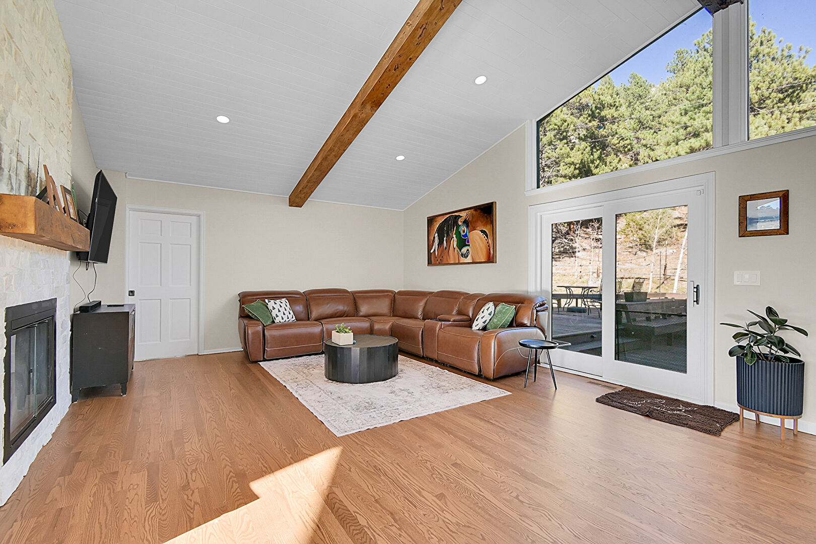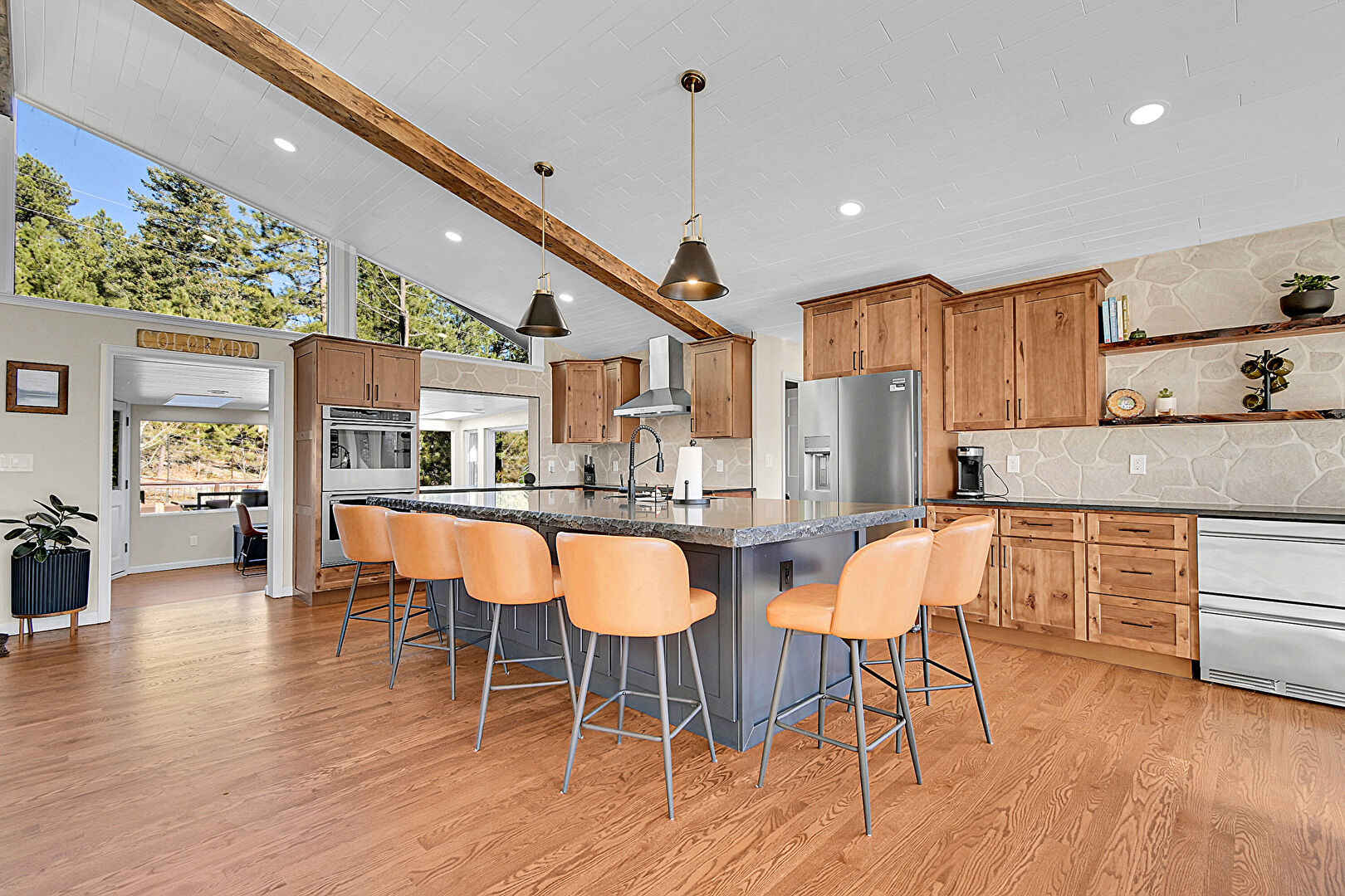 Baseboard Radiator, Baseboards Wall, Beamed Ceiling, Cathedral Ceiling, Drywall, Fireplace, Forest View, High Ceiling, L Shaped Kitchen, Natural Light, Notable Chandelier, Recessed Lighting, Stone Wall, Sunroom, Upstairs Landing, Vaulted Ceiling, Vent, Wood Ceiling, Wood Finish Floor, Baseboards Wall, Beamed Ceiling, Double Oven, Drywall, Recessed Lighting, Vaulted Ceiling, Wood Ceiling, Wood Finish Floor
