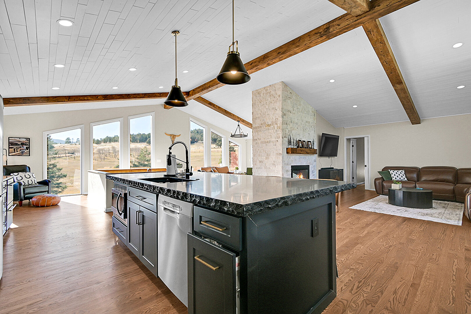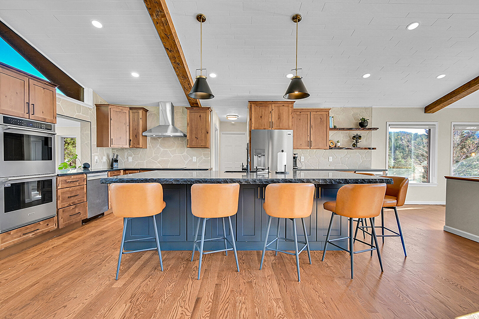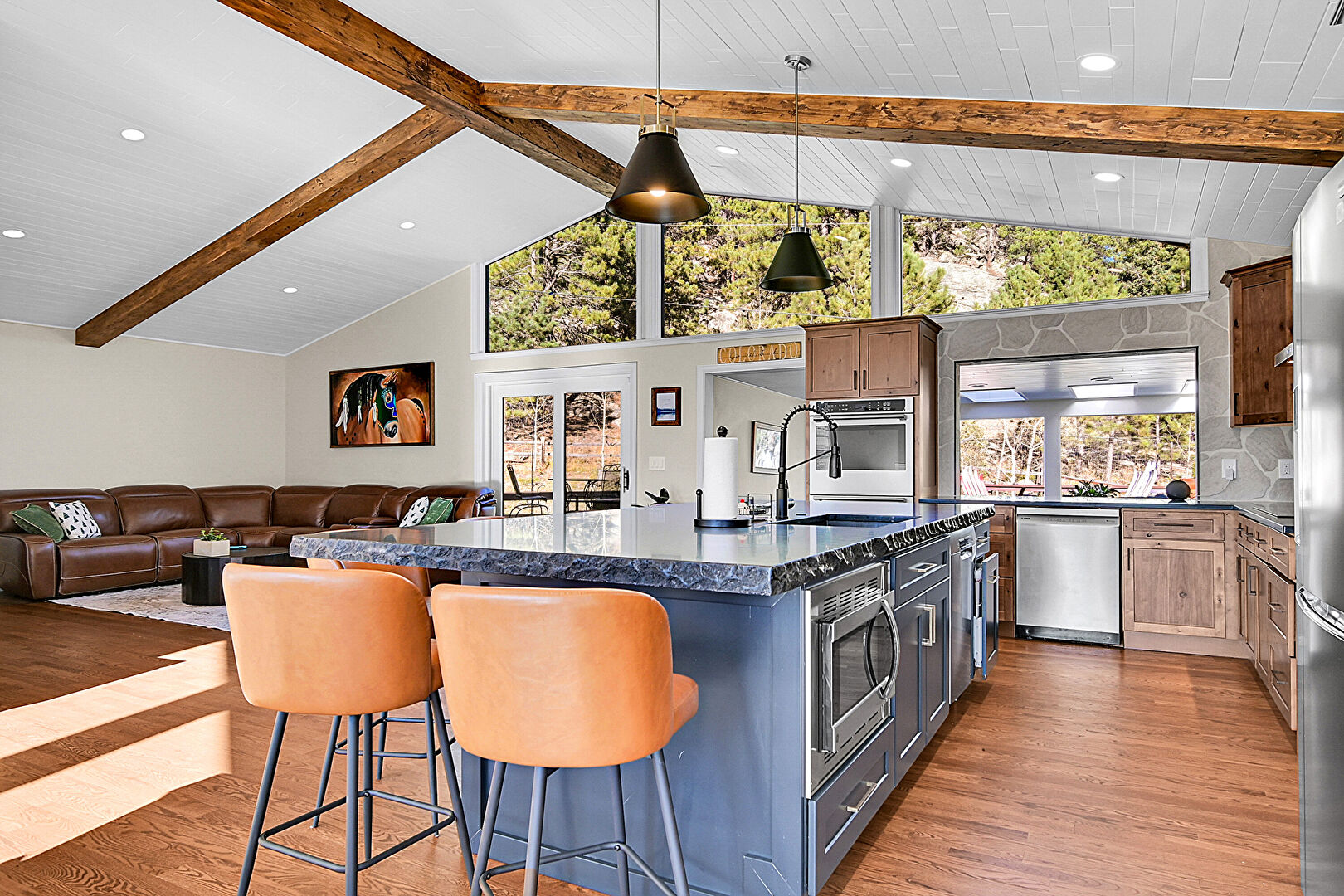 Baseboards Wall, Beamed Ceiling, Black Cabinets, Blue Cabinets, Cathedral Ceiling, Crown Molding Cabinets, Double Oven, Drywall, Fireplace, Gray Cabinets, High Ceiling, Kitchen Bar, Kitchen Island, L Shaped Kitchen, Medium Brown Cabinets, Natural Light, Notable Chandelier, Open Shelves, Opens To Living Area, Pendant Lighting, Recessed Lighting, Shaker Cabinets, Stone Countertops, Vaulted Ceiling, Vent, Warming Drawer, Wood Finish Floor, Beamed Ceiling, Cathedral Ceiling, Crown Molding Cabinets, High Ceiling, Open Shelves, Pendant Lighting, Recessed Lighting, Stone Countertops, Trash Compactor