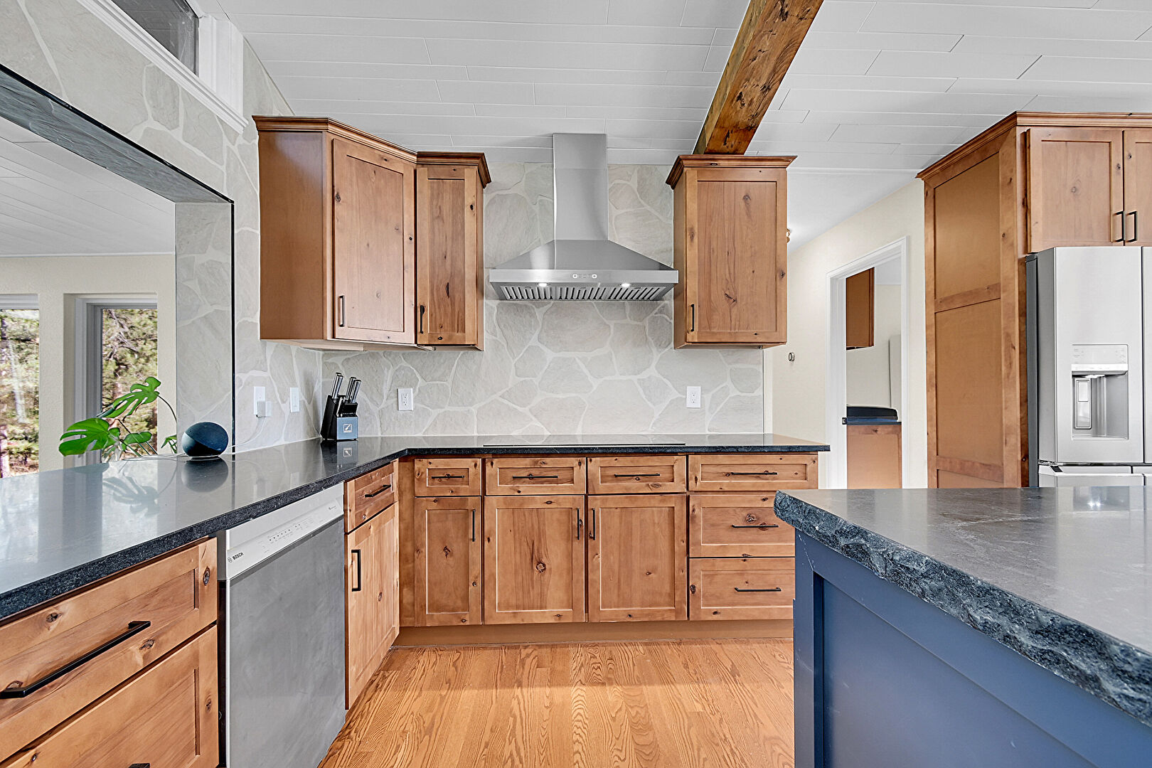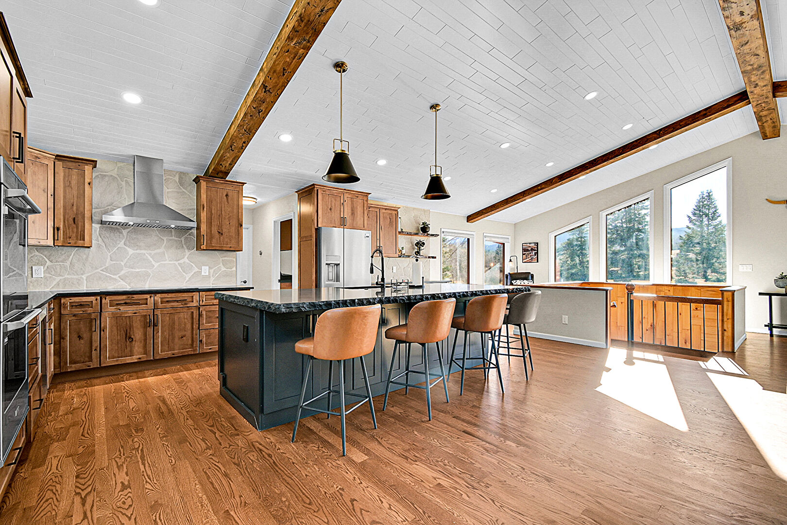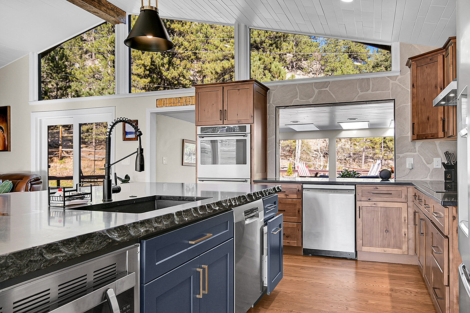 Baseboards Wall, Beamed Ceiling, Black Cabinets, Blue Cabinets, Cathedral Ceiling, Crown Molding Cabinets, Double Oven, Drywall, Fireplace, Gray Cabinets, High Ceiling, Kitchen Bar, Kitchen Island, L Shaped Kitchen, Medium Brown Cabinets, Natural Light, Notable Chandelier, Open Shelves, Opens To Living Area, Pendant Lighting, Recessed Lighting, Shaker Cabinets, Stone Countertops, Vaulted Ceiling, Vent, Warming Drawer, Wood Finish Floor, Beamed Ceiling, Cathedral Ceiling, Crown Molding Cabinets, High Ceiling, Open Shelves, Pendant Lighting, Recessed Lighting, Stone Countertops, Trash Compactor