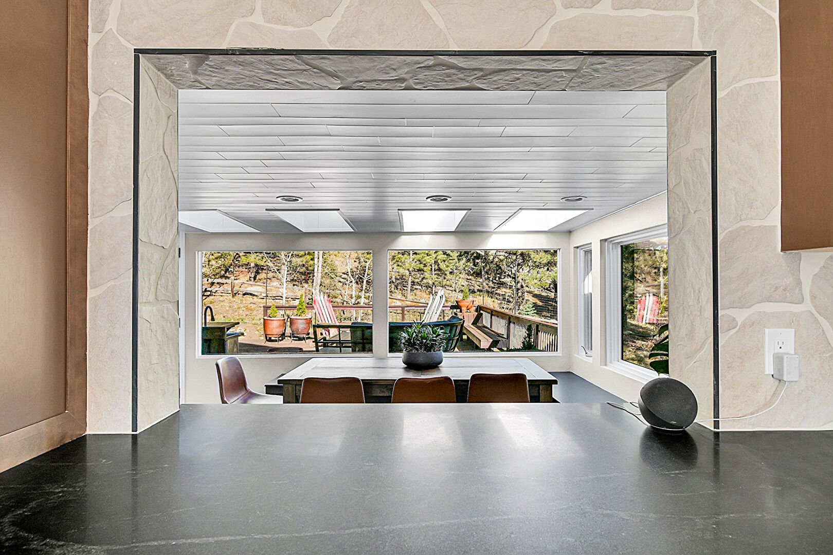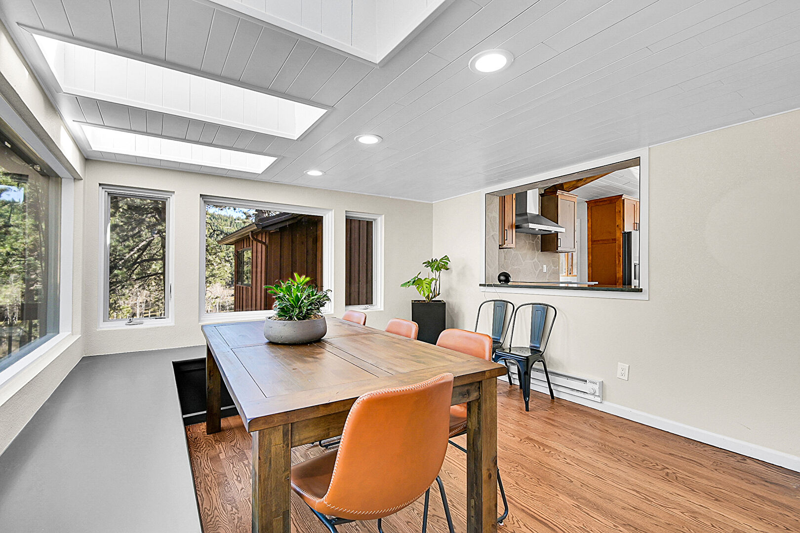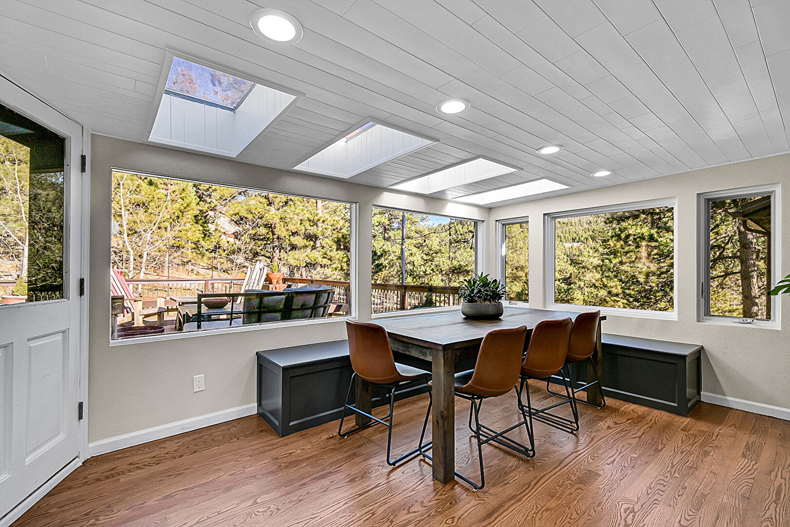 Baseboard Radiator, Baseboards Wall, Drywall, Natural Light, Outdoor Dining Area, Recessed Lighting, Skylight, Sunroom, Wood Ceiling, Wood Finish Floor, Baseboards Wall, Sunroom, Wood Finish Floor