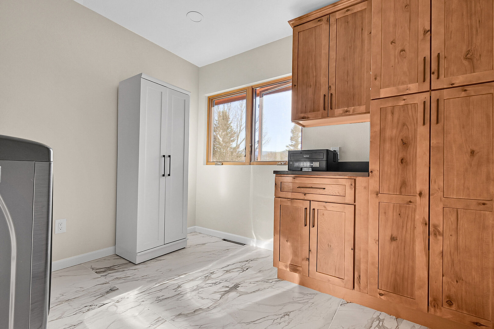 Arched Walkways, Baseboards Wall, Crown Molding Cabinets, Drywall, Laundry, Marble Finish Floor, Medium Brown Cabinets, Natural Light, Shaker Cabinets, Washer Dryer, Baseboards Wall, Marble Finish Floor