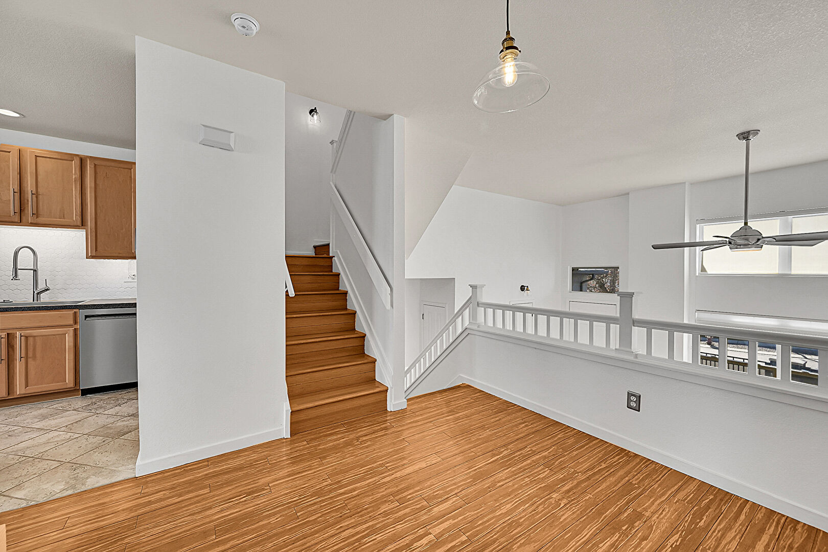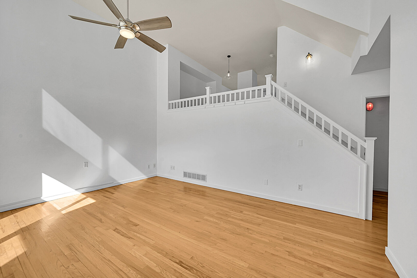 Baseboards Wall, Ceiling Fan, High Ceiling, Natural Light, Stairs, Textured Wall, Vaulted Ceiling, Vent, Wood Finish Floor, Baseboards Wall, Drywall