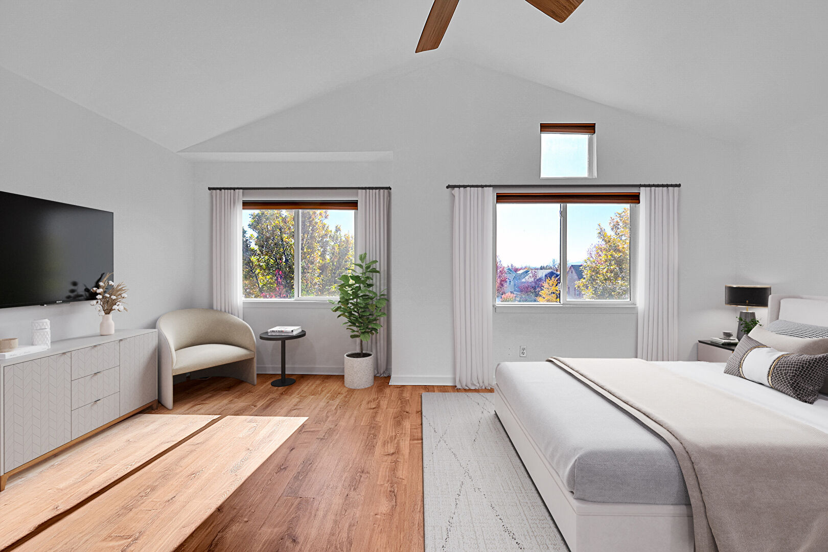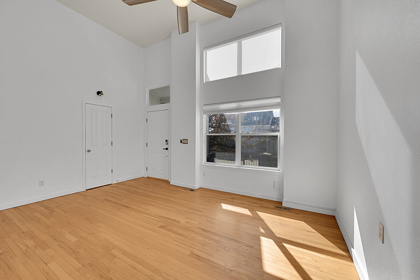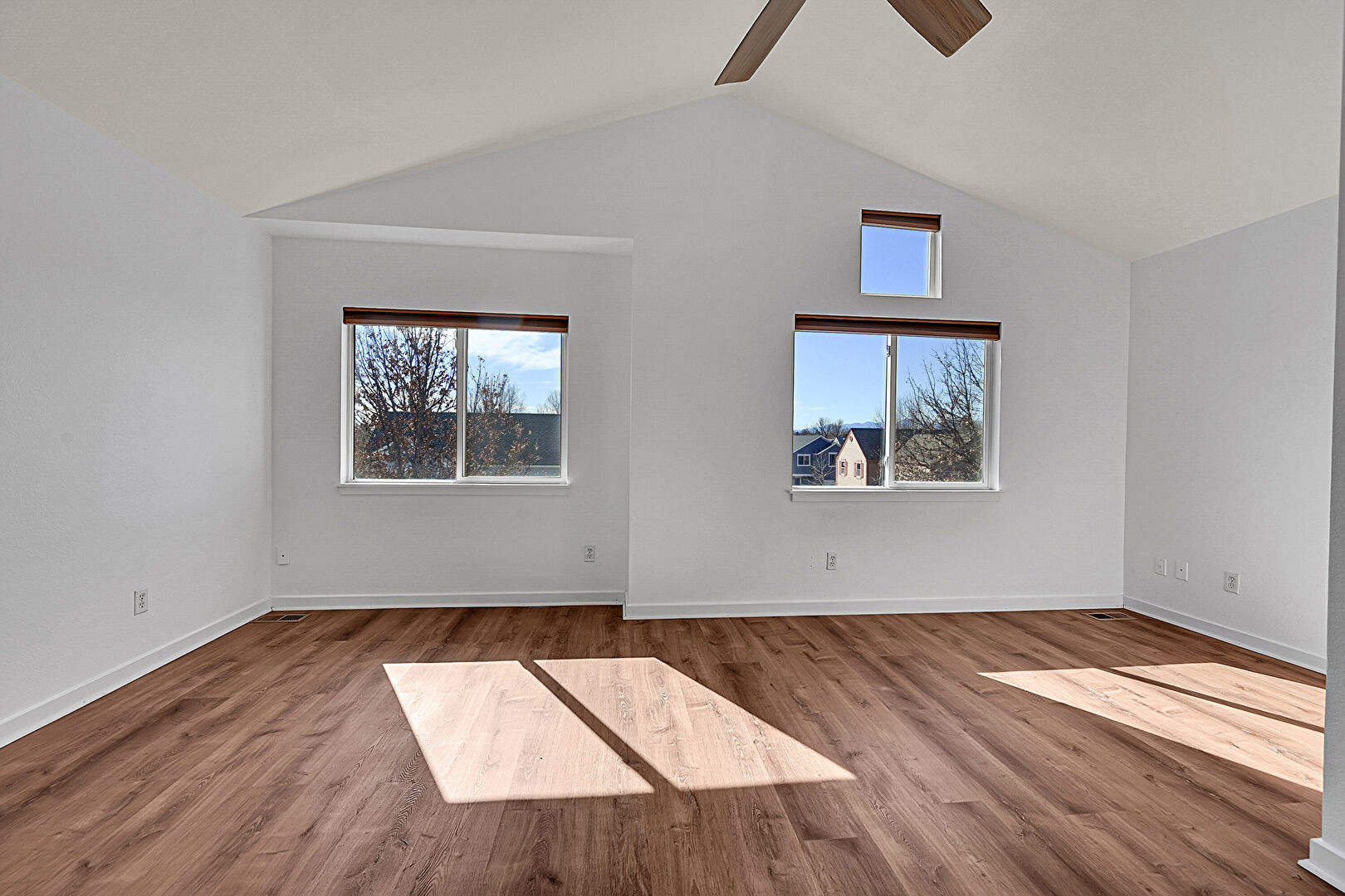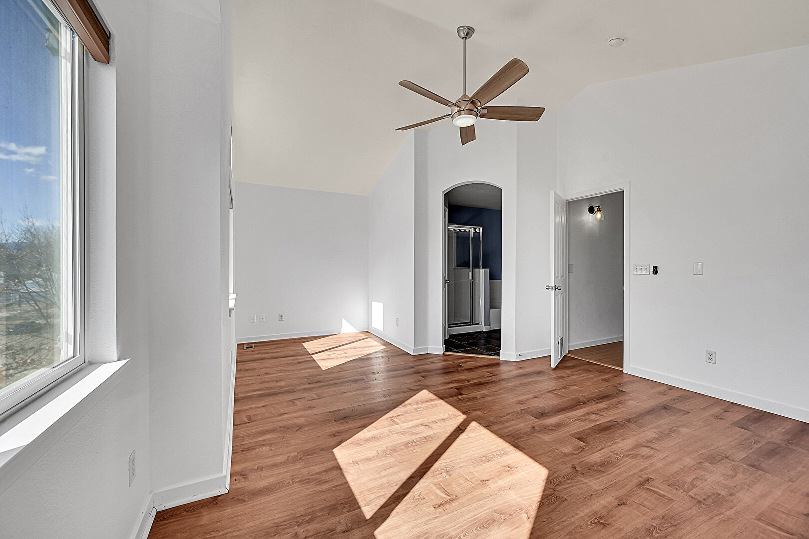 Baseboards Wall, Ceiling Fan, Drywall, High Ceiling, Natural Light, Vaulted Ceiling, Wood Finish Floor, Arched Walkways, Ceiling Fan