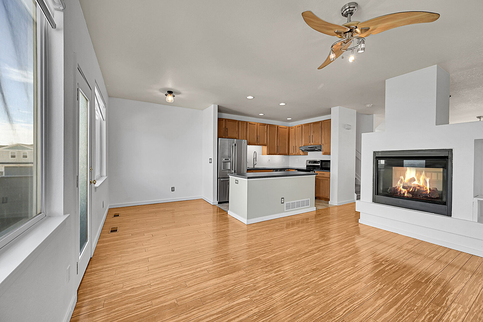 Baseboards Wall, Built In Shelves, Ceiling Fan, Drywall, Fireplace, L Shaped Kitchen, Recessed Lighting, Vent, Wood Finish Floor, Drywall, Stairs