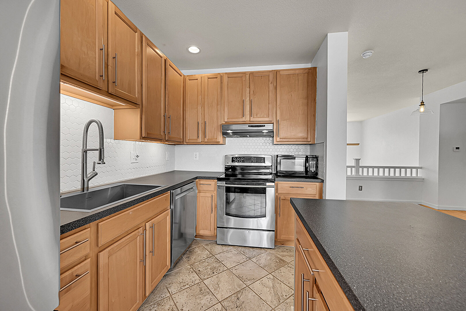 Baseboards Wall, Ceiling Fan, Drywall, Natural Light, Opens To Living Area, Recessed Lighting, Shaker Cabinets, Stone Countertops, Vent, Wood Finish Floor, Kitchen Island, Tile Floor