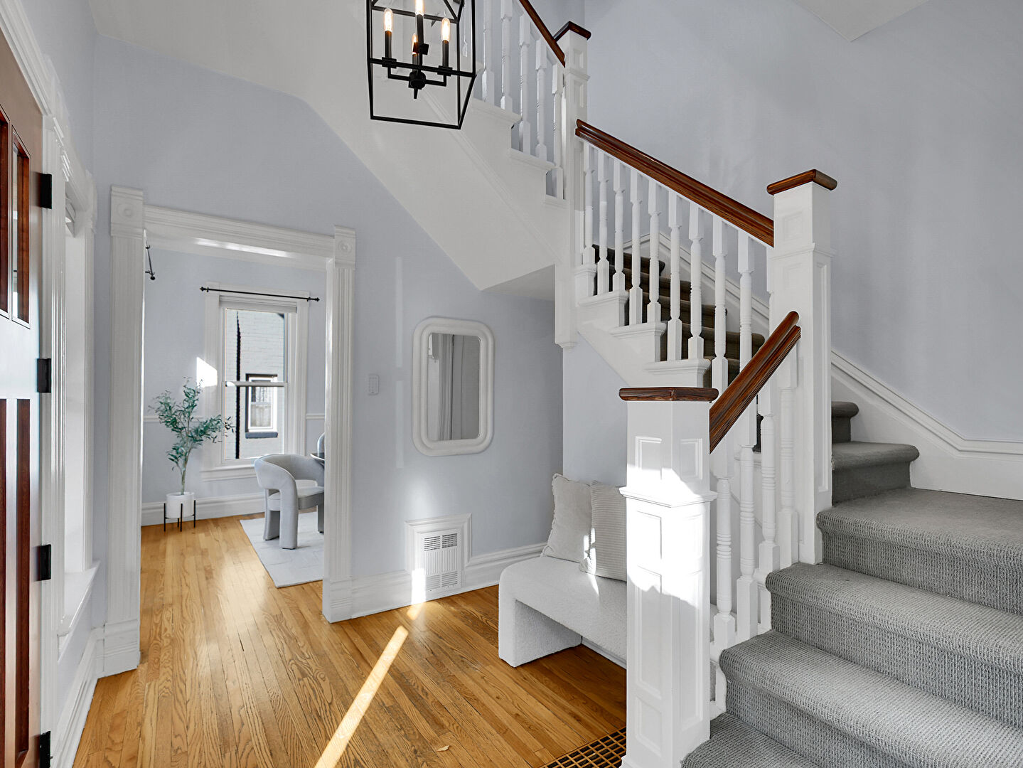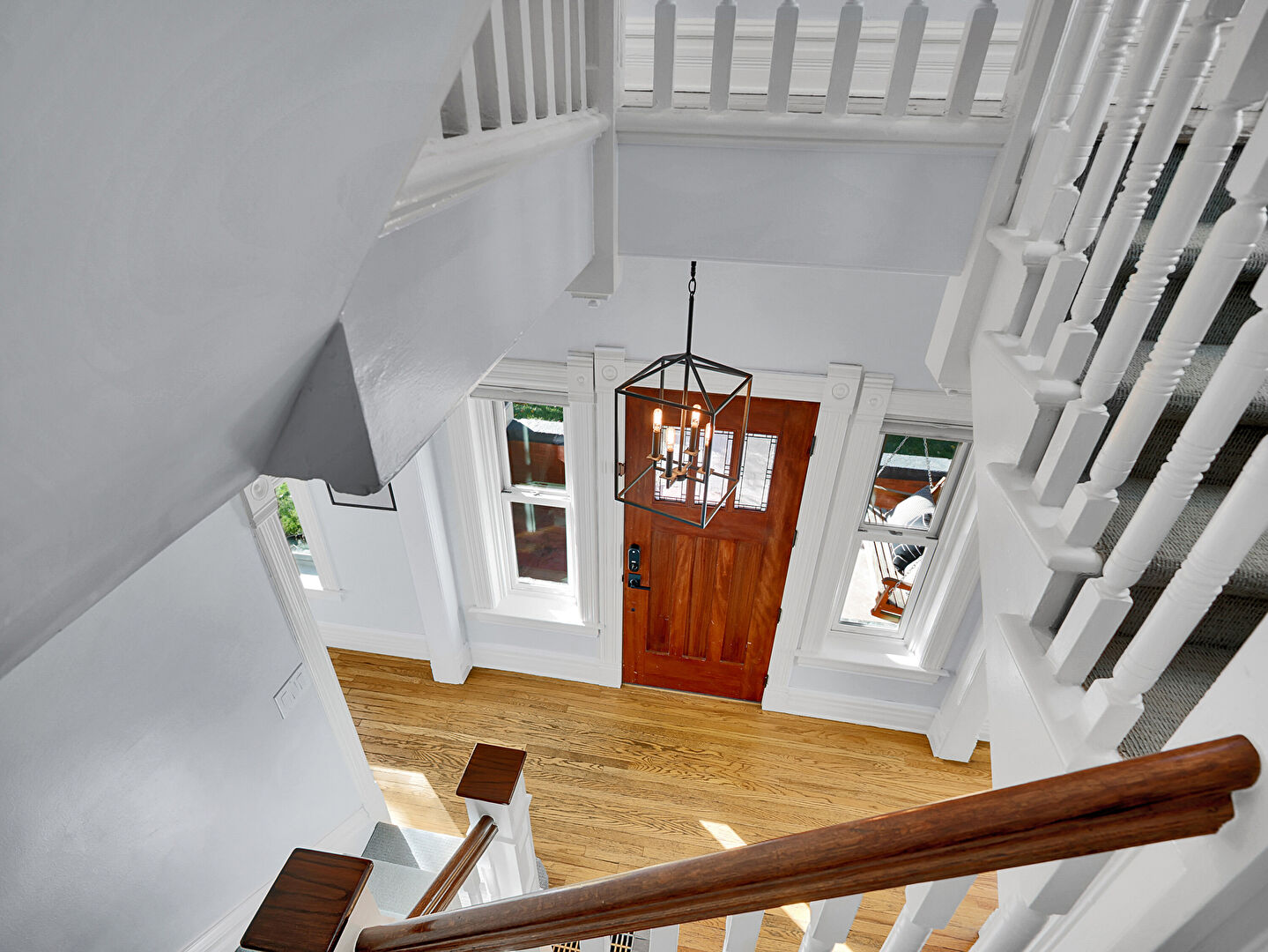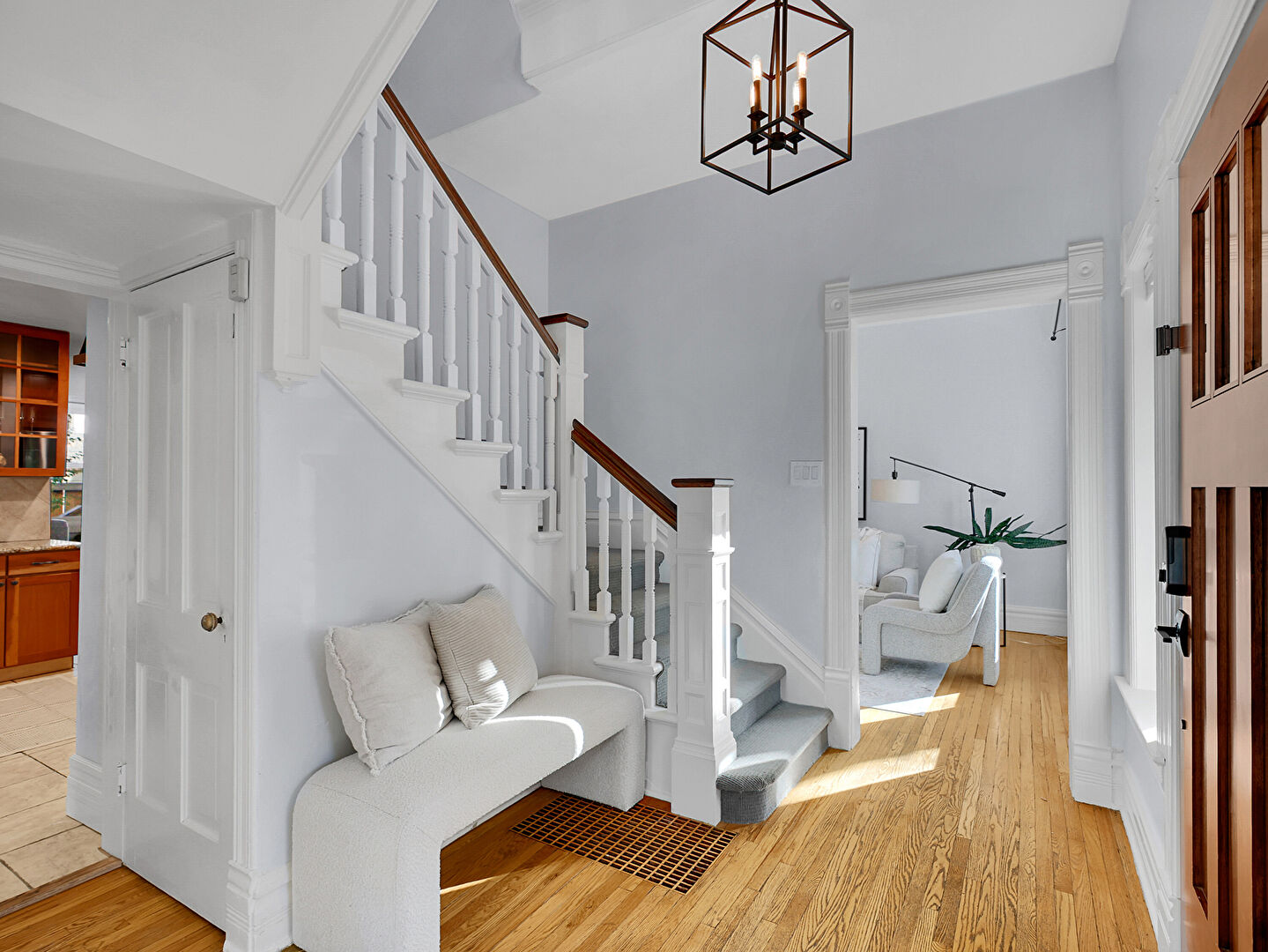 Baseboards Wall, Drywall, High Ceiling, Natural Light, Notable Chandelier, Stairs, Vaulted Ceiling, Wood Finish Floor, Notable Chandelier, Vent