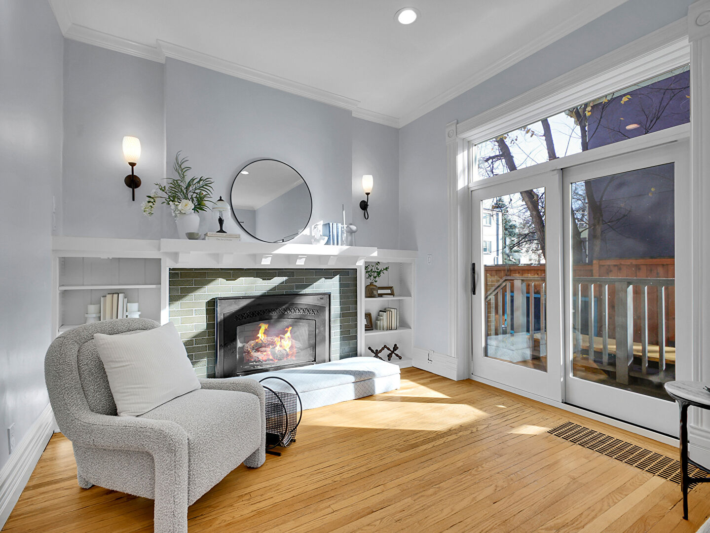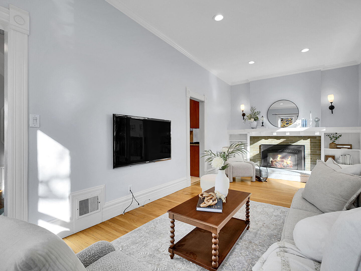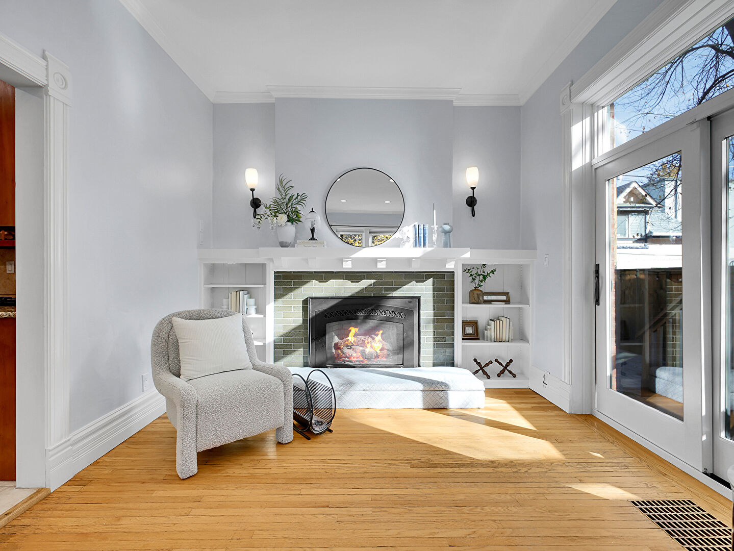 Baseboards Wall, Built In Shelves, Crown Molding, Drywall, Fireplace, Natural Light, Recessed Lighting, Vent, Wood Finish Floor, Baseboards Wall, Drywall, Recessed Lighting, Wood Finish Floor