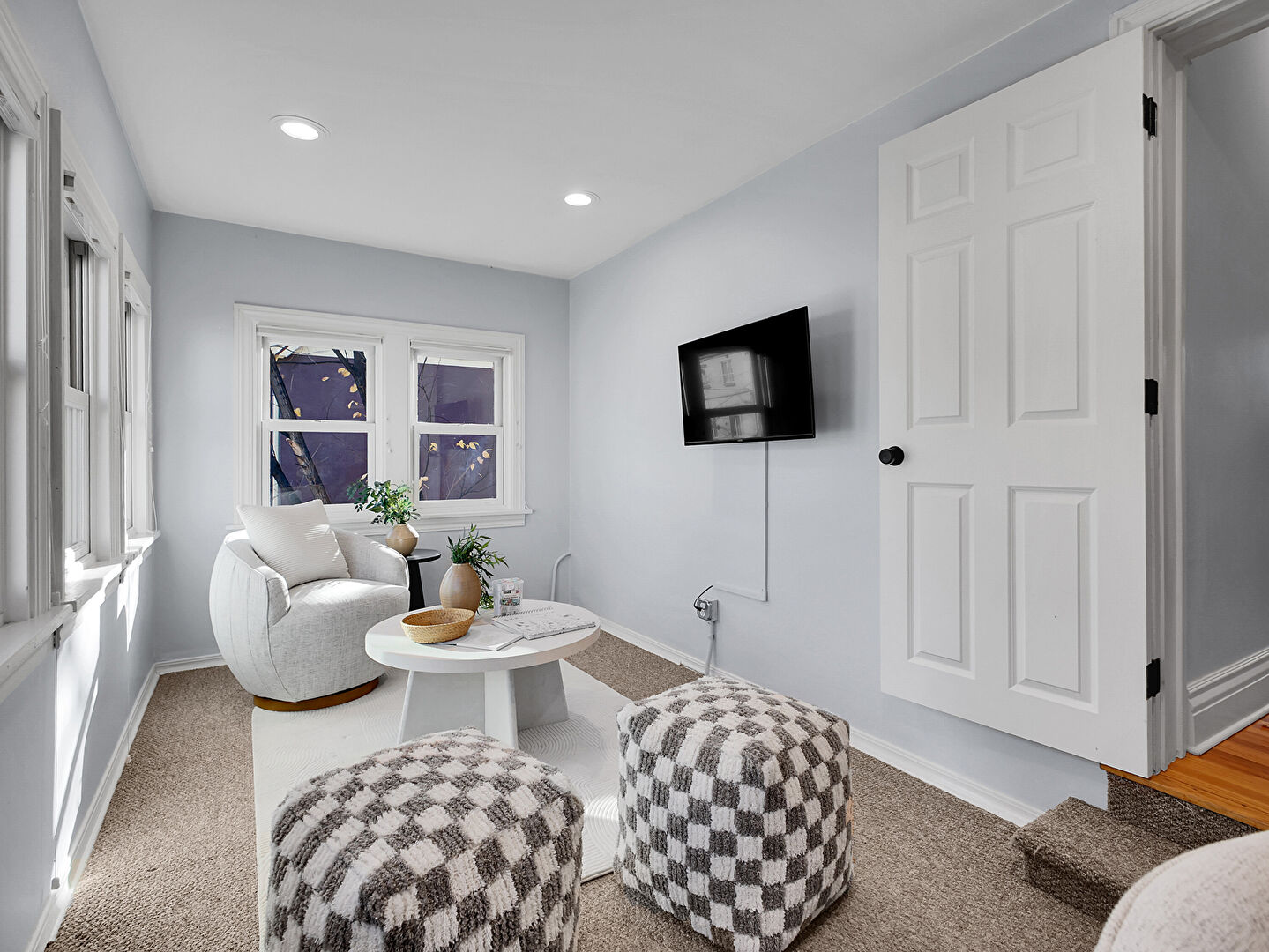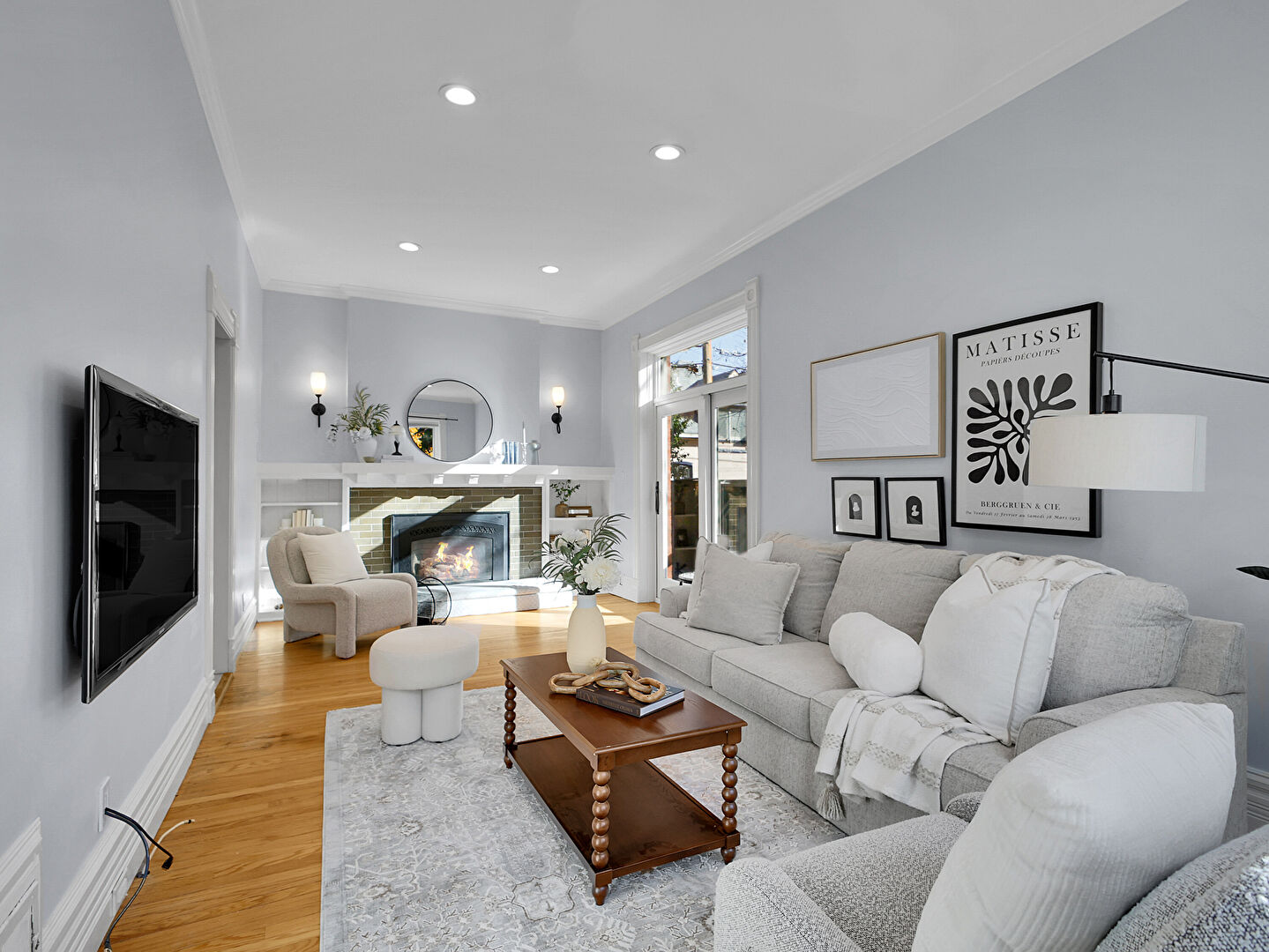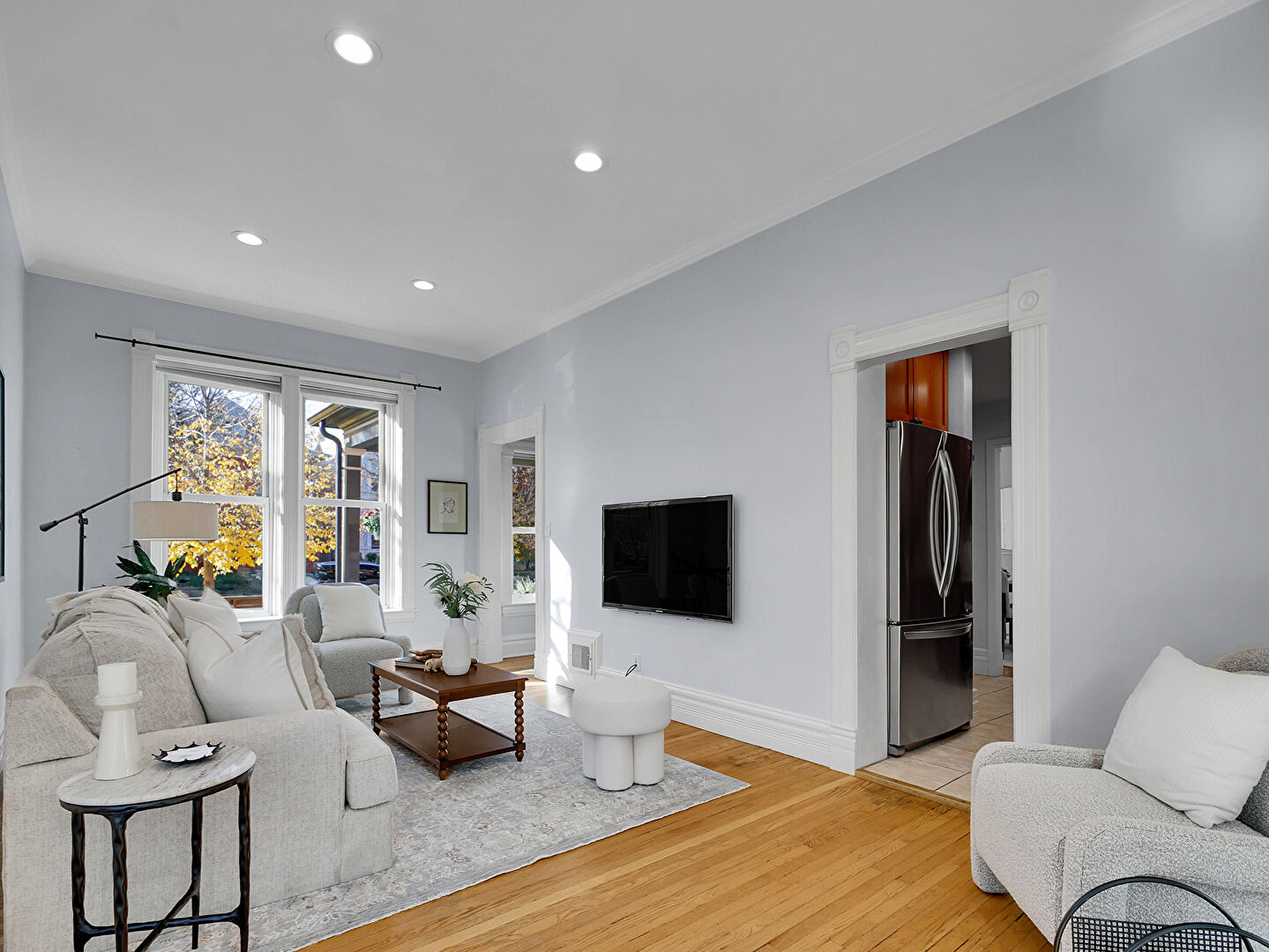 Baseboards Wall, Built In Shelves, Crown Molding, Drywall, Fireplace, Natural Light, Recessed Lighting, Vent, Wood Finish Floor, Baseboards Wall, Drywall, Recessed Lighting, Wood Finish Floor