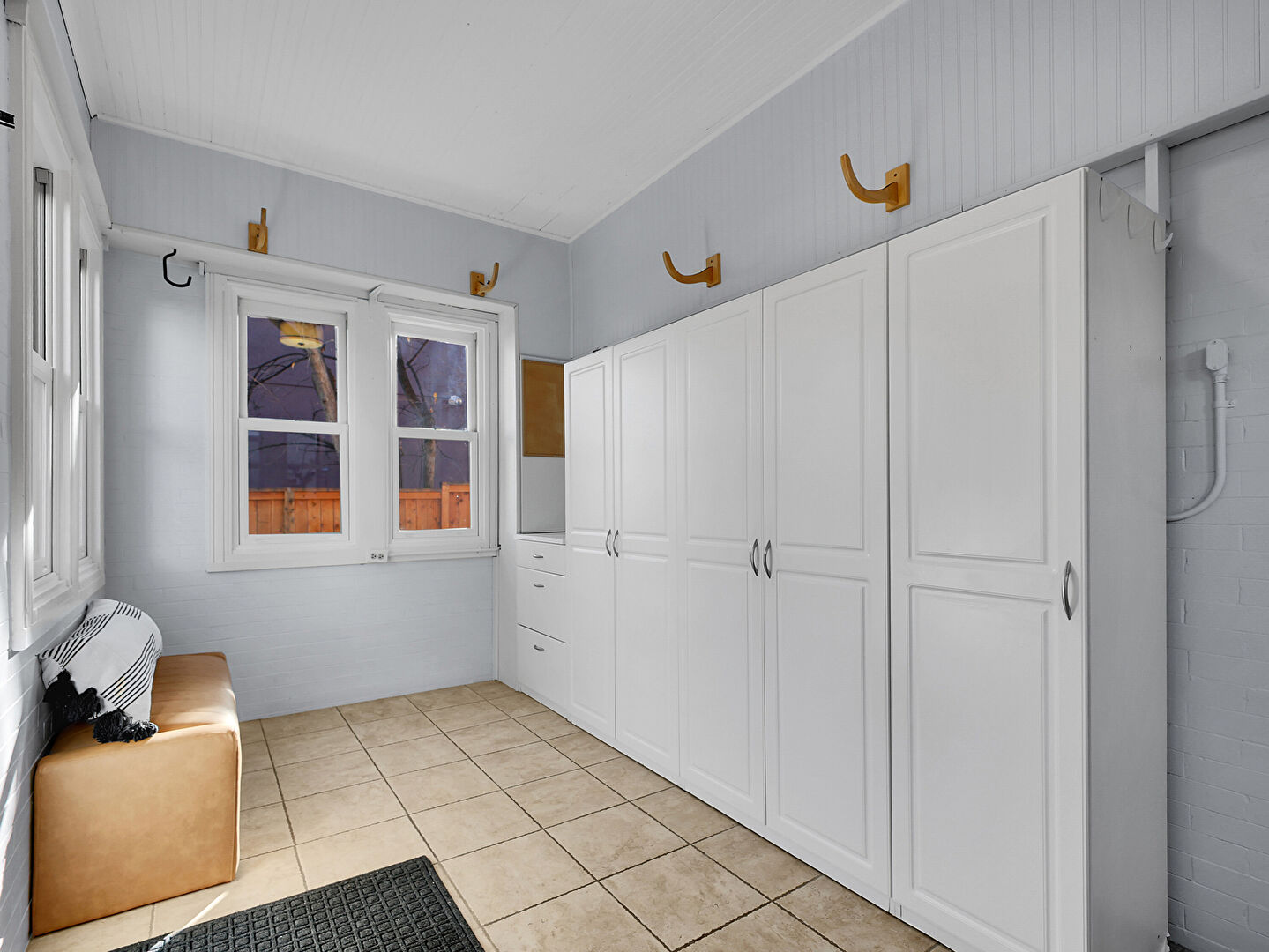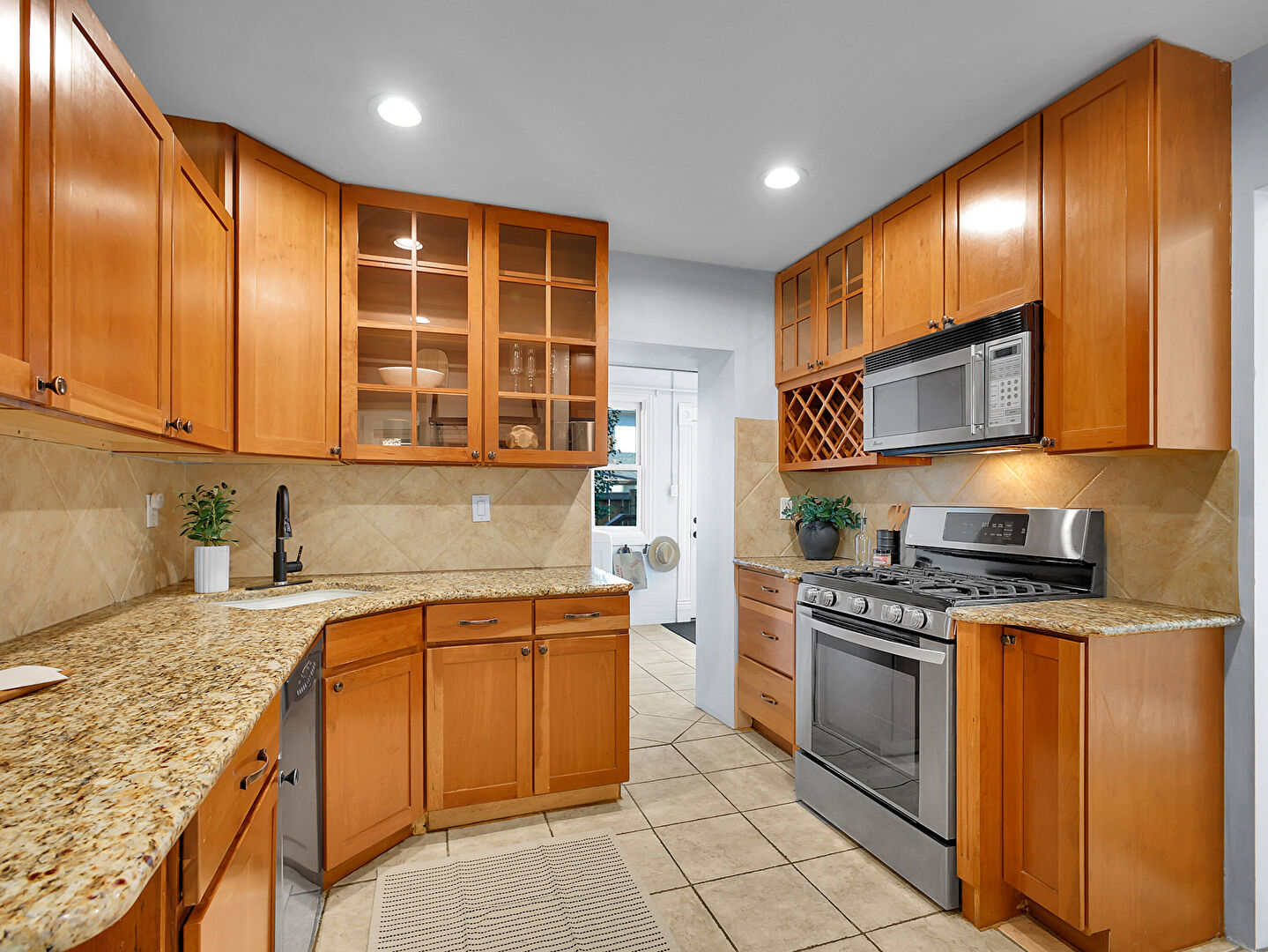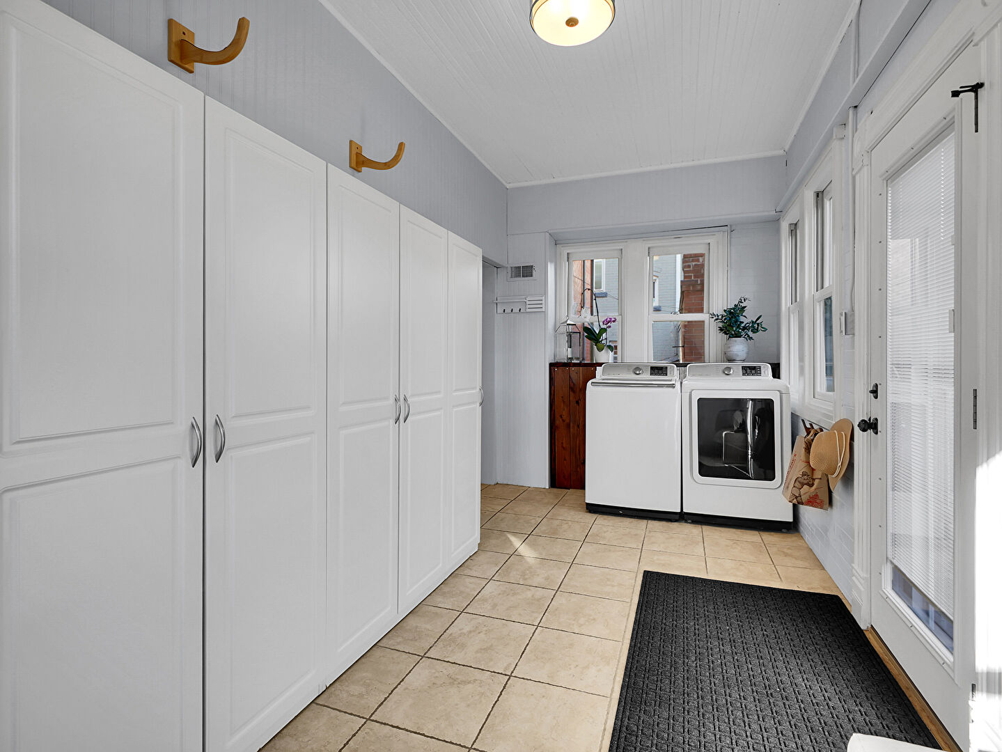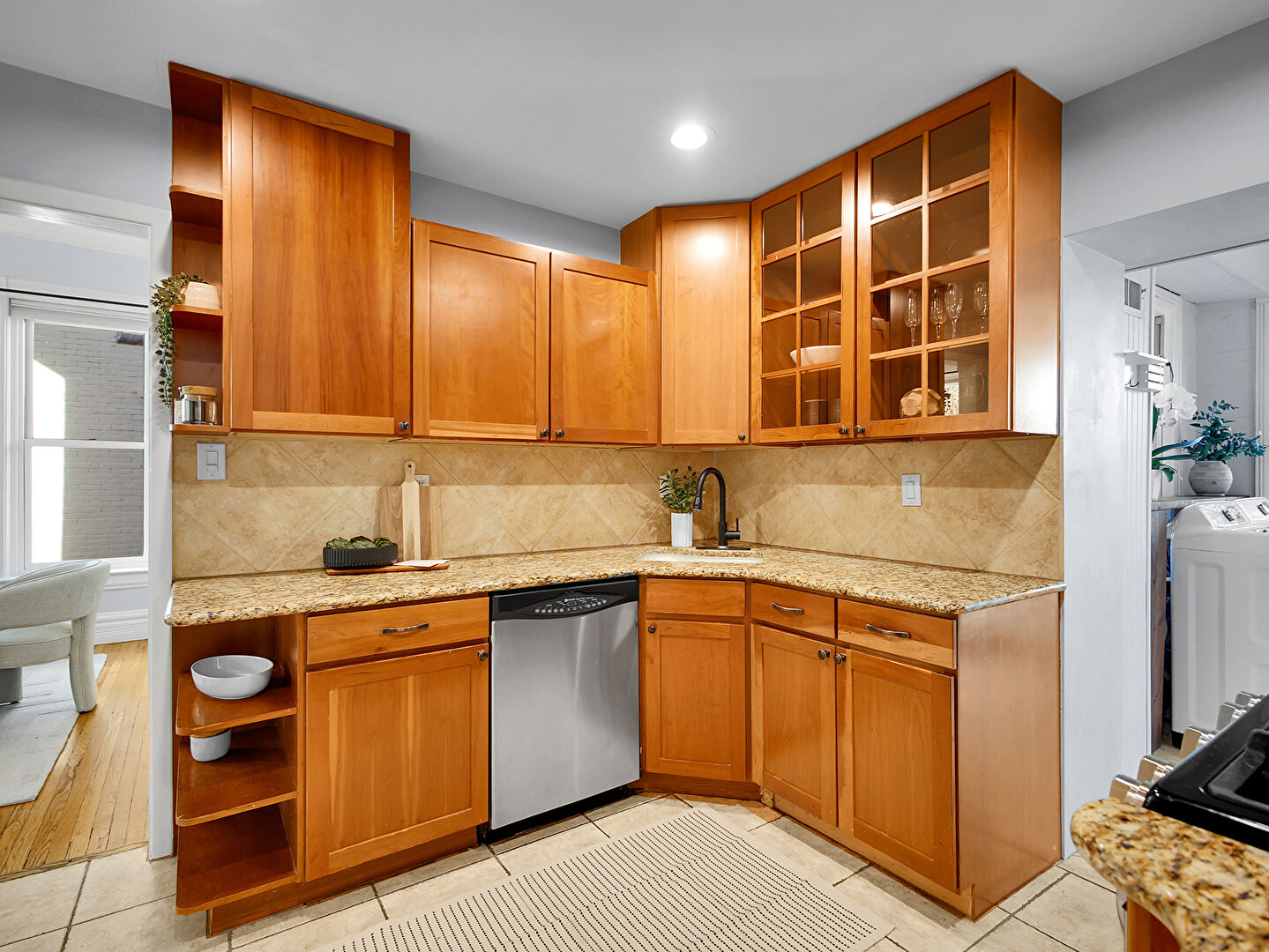 Baseboards Wall, Drywall, Glass Insert Cabinets, Laundry, Medium Brown Cabinets, Natural Light, Open Shelves, Recessed Lighting, Shaker Cabinets, Stone Countertops, Tile Floor, Vent, Medium Brown Cabinets, Tile Floor, Washer Dryer