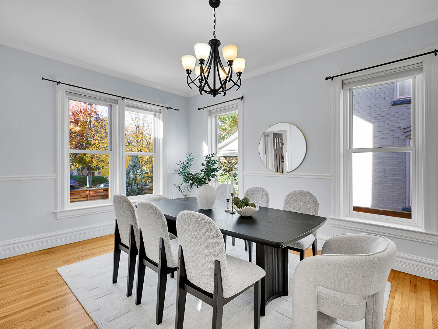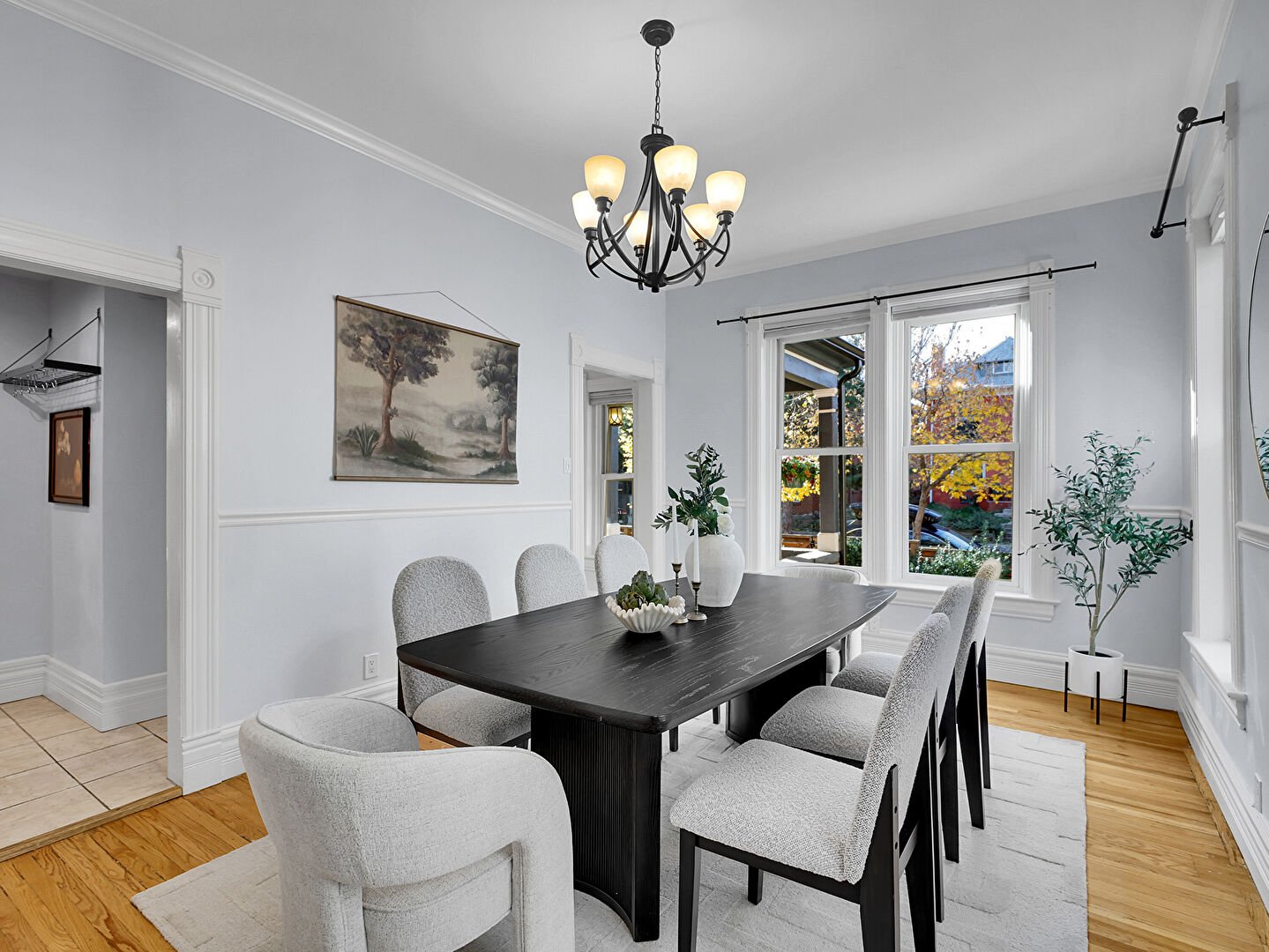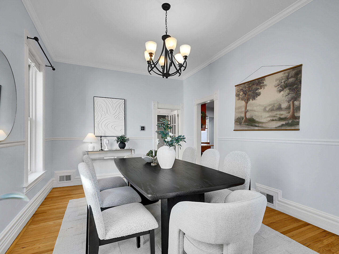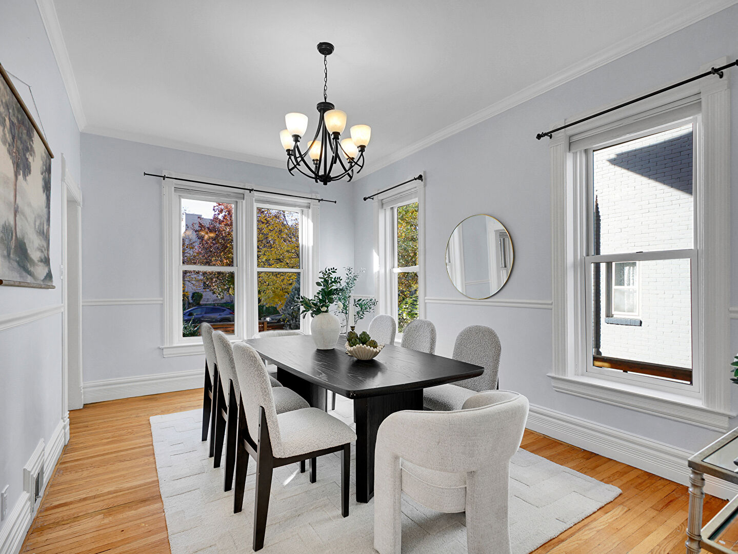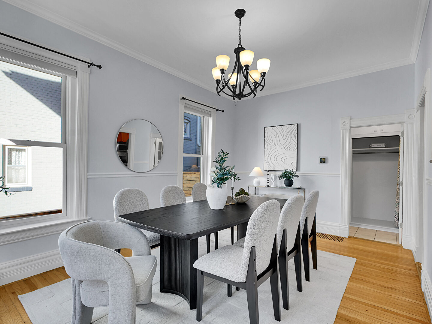 Baseboards Wall, Crown Molding, Drywall, Natural Light, Notable Chandelier, Wood Finish Floor, Baseboards Wall, Notable Chandelier, Vent