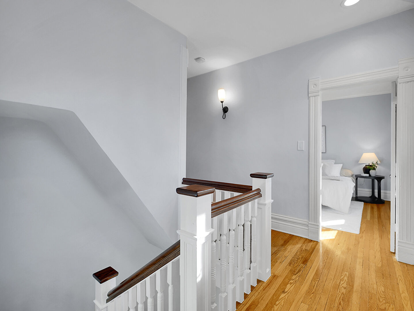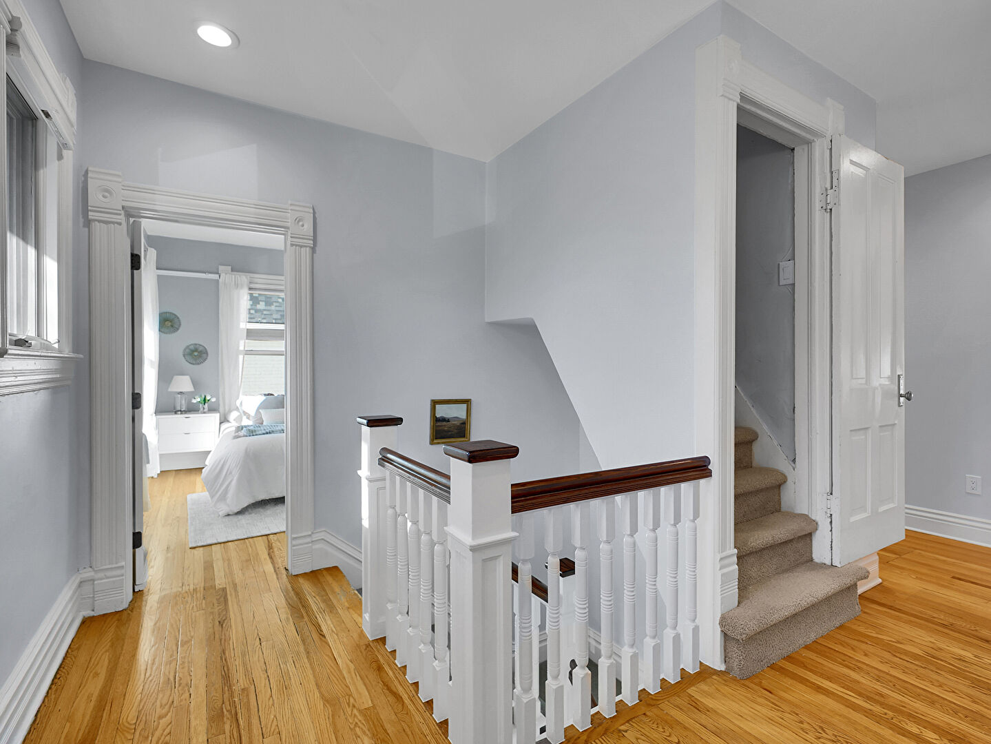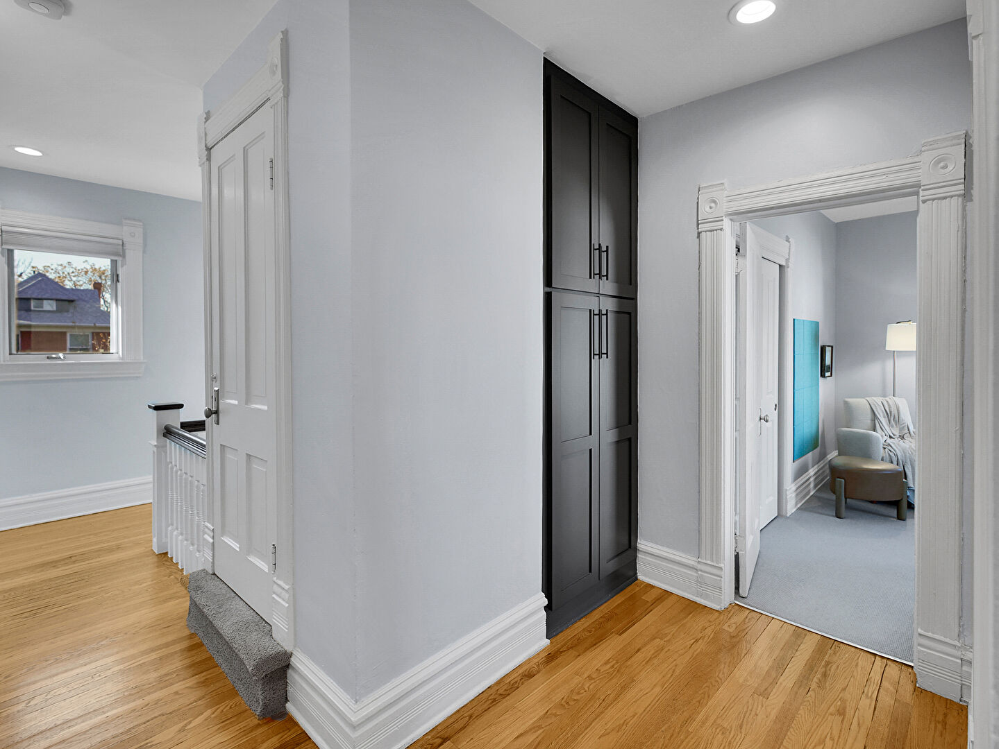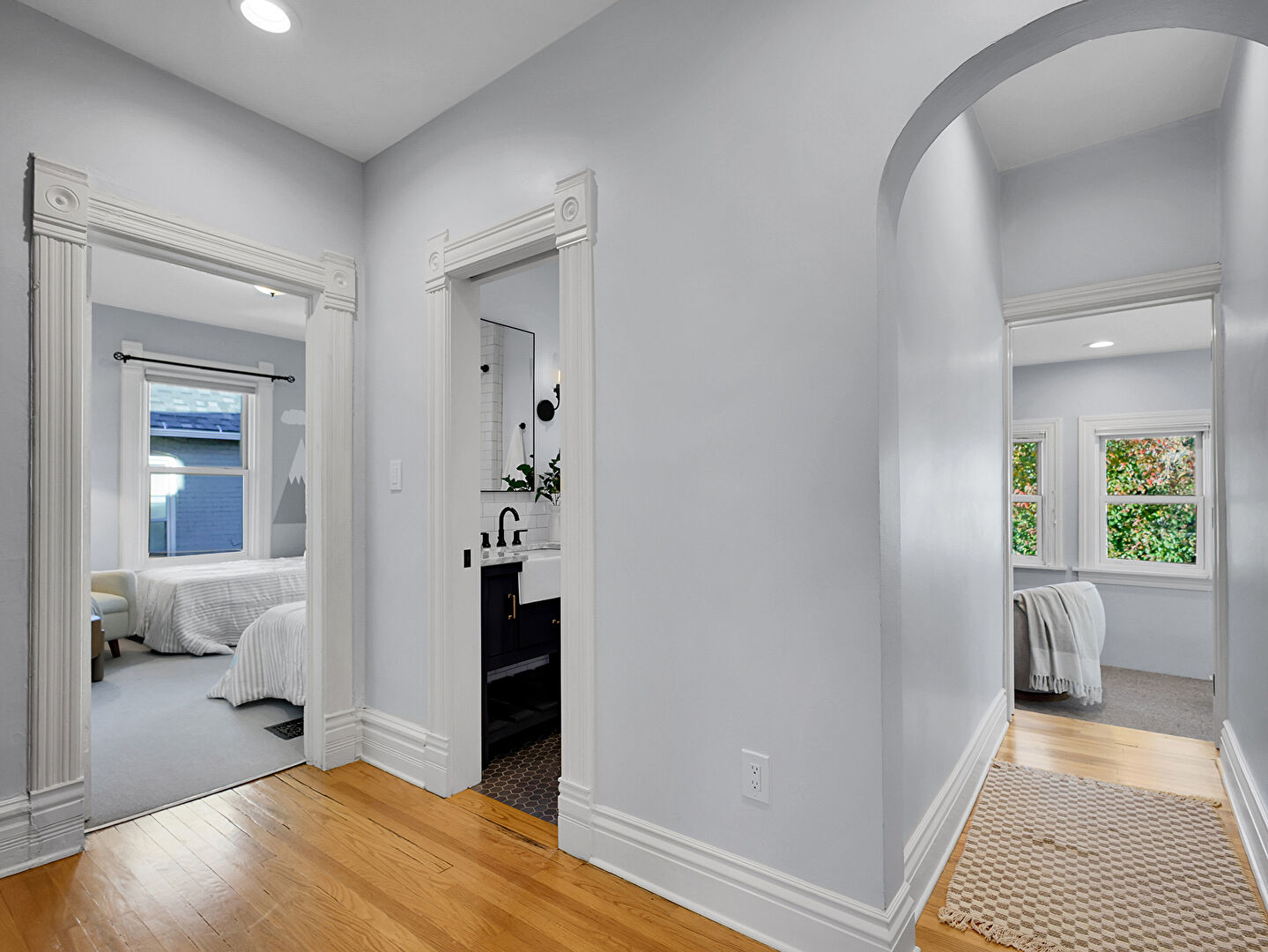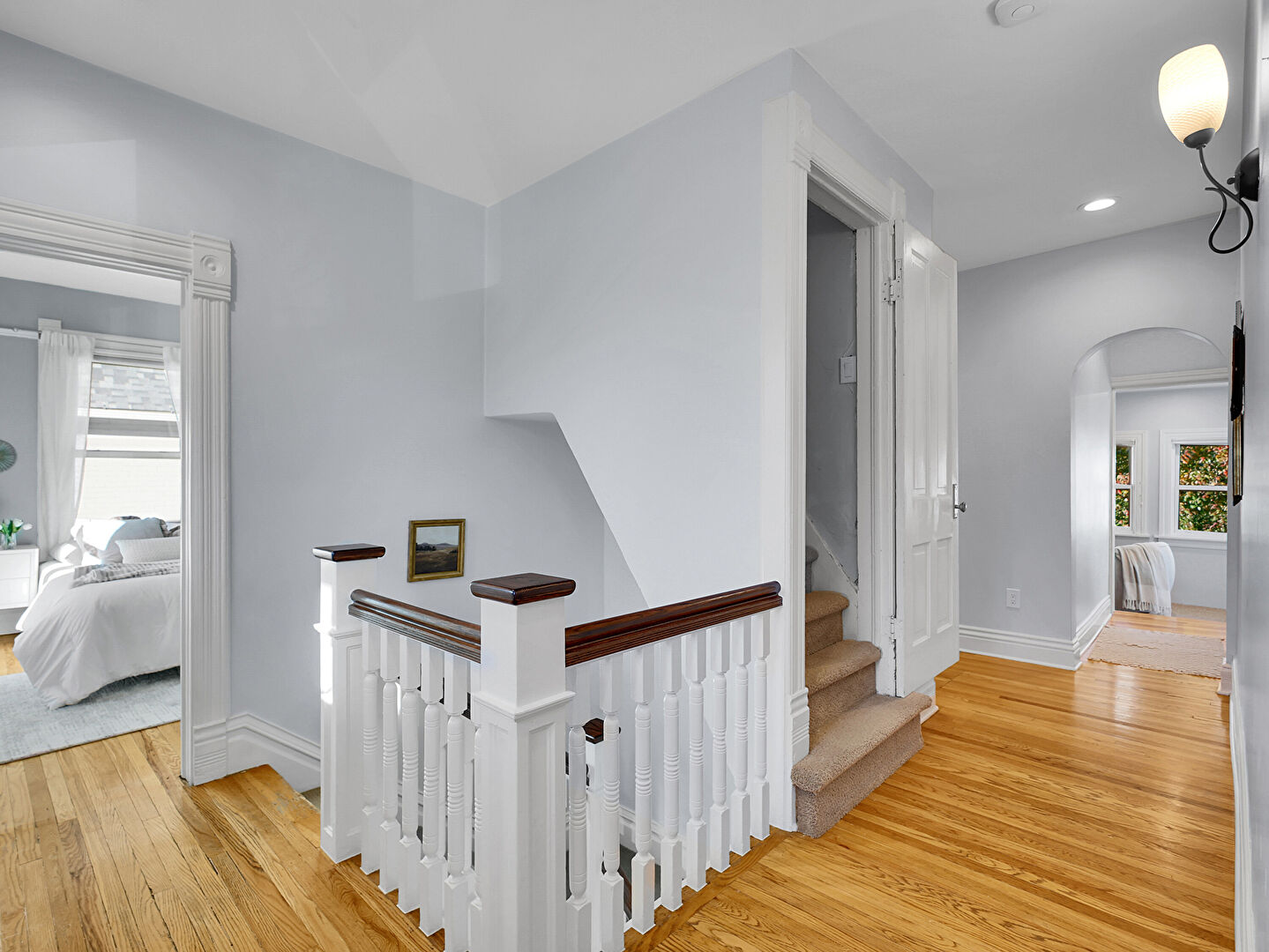 Arched Walkways, Baseboards Wall, Drywall, Natural Light, Recessed Lighting, Stairs, Upstairs Landing, Wood Finish Floor, Baseboards Wall, Drywall, Recessed Lighting, Wood Finish Floor
