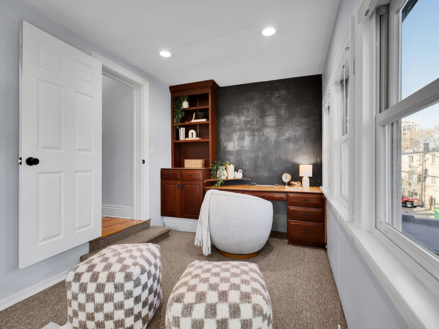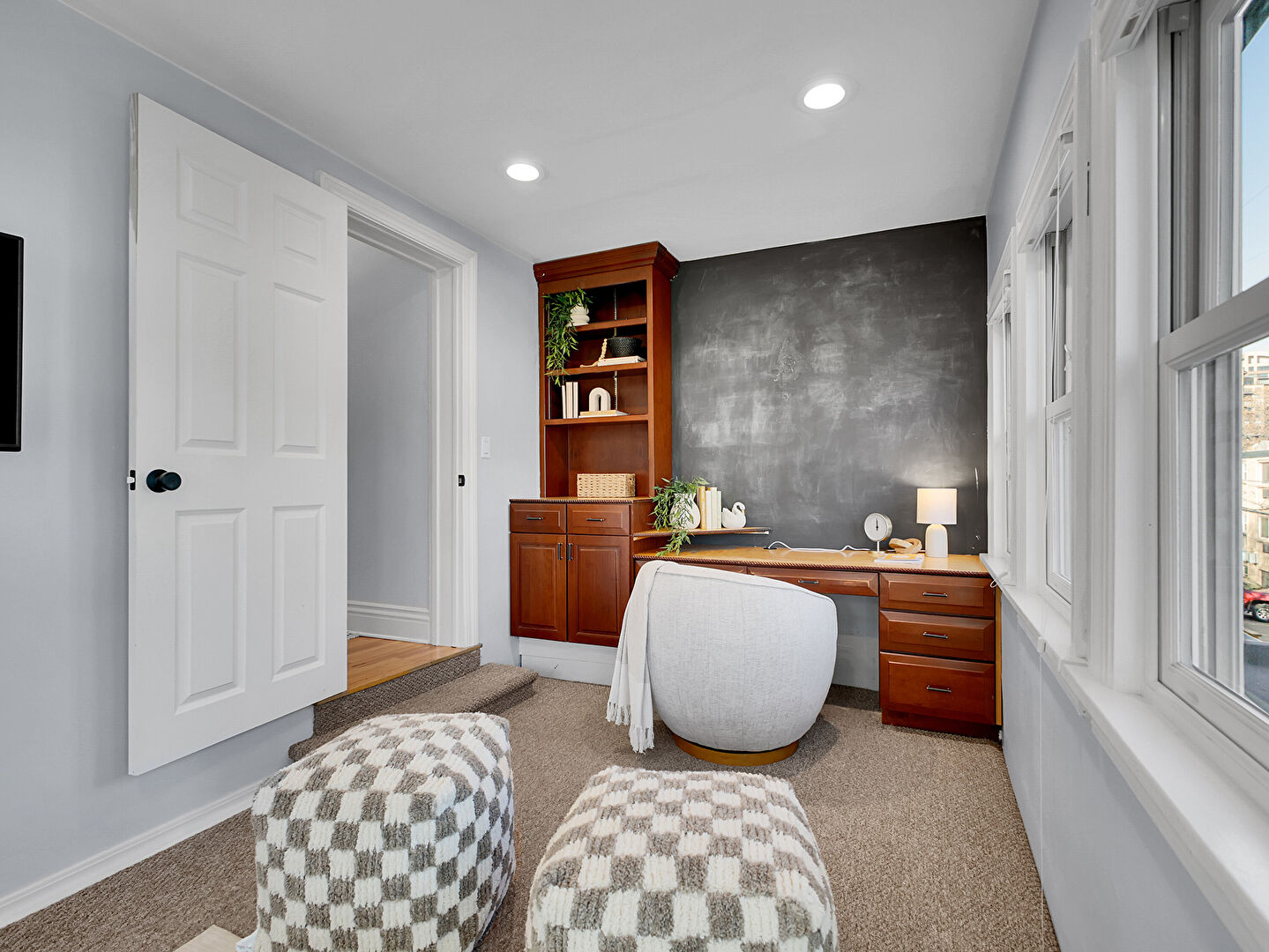 Built In Desk, Carpet, Drywall, Natural Light, Office Area, Recessed Lighting, Baseboards Wall, Recessed Lighting