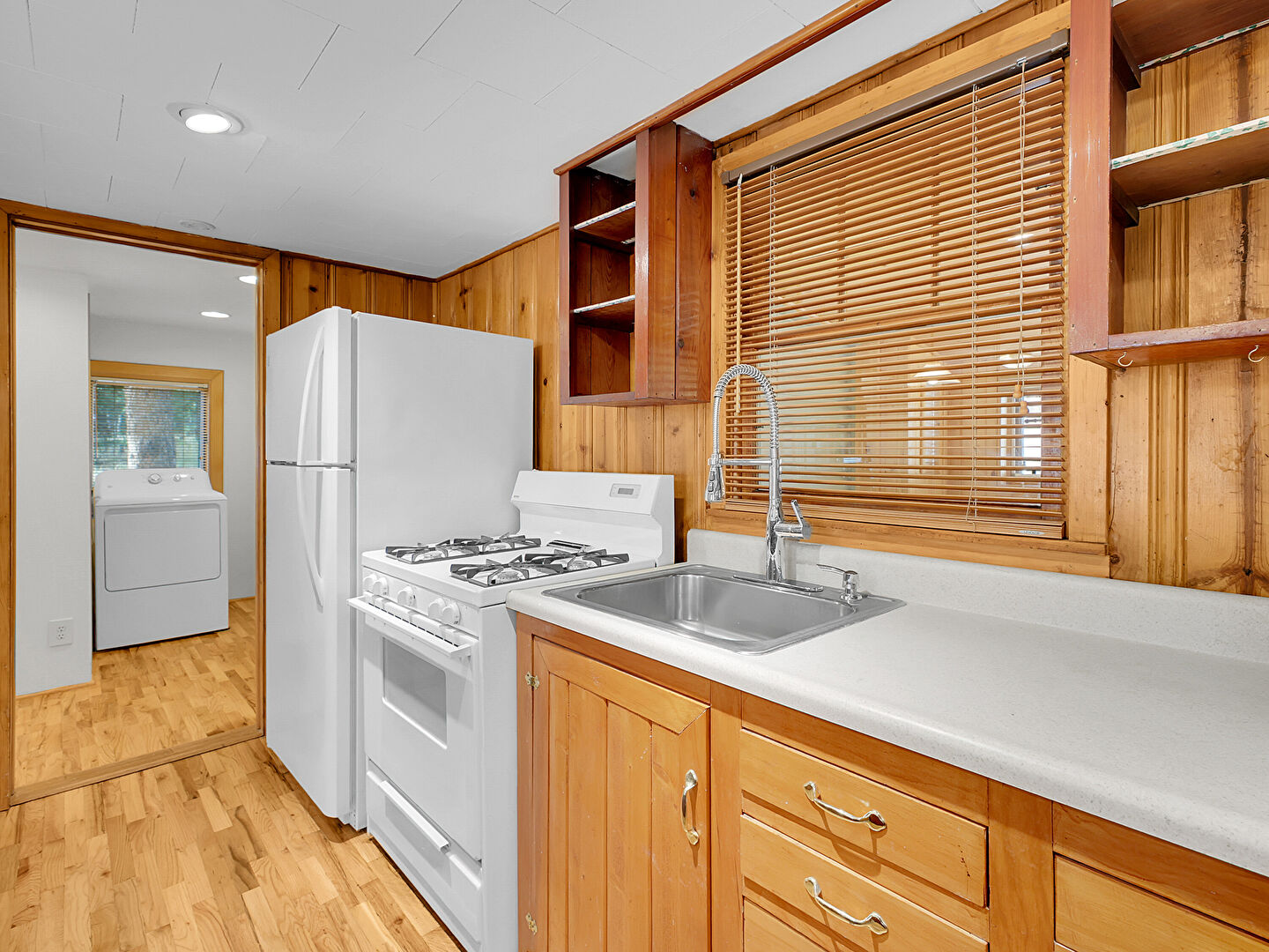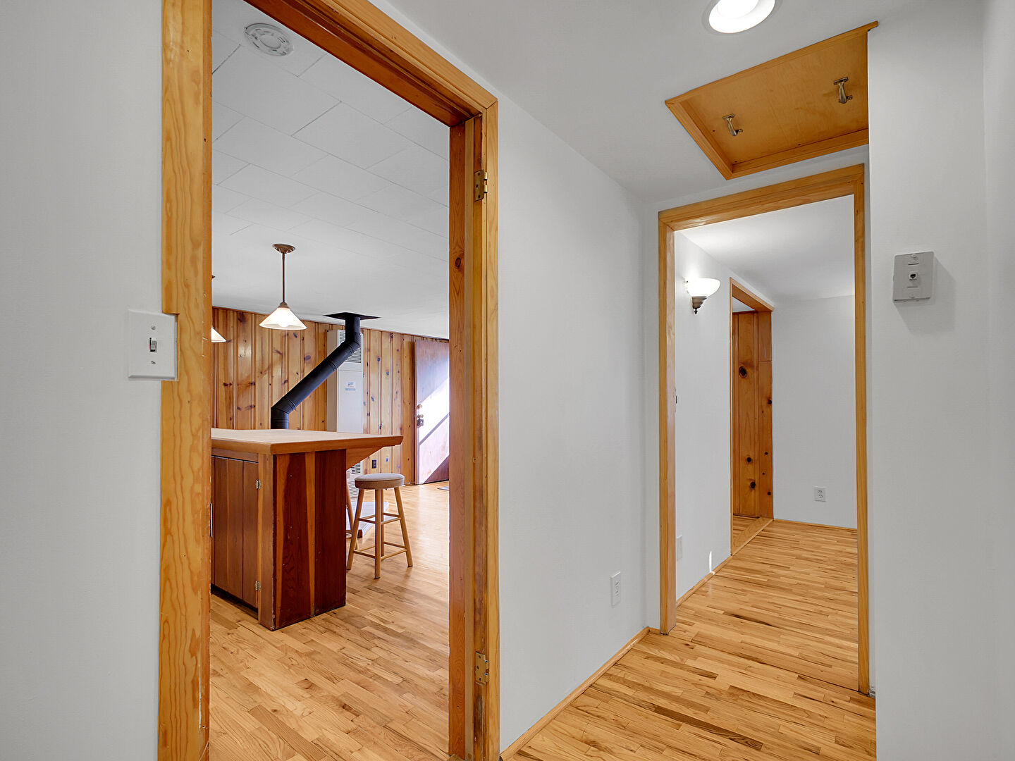 Basement, Kitchen Bar, Kitchen Island, Kitchen Peninsula, Laundry, Medium Brown Cabinets, Natural Light, One Wall Kitchen, Open Shelves, Pendant Lighting, Recessed Lighting, Tile Countertops, U Shaped Kitchen, Wall Furnace, Washer Dryer, Wood Finish Floor, Wood Stove, Wood Wall, Kitchen Bar, Laundry, Medium Brown Cabinets, Pendant Lighting, Tile Countertops, Wood Finish Floor, Wood Stove