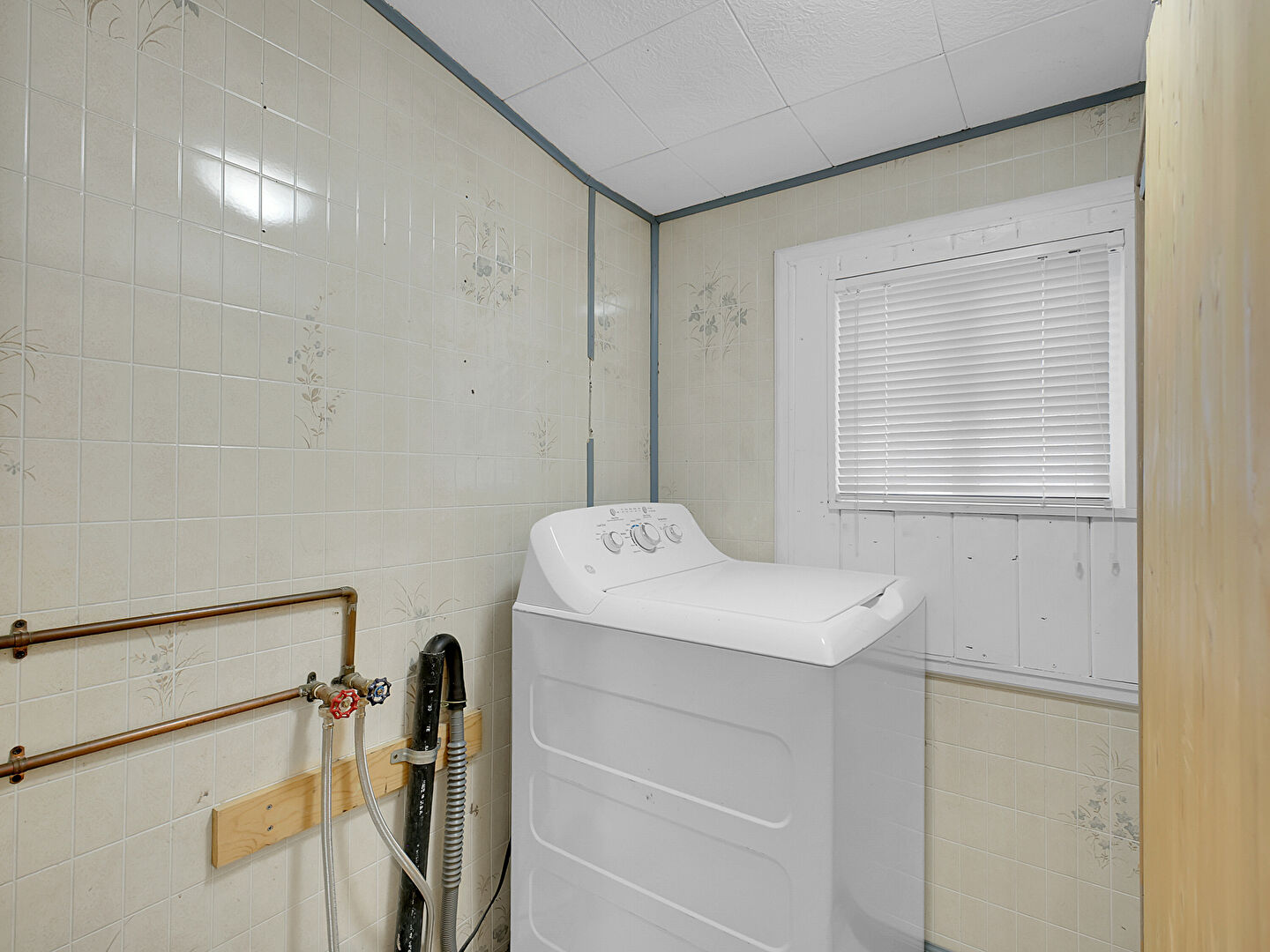 Baseboards Wall, Drop Ceiling, Drywall, Laundry, Natural Light, Recessed Lighting, Tile Wall, Washer Dryer, Wood Finish Floor, Laundry, Recessed Lighting, Washer Dryer