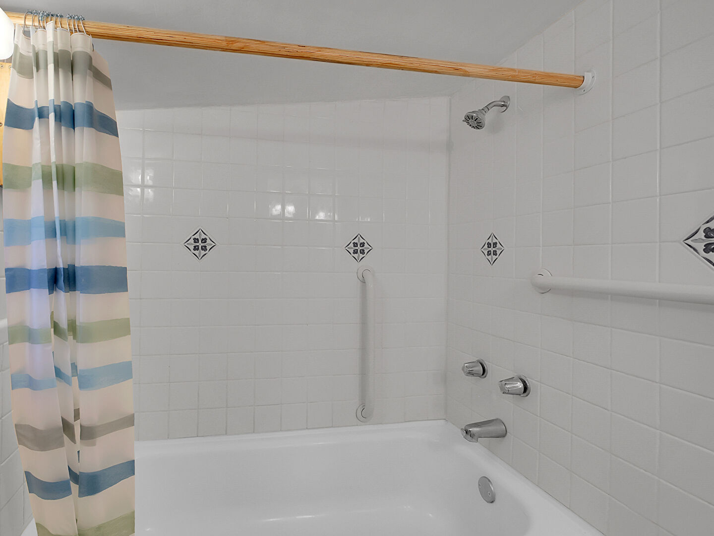 Basement, Combined Bath Shower, Drywall, Full Bathroom, Natural Light, Tile Floor, Tile Wall, Vanity, Vent, Combined Bath Shower, Vanity, Vaulted Ceiling
