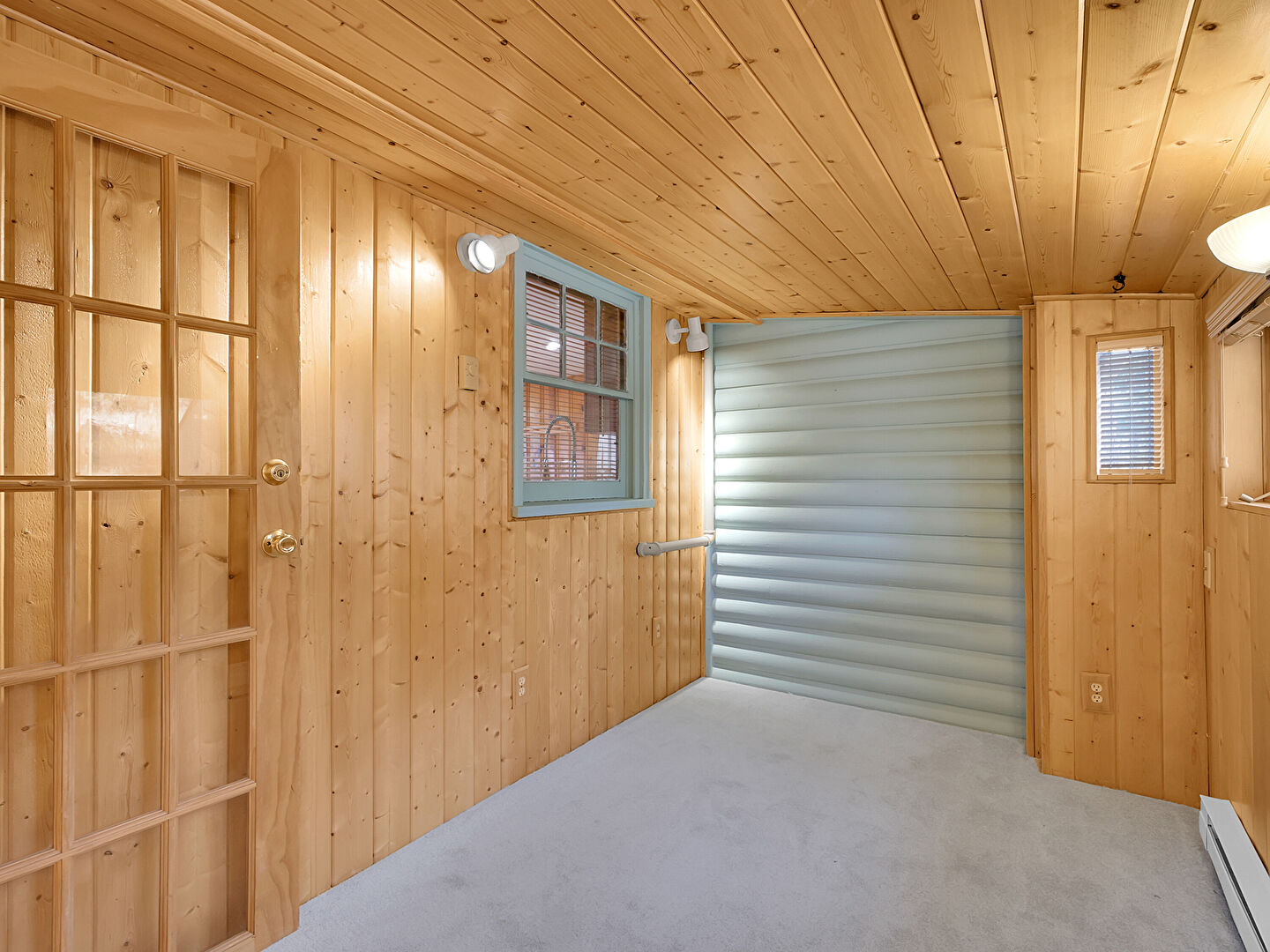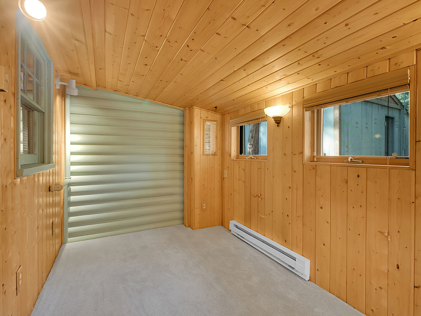 Baseboard Radiator, Baseboards Wall, Basement, Carpet, Closet, Drywall, Natural Light, Wall Furnace, Wood Ceiling, Wood Finish Floor, Wood Stove, Wood Wall, Baseboard Radiator, Drywall, Natural Light, Space Heater, Vaulted Ceiling, Wood Finish Floor, Wood Wall
