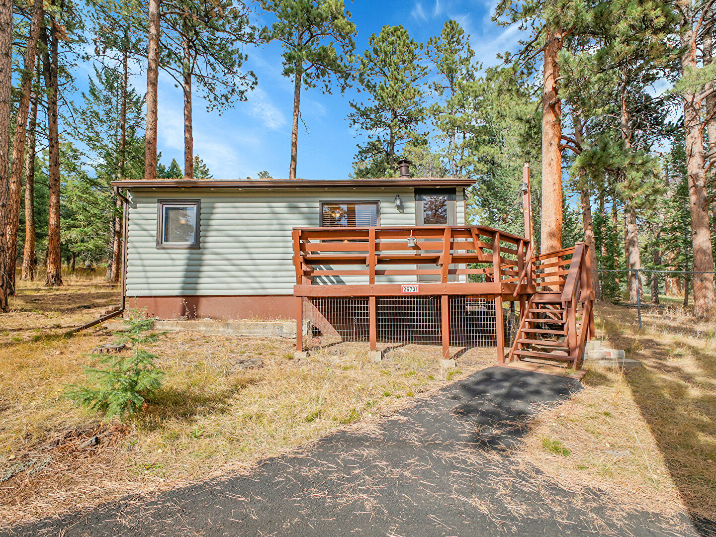 Concrete Foundation, Crawl Space, Deck, Downspout, Driveway, Fence, Forest View, Gutters, Horizontal Siding, Lawn, Parking Pad, Skirt, Stairs, Woods View, Concrete Foundation, Deck, Downspout, Horizontal Siding, Stairs, Woods View