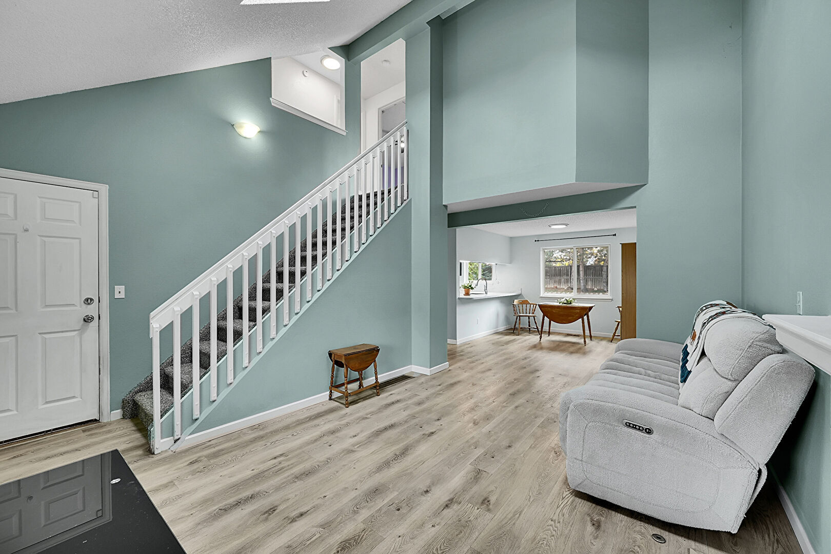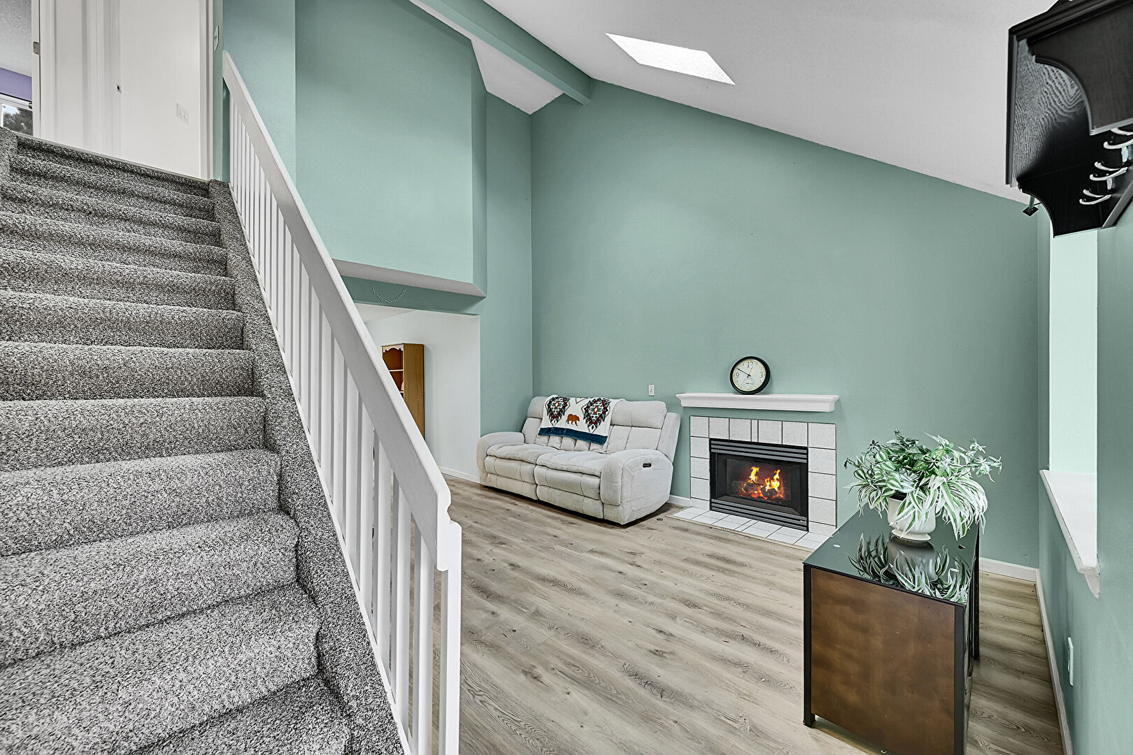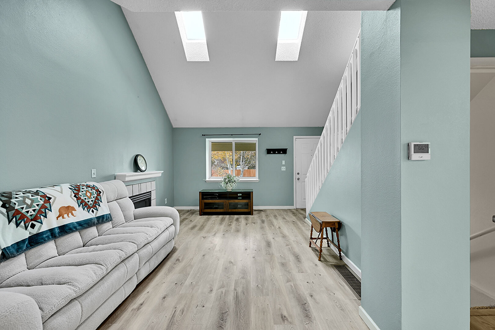 Baseboards Wall, Drywall, Fireplace, High Ceiling, Natural Light, Skylight, Stairs, Textured Ceiling, Vaulted Ceiling, Wood Finish Floor, Natural Light, Vaulted Ceiling