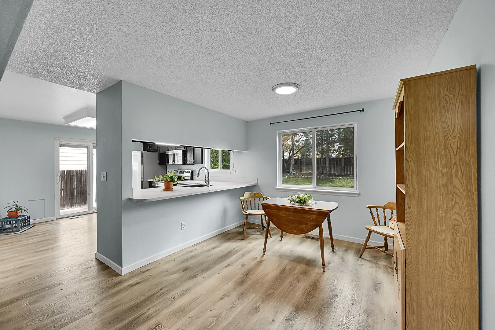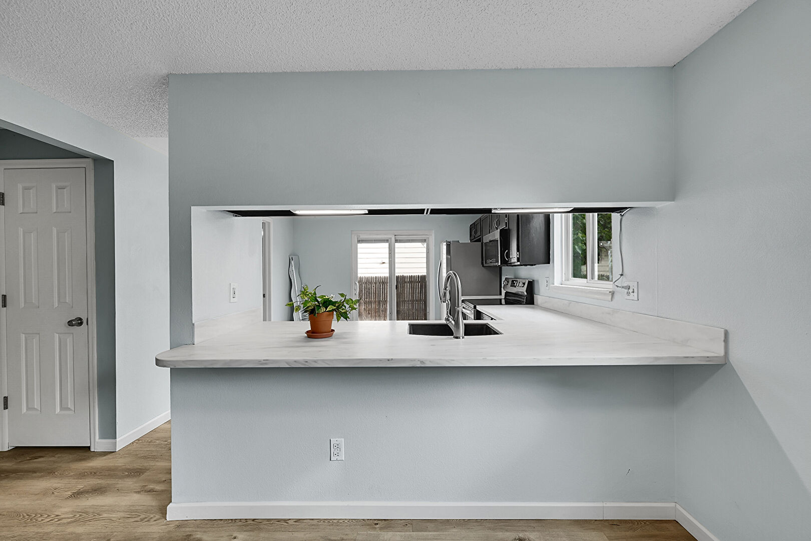 Baseboards Wall, Drywall, Kitchen Bar, Kitchen Peninsula, Natural Light, Textured Ceiling, U Shaped Kitchen, Wood Finish Floor, Drywall, Pass Through Window