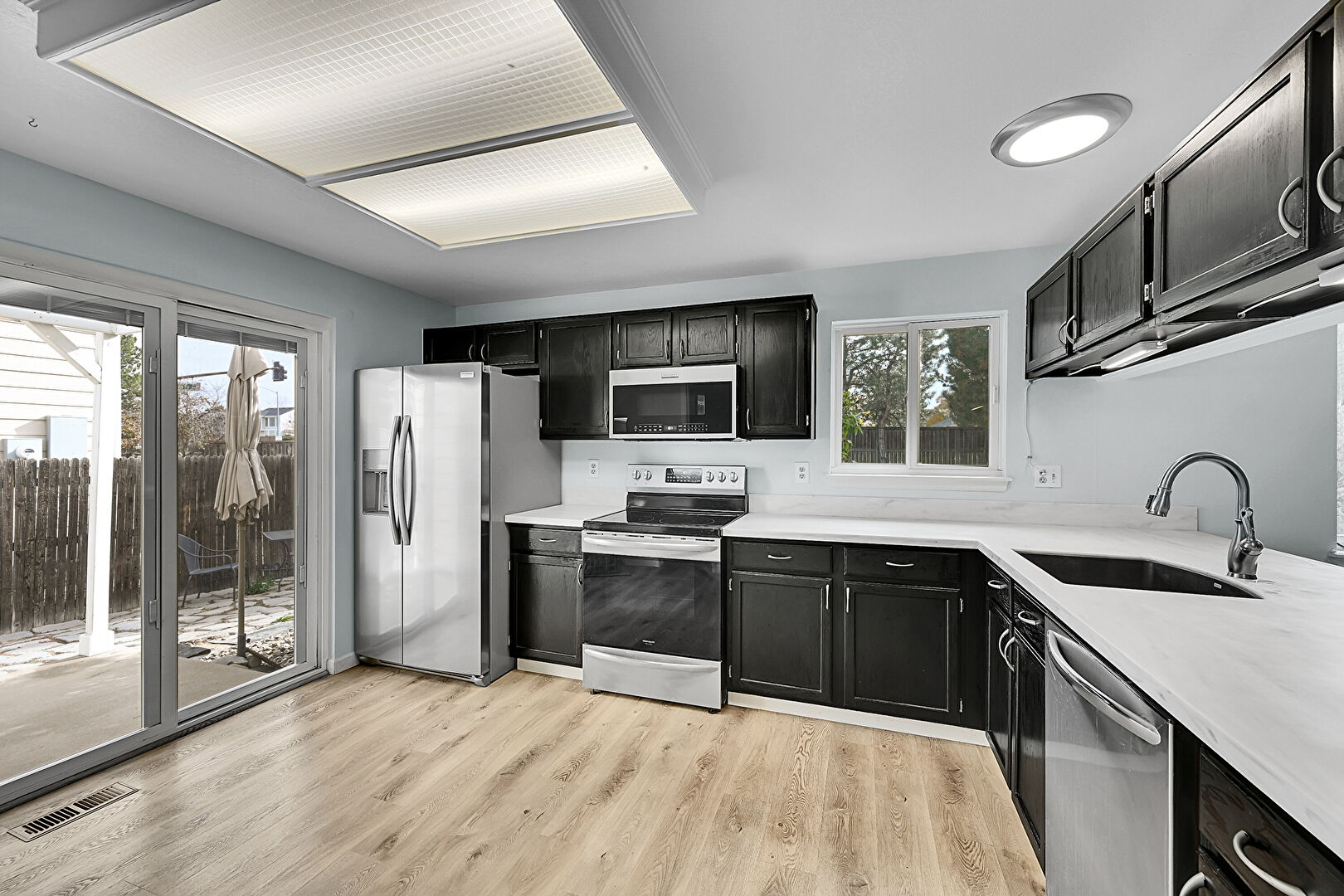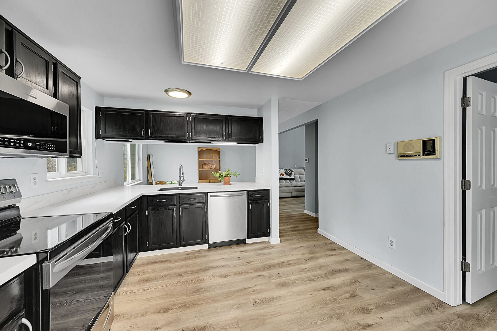 Baseboards Wall, Black Cabinets, Drywall, Kitchen Bar, Kitchen Peninsula, Natural Light, Pass Through Window, Shaker Cabinets, Stone Countertops, Textured Ceiling, Vent, Visible Hinge Cabinets, Wood Finish Floor, L Shaped Kitchen, Pass Through Window, Wood Finish Floor