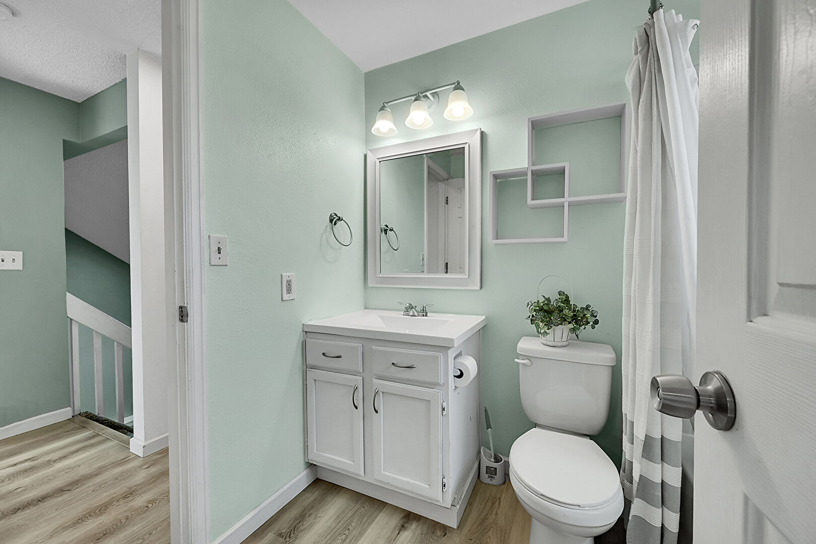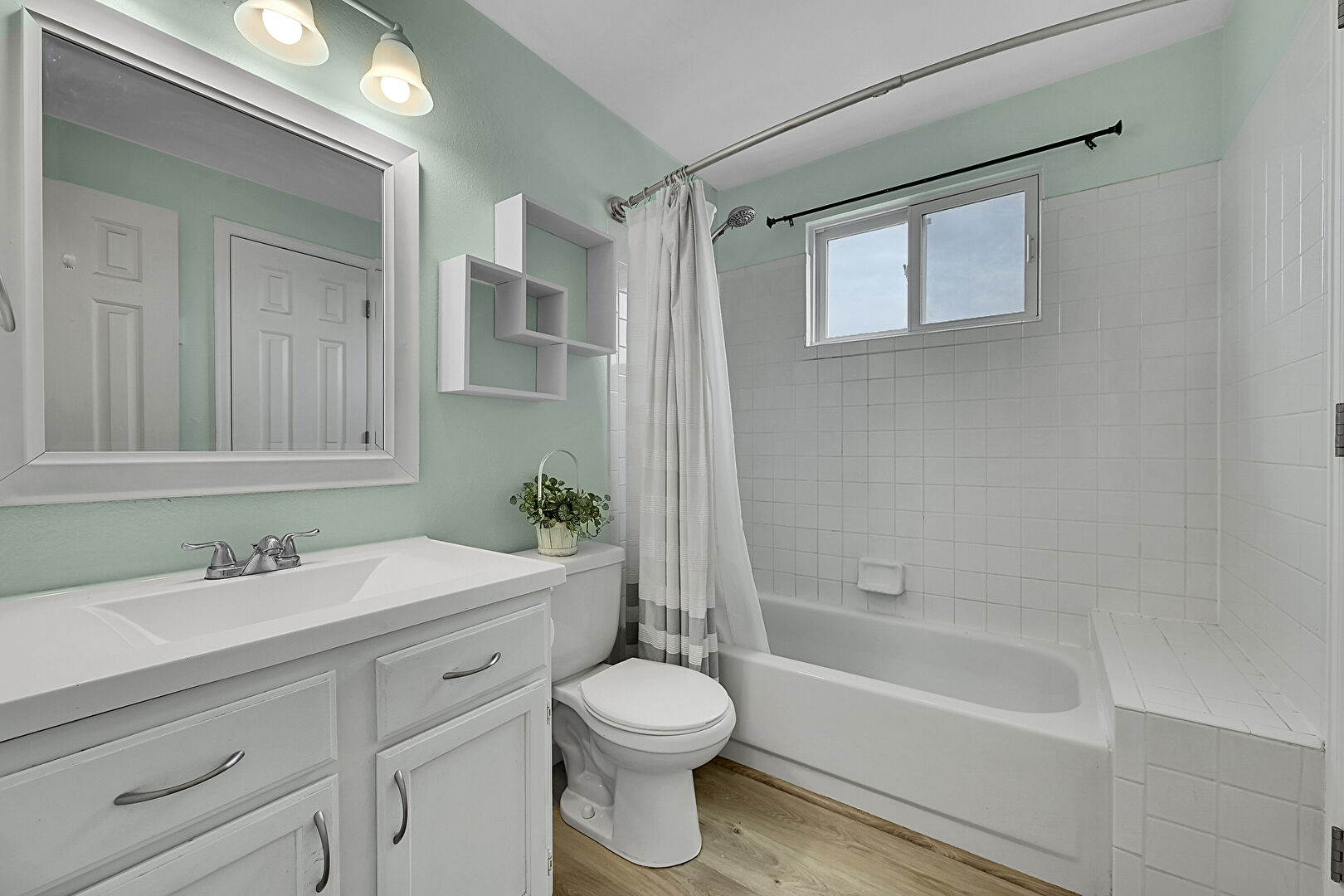 Combined Bath Shower, Drywall, Full Bathroom, Natural Light, Vanity, Wood Finish Floor, Baseboards Wall, Wood Finish Floor