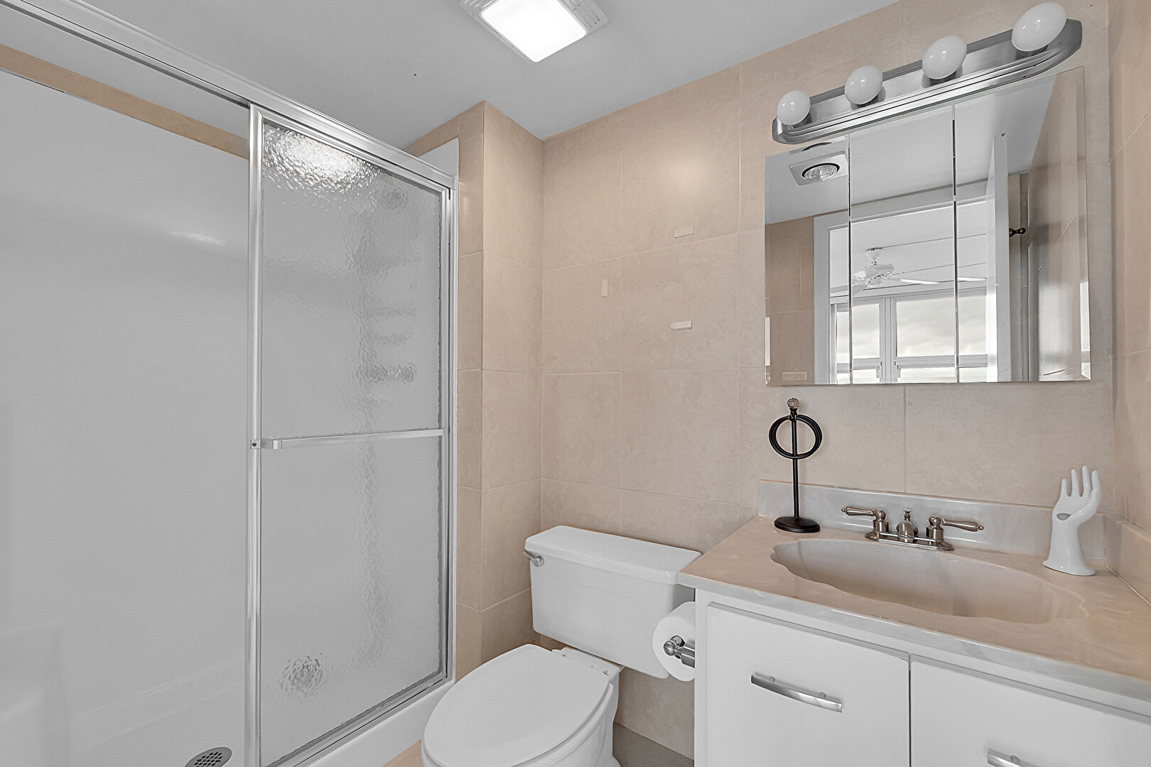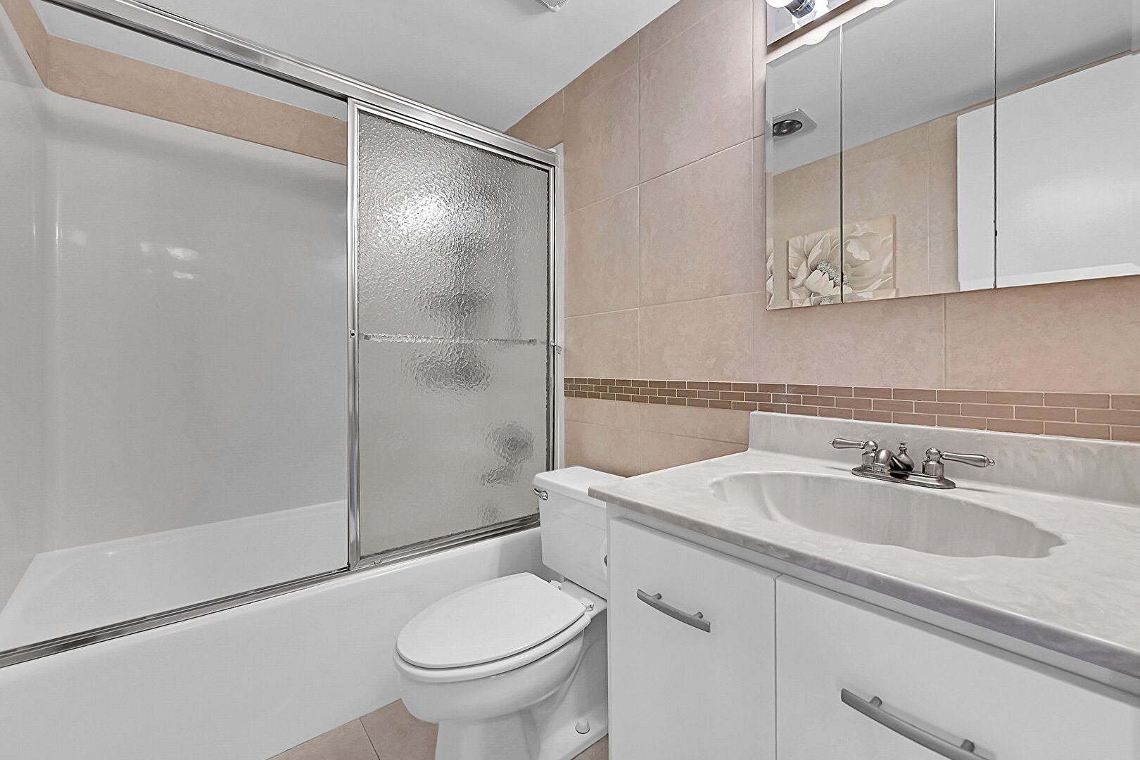 Combined Bath Shower,  Full Bathroom,  Tile Floor,  Tile Wall,  Vanity, Tile Wall, Vent