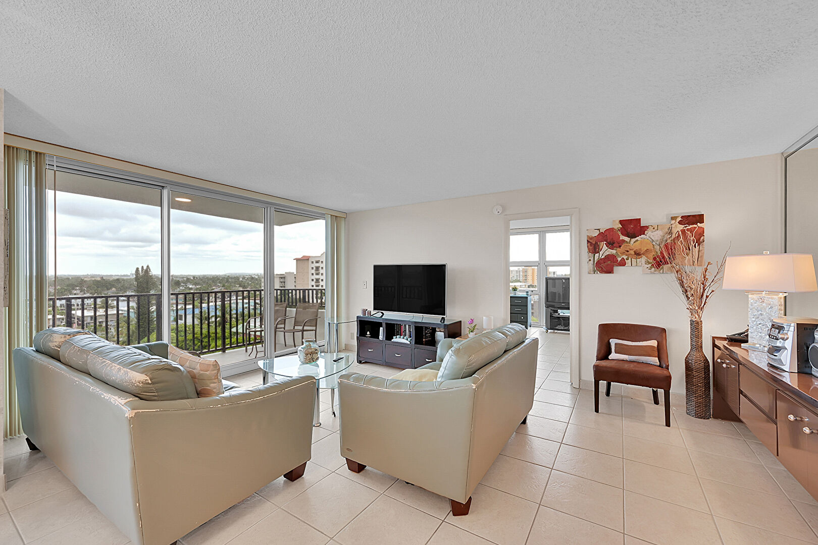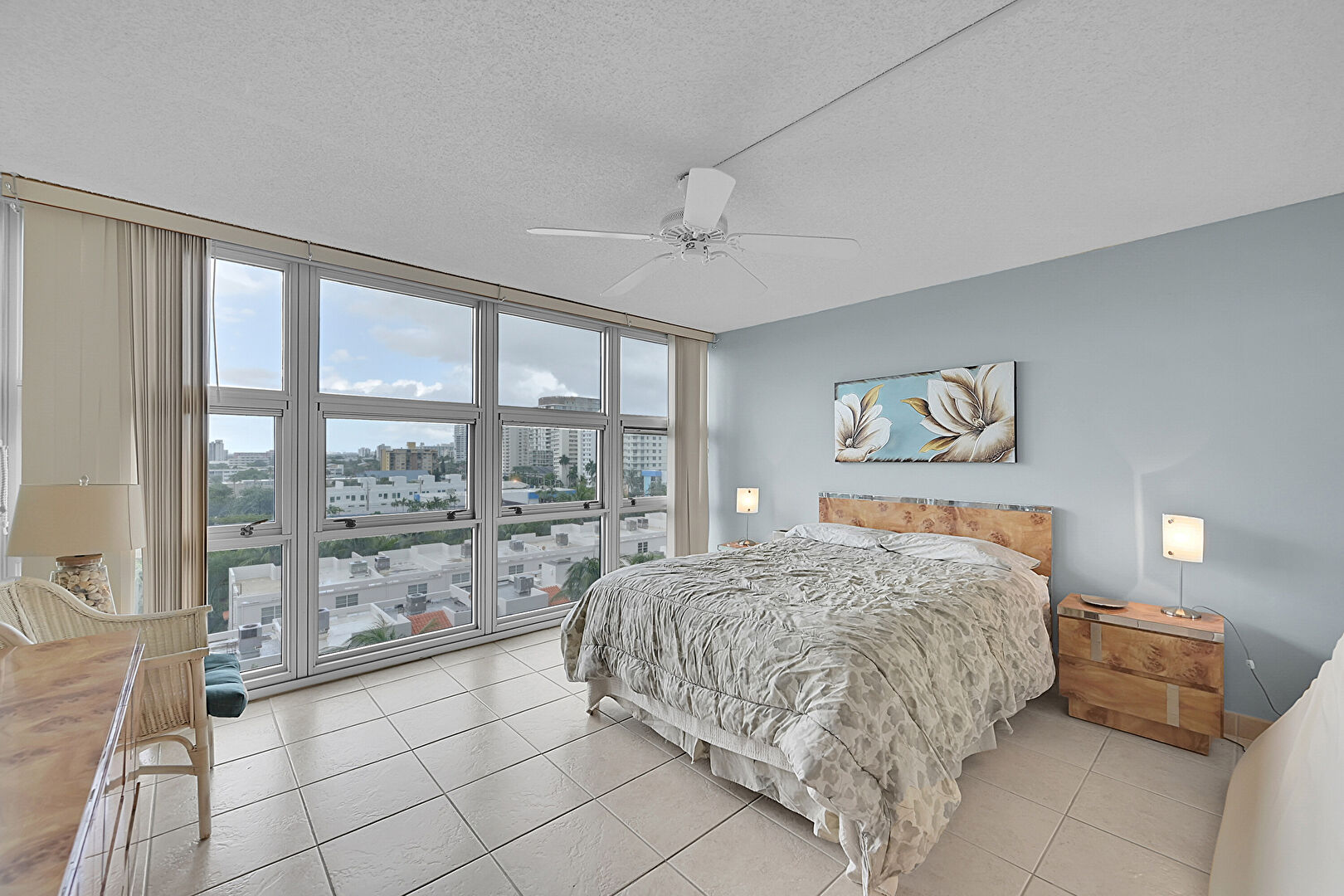 Ceiling Fan,  City View,  Drywall,  Floor Ceiling Windows,  Natural Light,  Textured Ceiling,  Tile Floor,  Vent, Drywall, Tile Floor