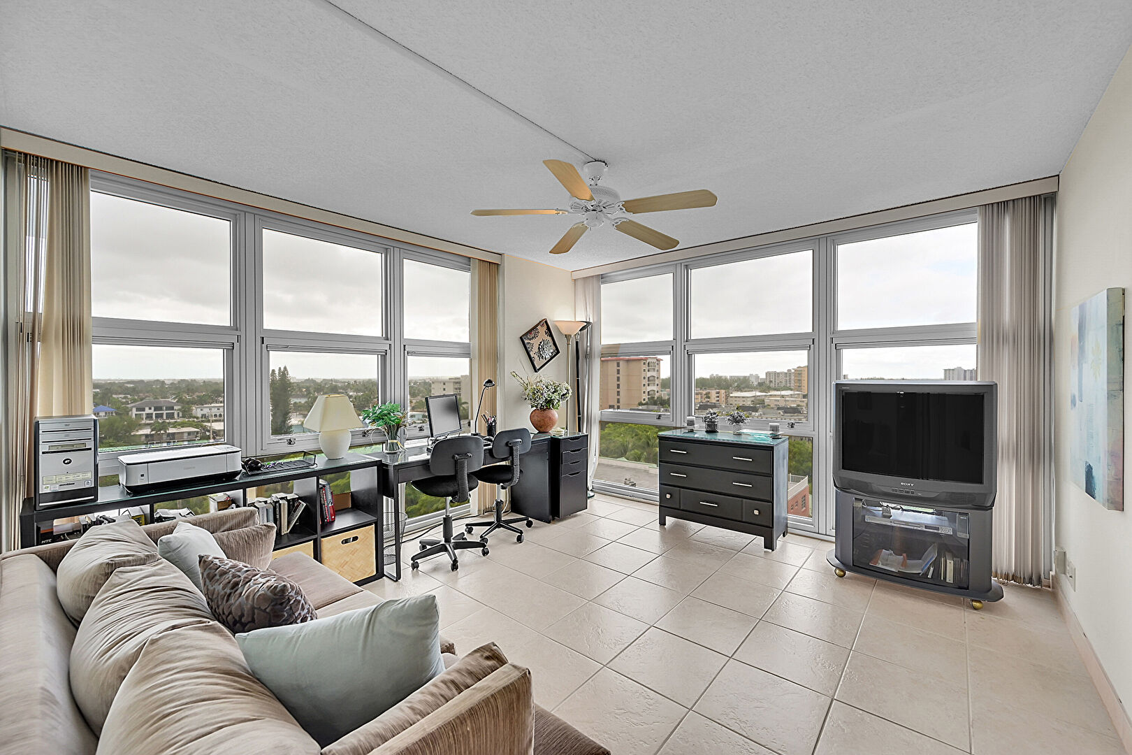 Baseboards Wall,  Ceiling Fan,  Drywall,  Floor Ceiling Windows,  Natural Light,  Office Area,  Textured Ceiling,  Tile Floor, Baseboards Wall, Floor Ceiling Windows, Office Area
