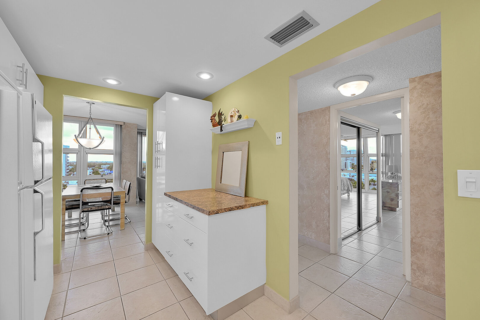 Baseboards Wall,  Drywall,  Flat Panel Cabinets,  Natural Light,  Recessed Lighting,  Stone Countertops,  Textured Ceiling,  Tile Floor,  Vent, Recessed Lighting, Vent