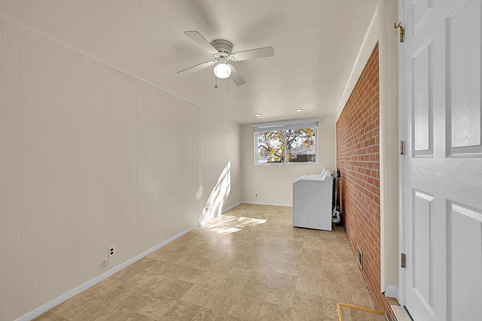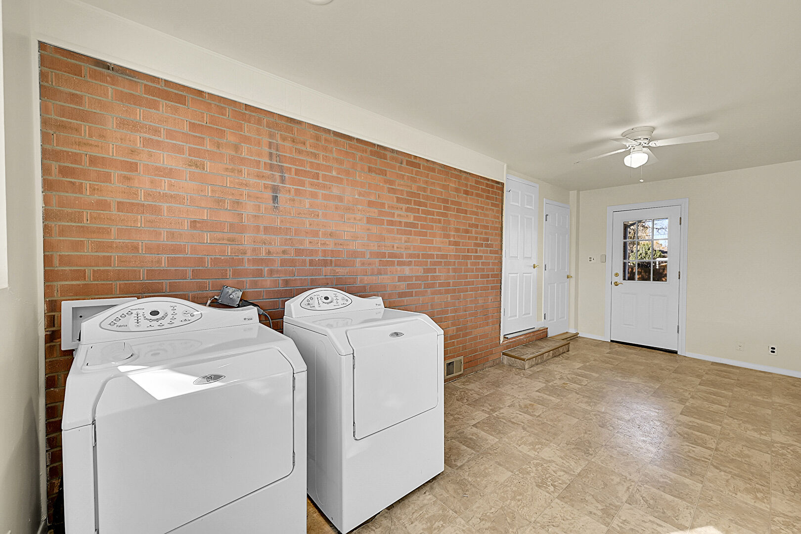 Baseboards Wall, Brick Wall, Ceiling Fan, Drywall, Laundry, Natural Light, Vent, Washer Dryer, Washer Hookup, Baseboards Wall, Ceiling Fan